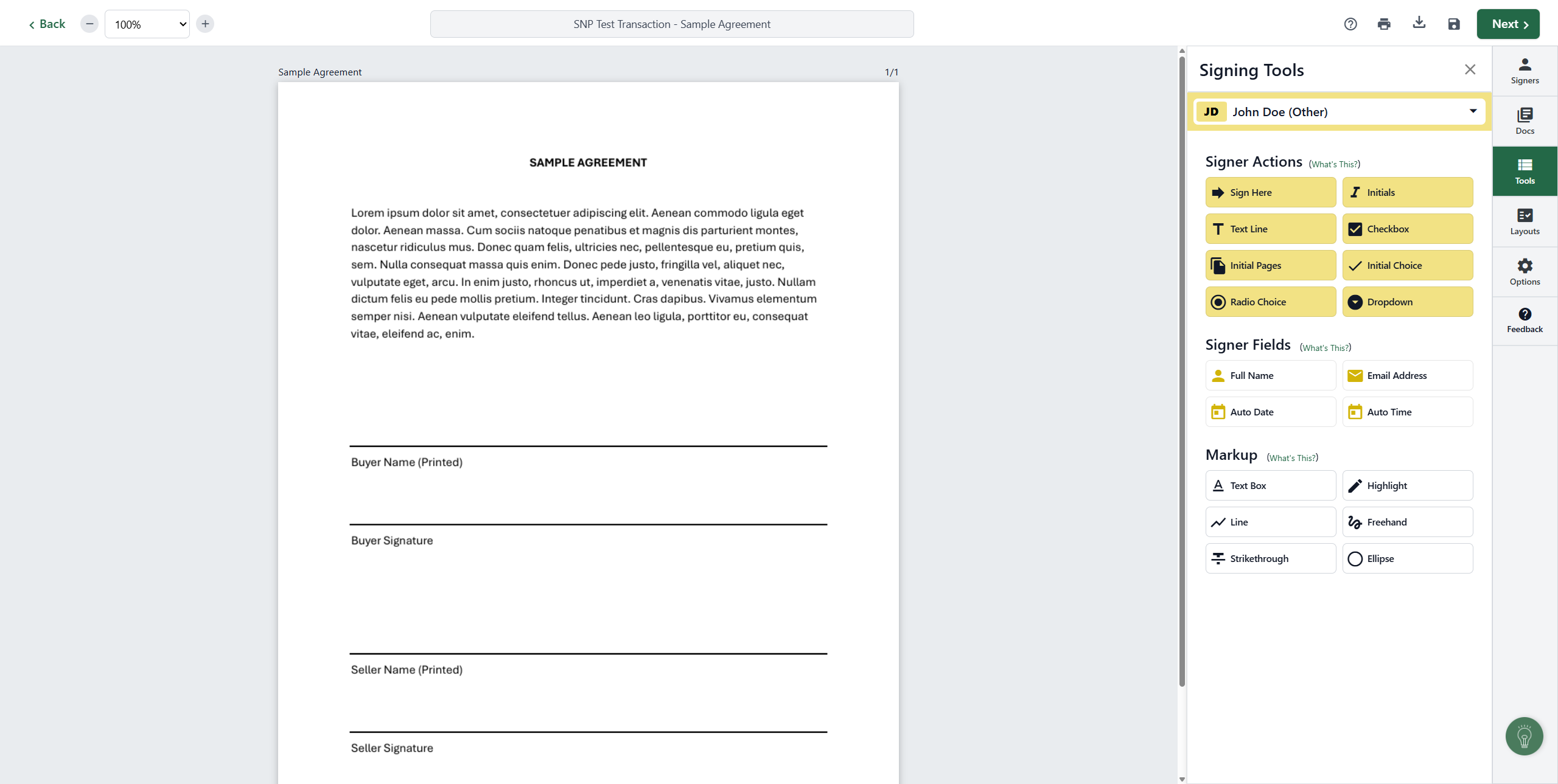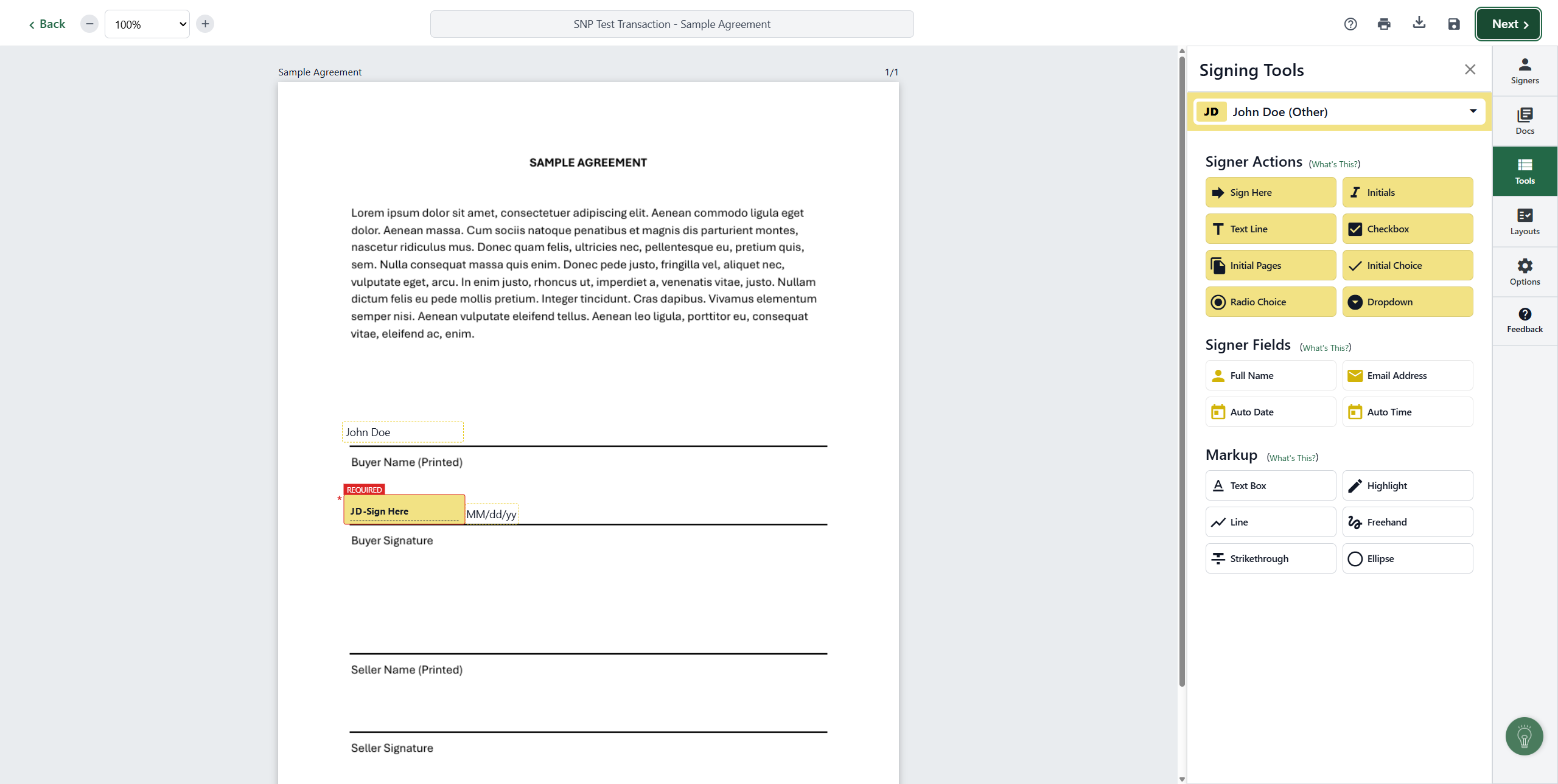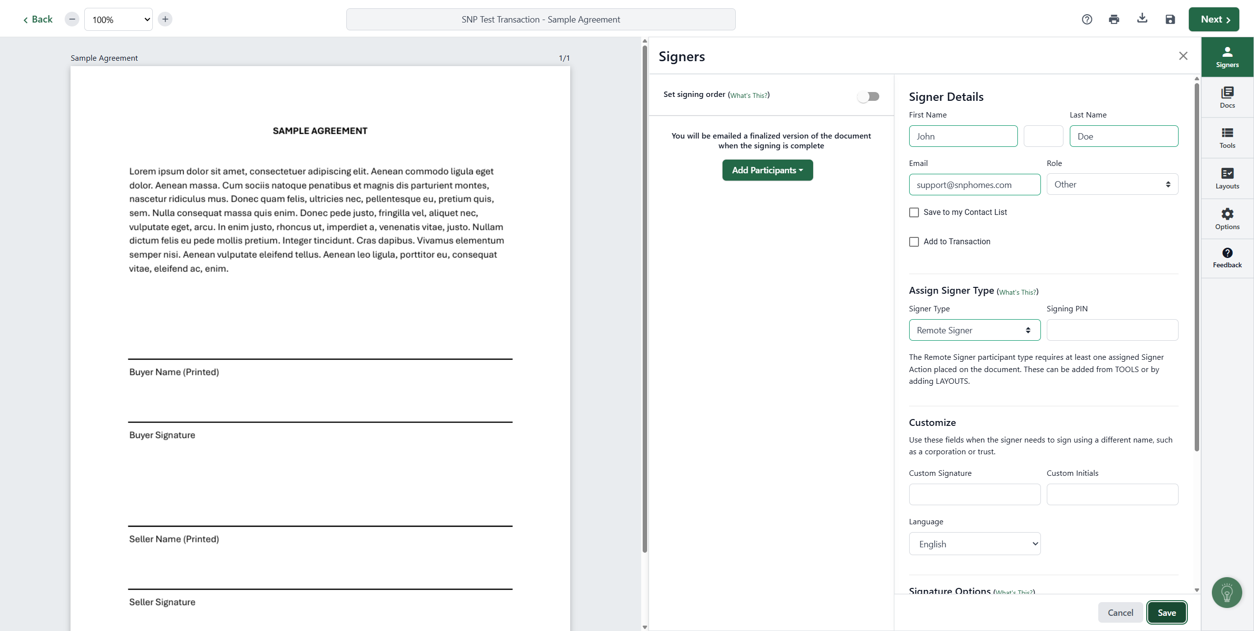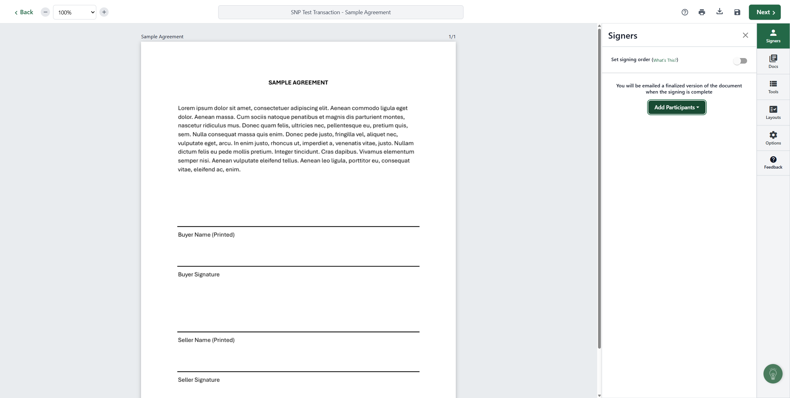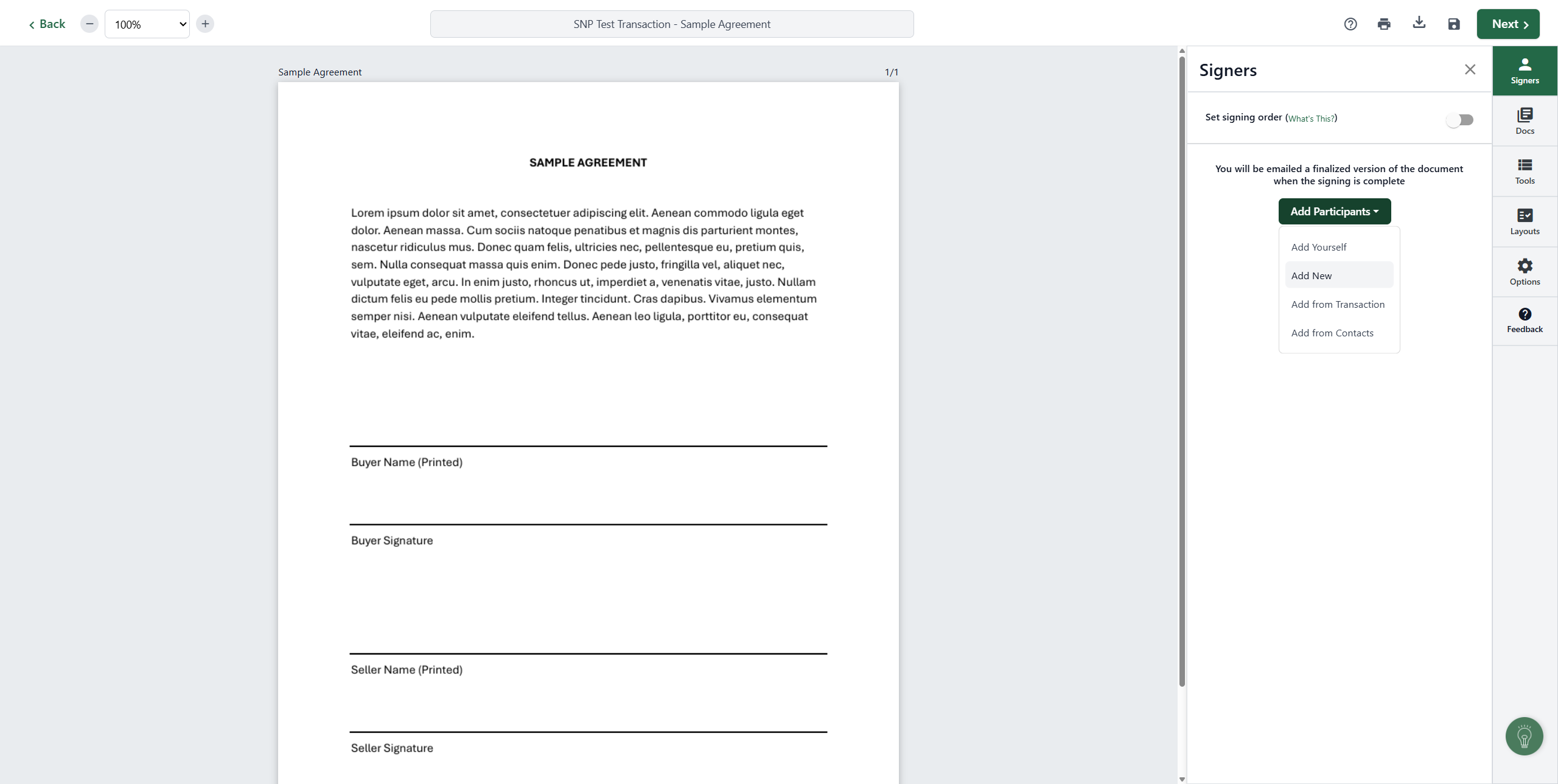 First, we will add our signers. I'm conducting a test by clicking on "Add Participants" and then "Add New."