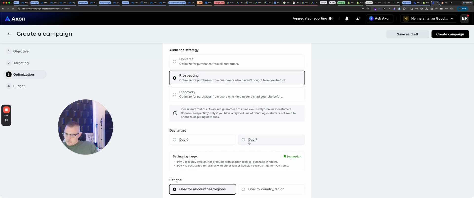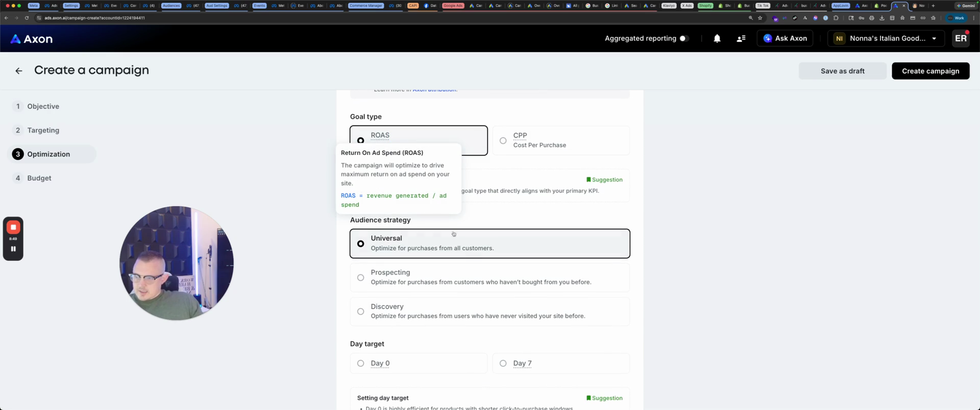 ROAS or cost per purchase. Next, for audience strategy, we will focus on prospecting to reach new people on day seven.