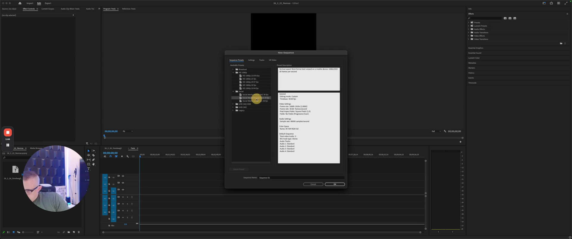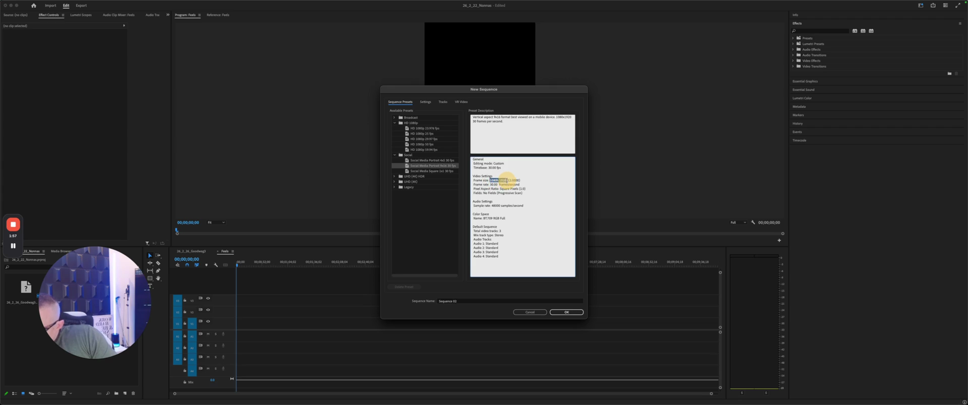 That's 720 wide by 1280 tall, or 1080 wide by 1920 tall. We are going to create a sequence. Sometimes, you receive a video that looks like a reel but isn't. Here, we will make this sequence. You can't actually see. Delete that. This is an old one.