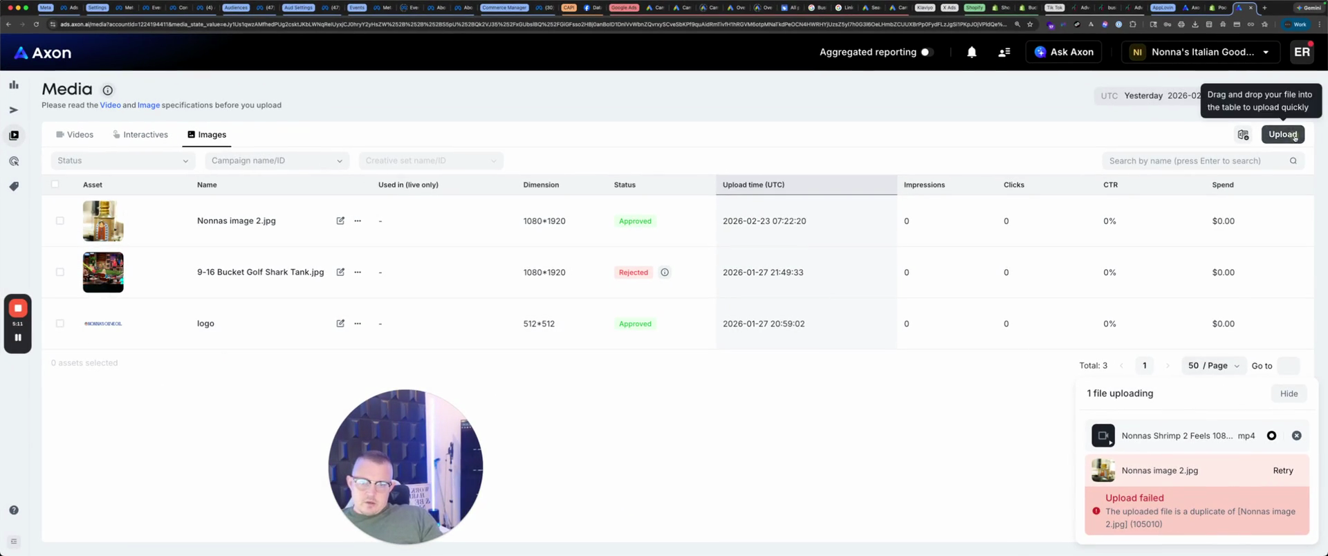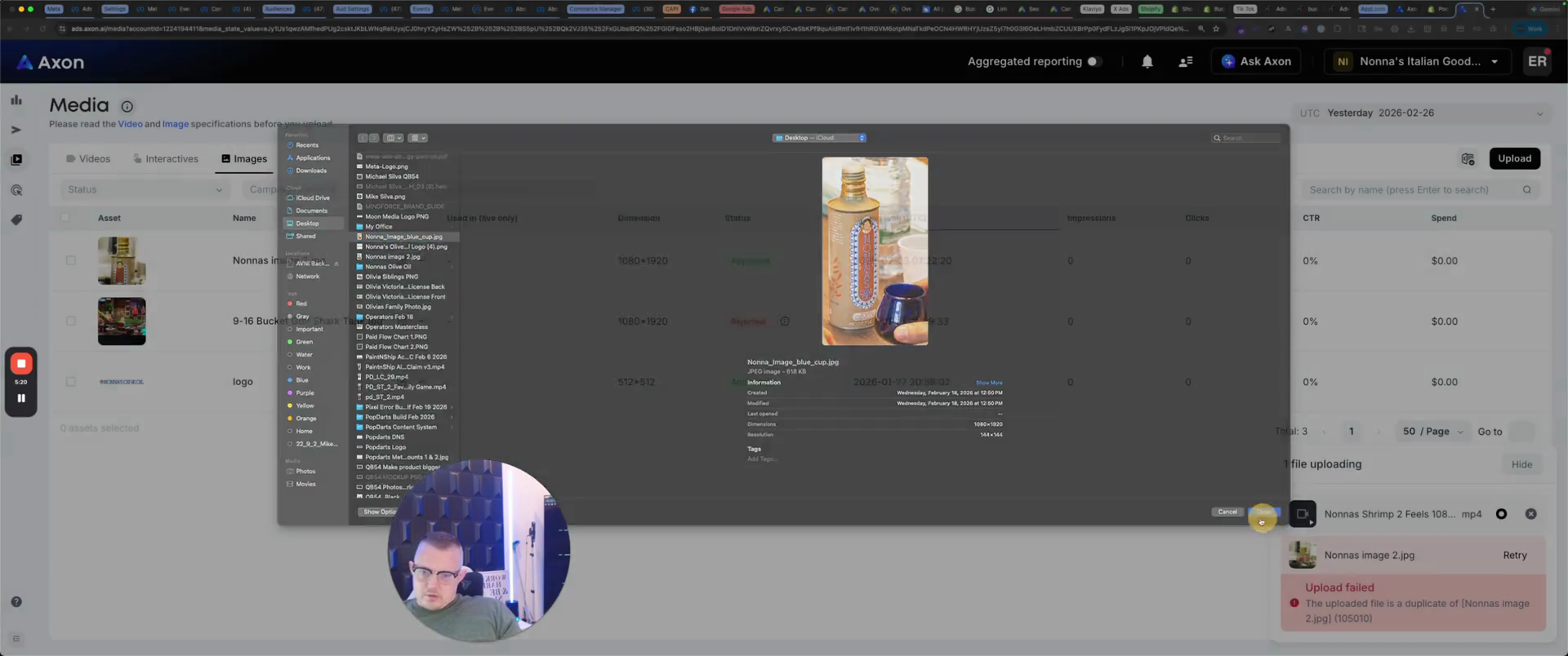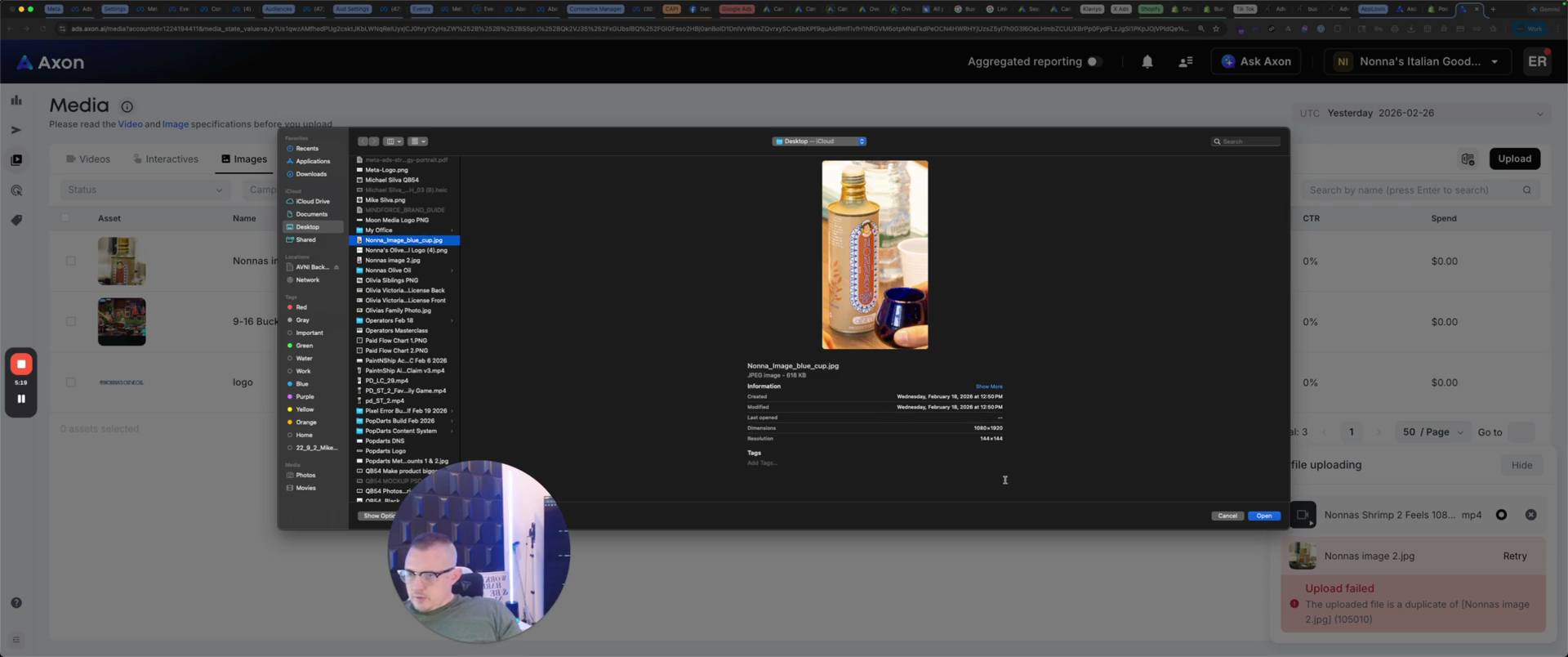 You'll see that the upload fails. It's a duplicate because I've already done it. That one is already here. Let's see if I have another one. Nona image blue cup. Let's check if I uploaded that.