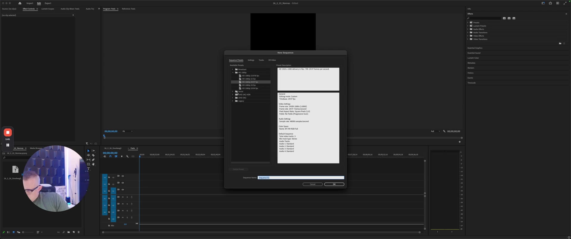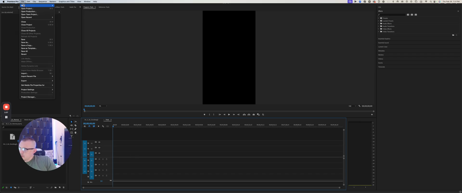 We're going to select File, then New, and choose Sequence.
