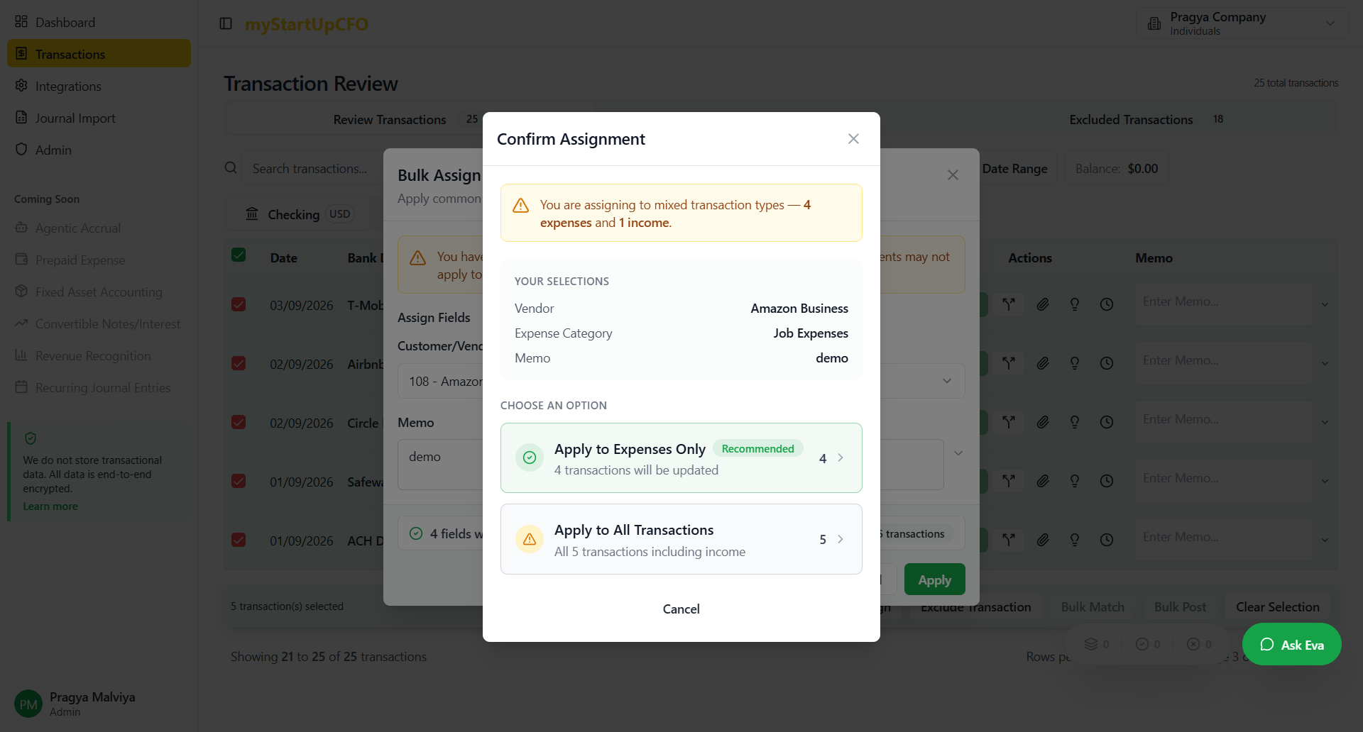 In this guide, you will learn how to bulk assign transaction details for efficient data management. This feature allows you to select multiple transactions simultaneously and apply common attributes such as customer, vendor, category, and memo. You can configure the bulk assignment to apply exclusively to expense transactions or to all selected transactions, providing flexibility based on your workflow requirements.