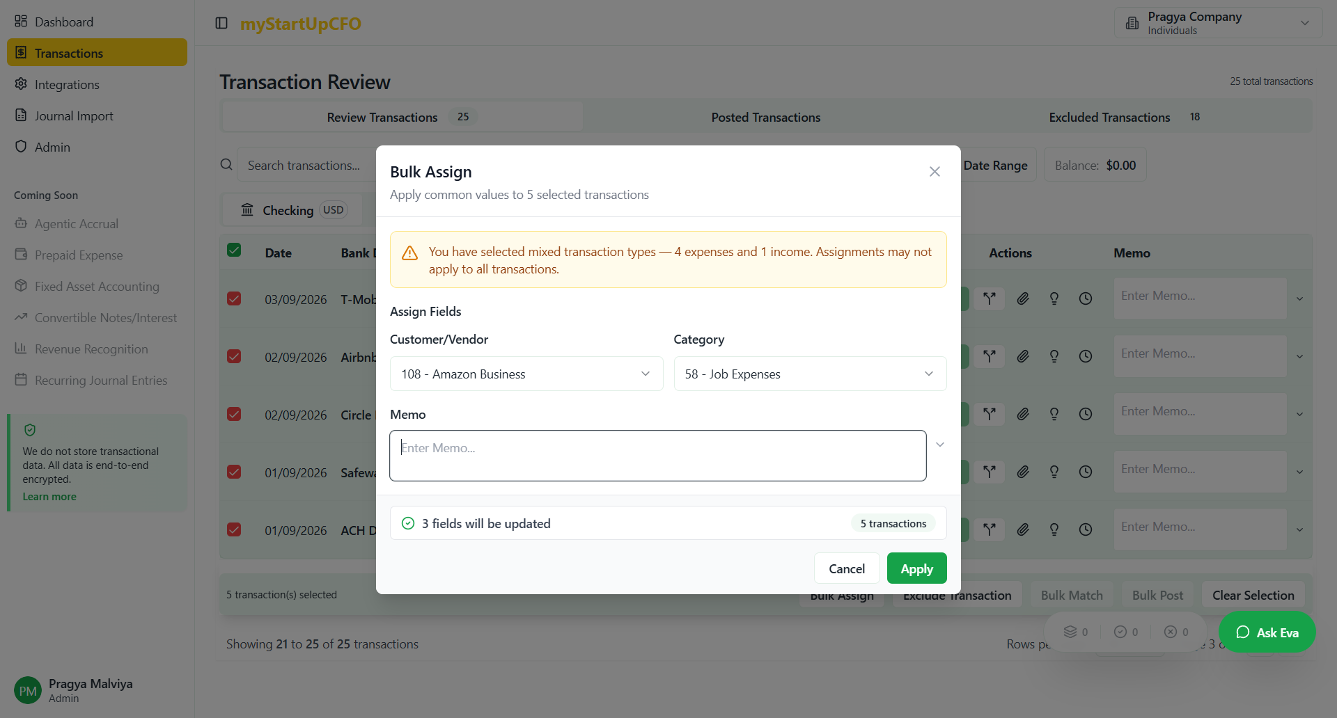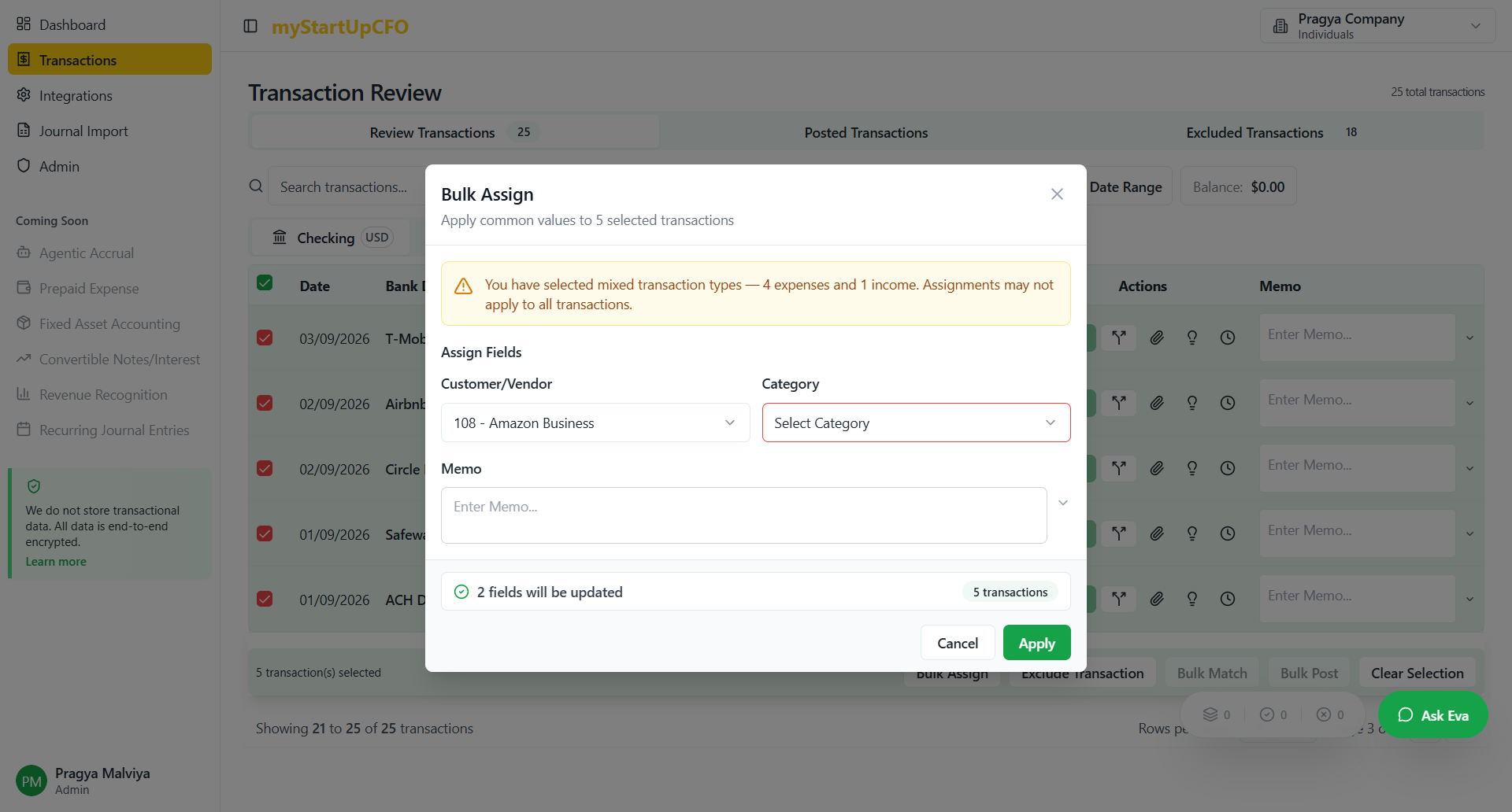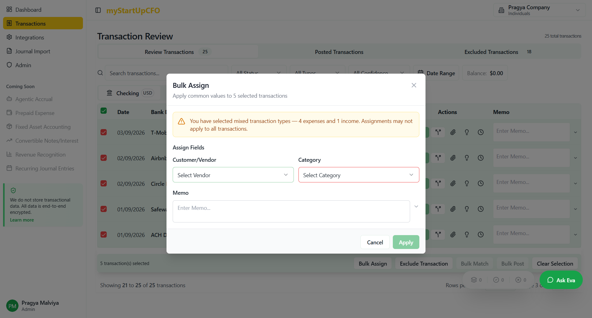 Learn how to efficiently bulk assign transactions, including selecting customers, vendors, categories, and memos. Follow this step-by-step guide to streamline your transaction management process.