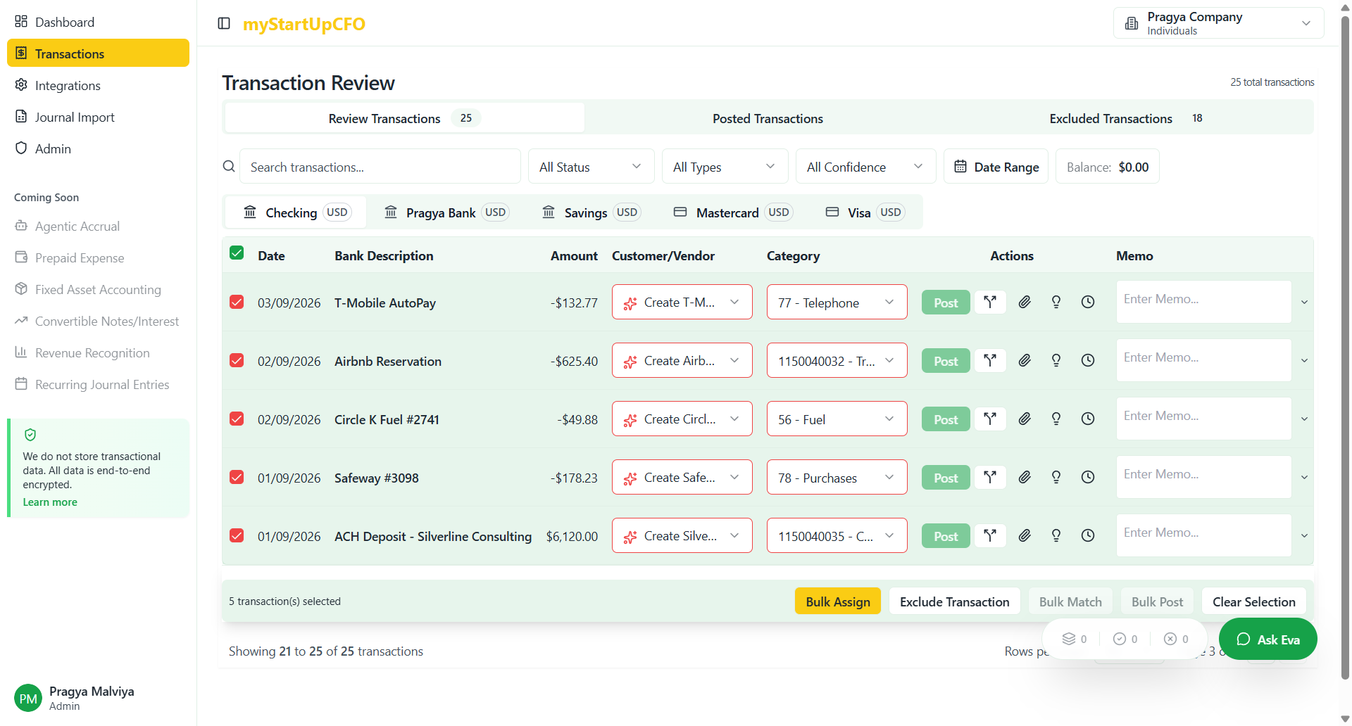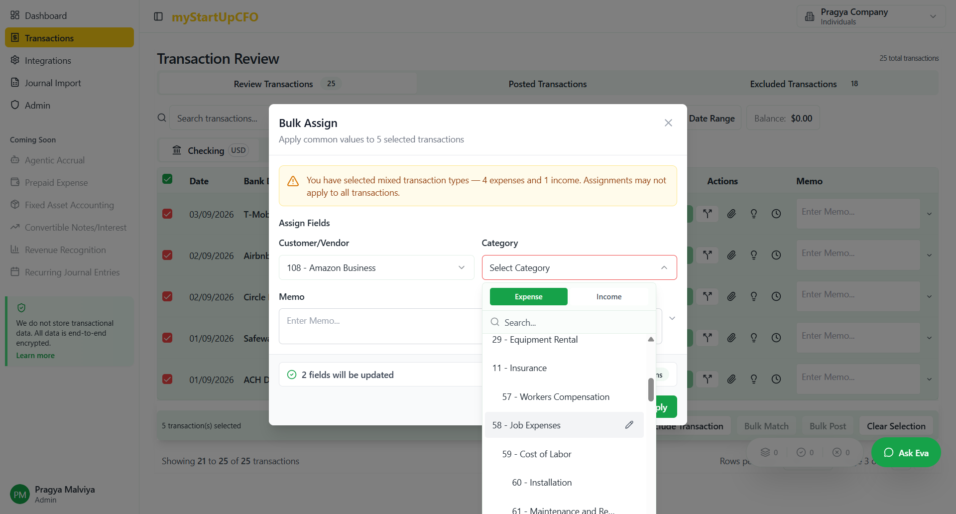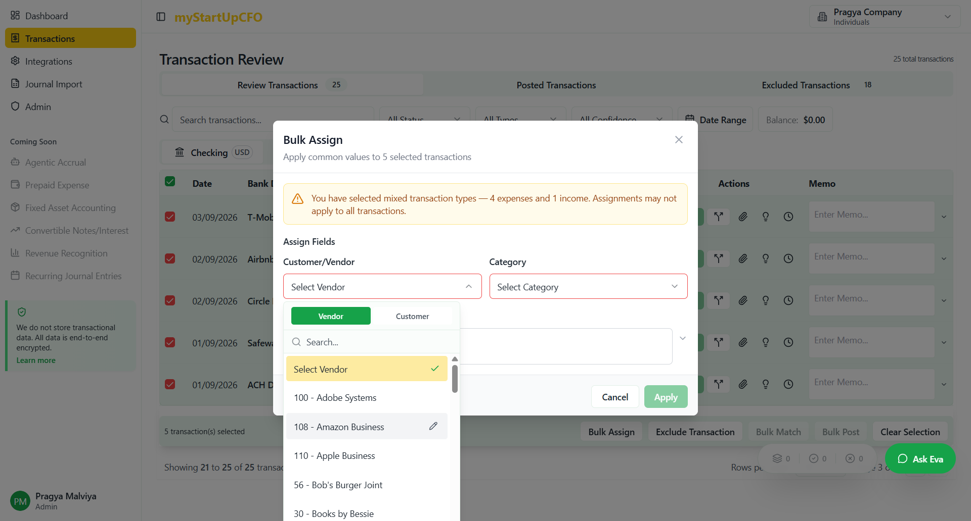 Learn how to efficiently bulk assign transactions, including selecting customers, vendors, categories, and memos. Follow this step-by-step guide to streamline your transaction management process.