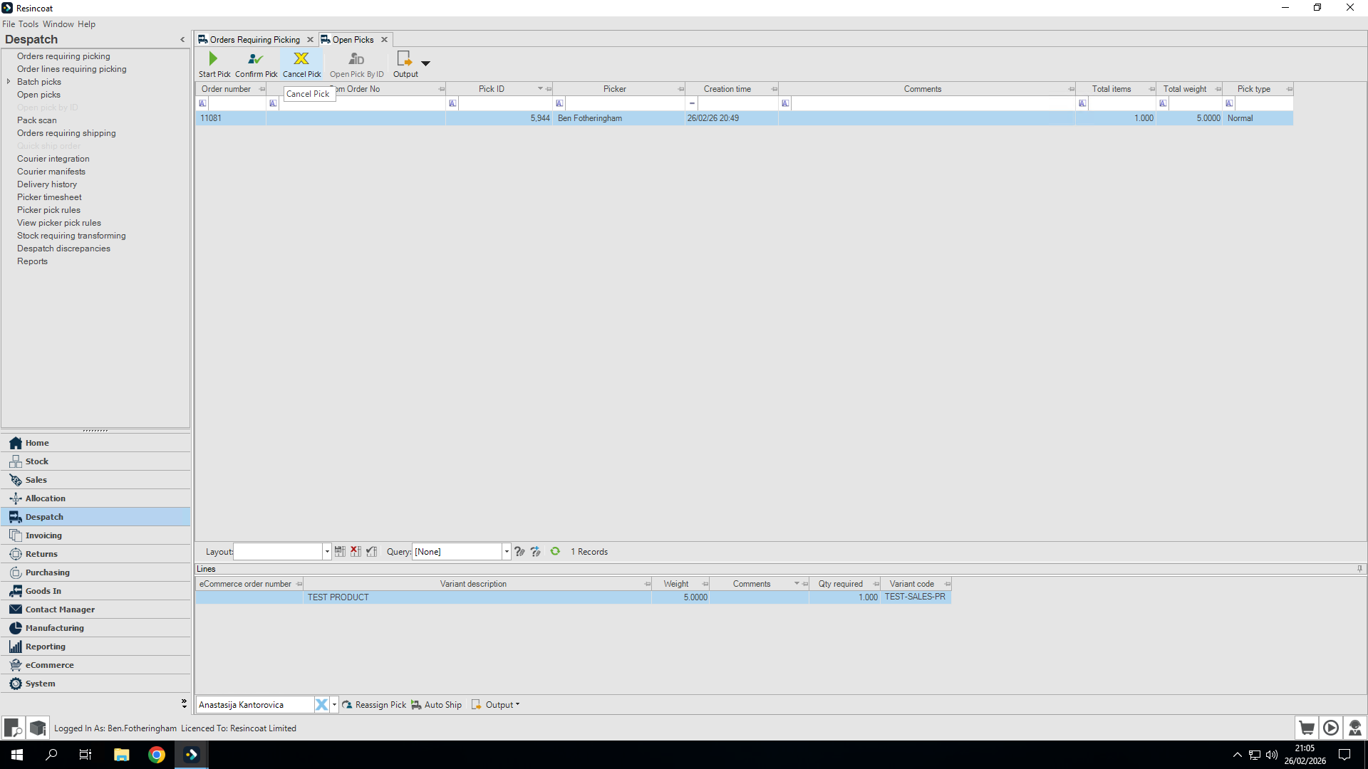 Click Yes to cancel. This will return the order to the "Orders Require Picking" screen.