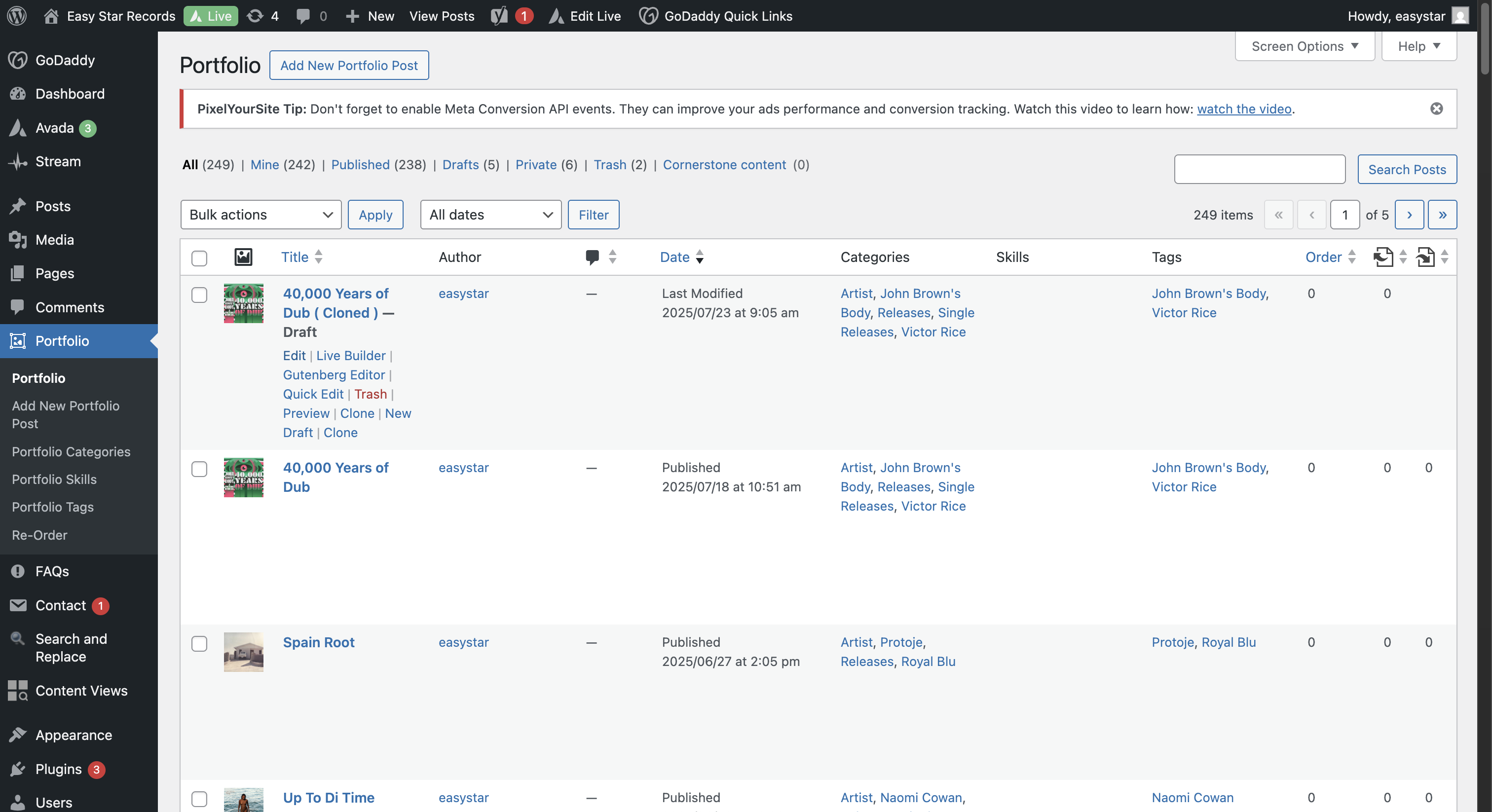 We will create a new release page by navigating to the EasyStar WordPress. We will log in at https://easystar.com/wp-login. Next, go to Portfolio on the left sidebar. Duplicate the most recent entry by hovering over it and clicking the Clone button.