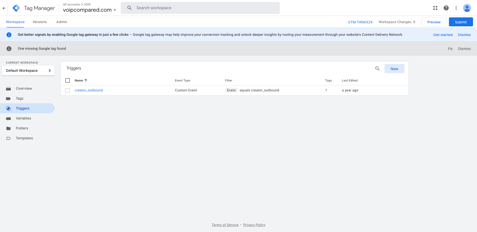 We want to create a trigger that activates every time someone clicks on outbound. To do this, go to one of the projects where you want to create the trigger. I'll use Web Compare as an example.