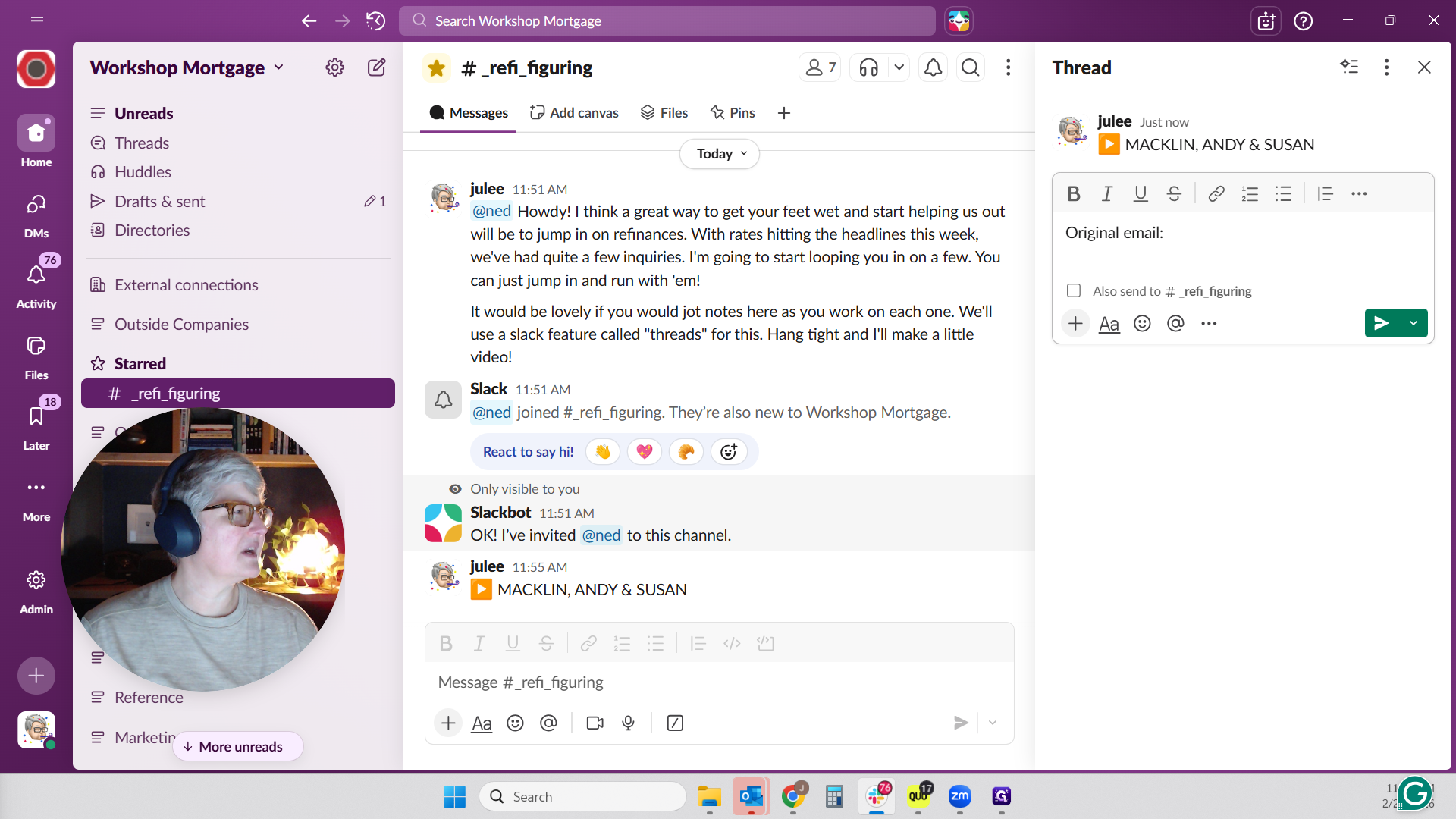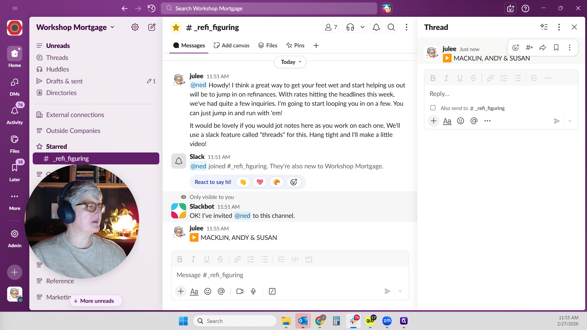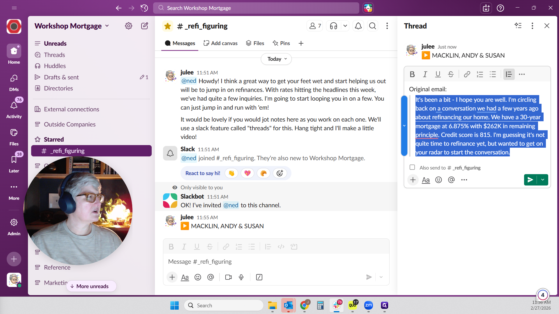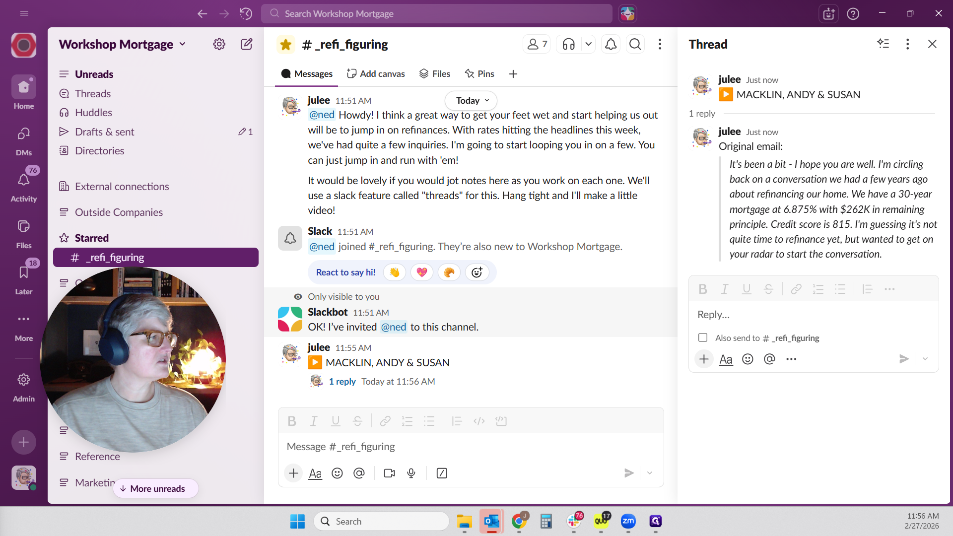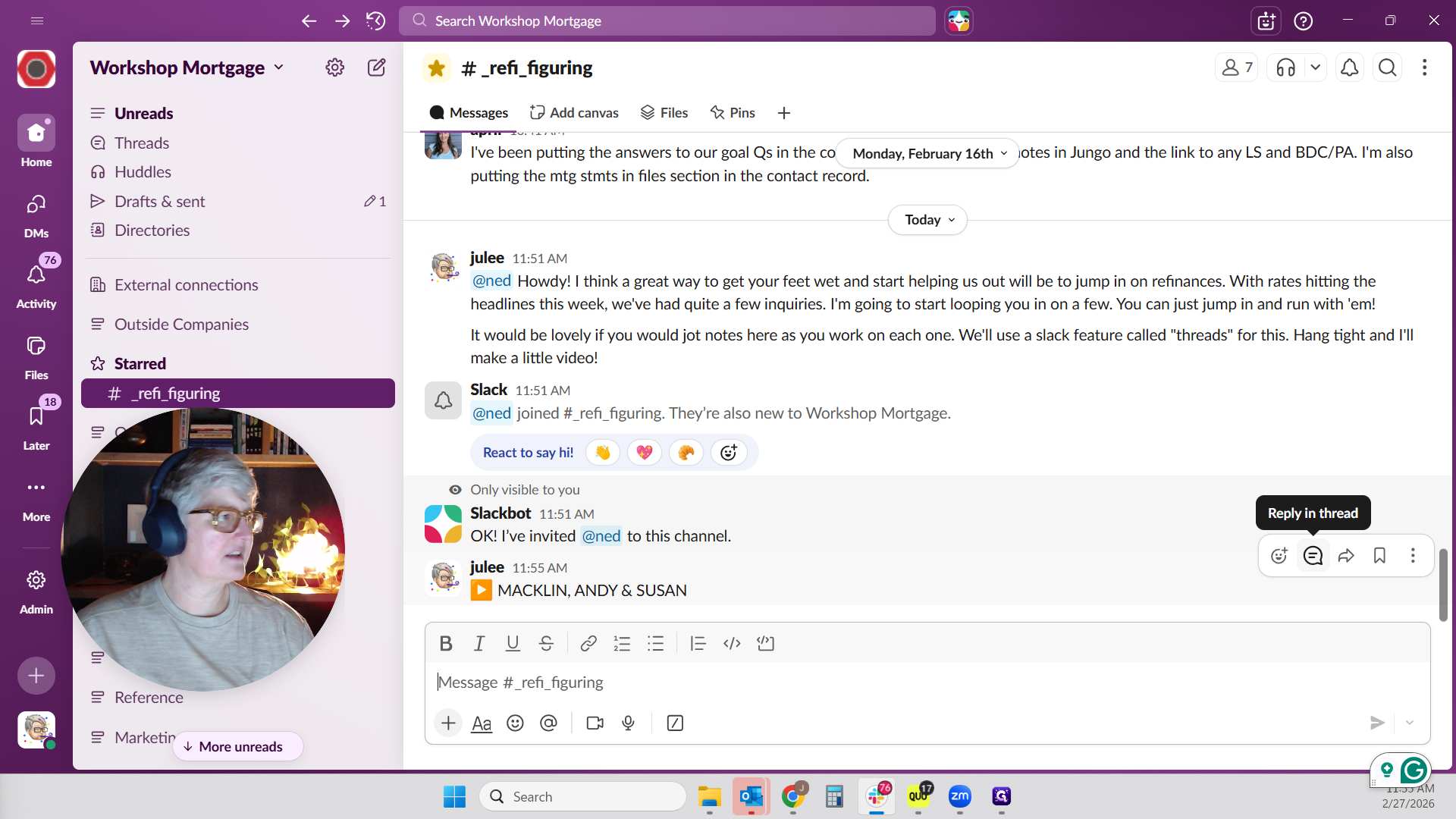 Now we have a post. If you keep posting, long threads will form and things can get messy. We want everything related to the Macklin potential refinance in one place. If you hover over it, you'll see "Add a reaction" or a small quote icon. If you click the quote icon, it says "Reply in thread." A window will appear where you can enter information that will be part of the thread.