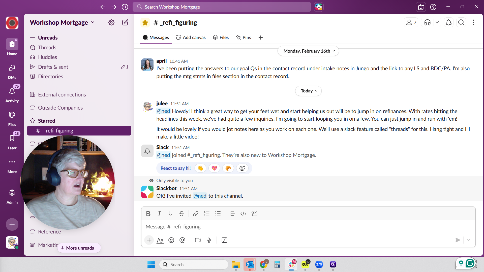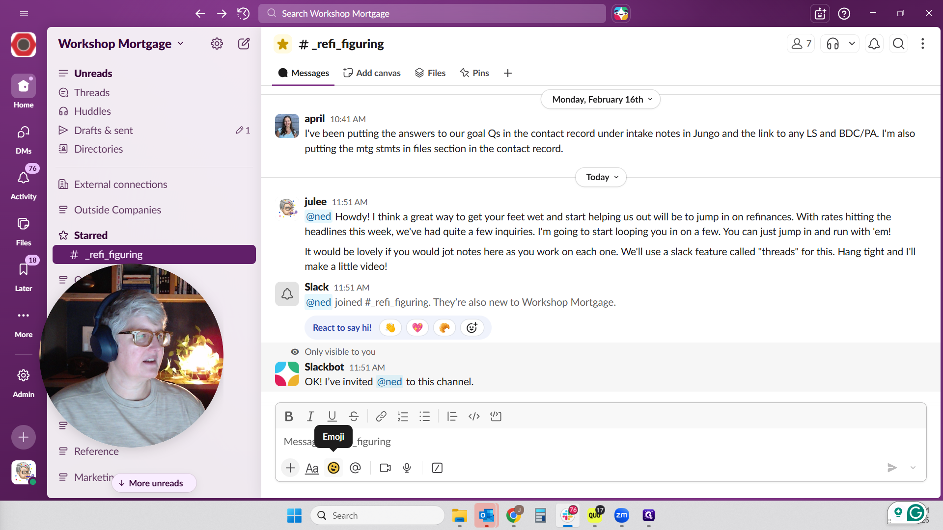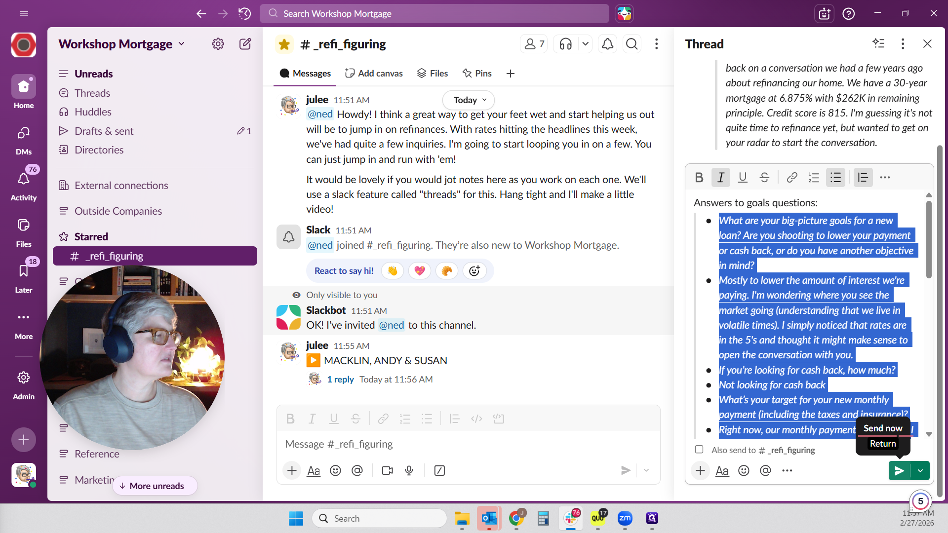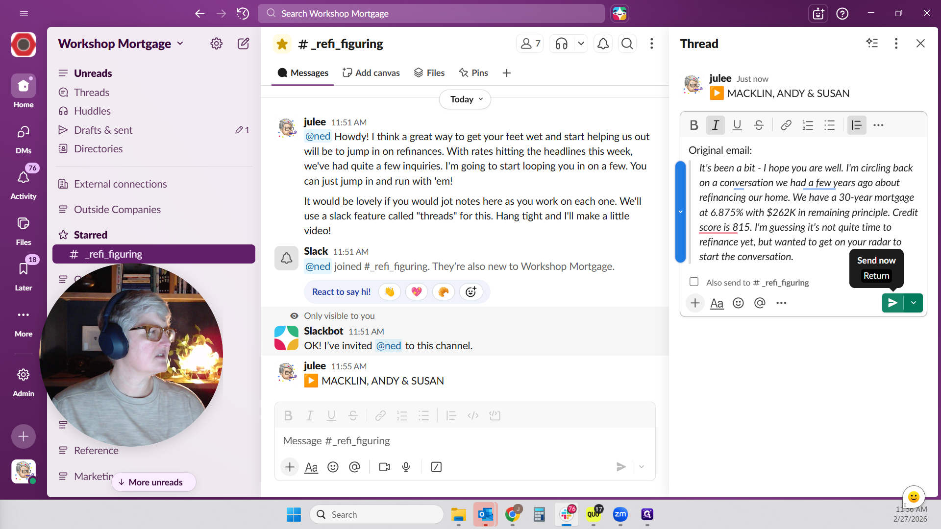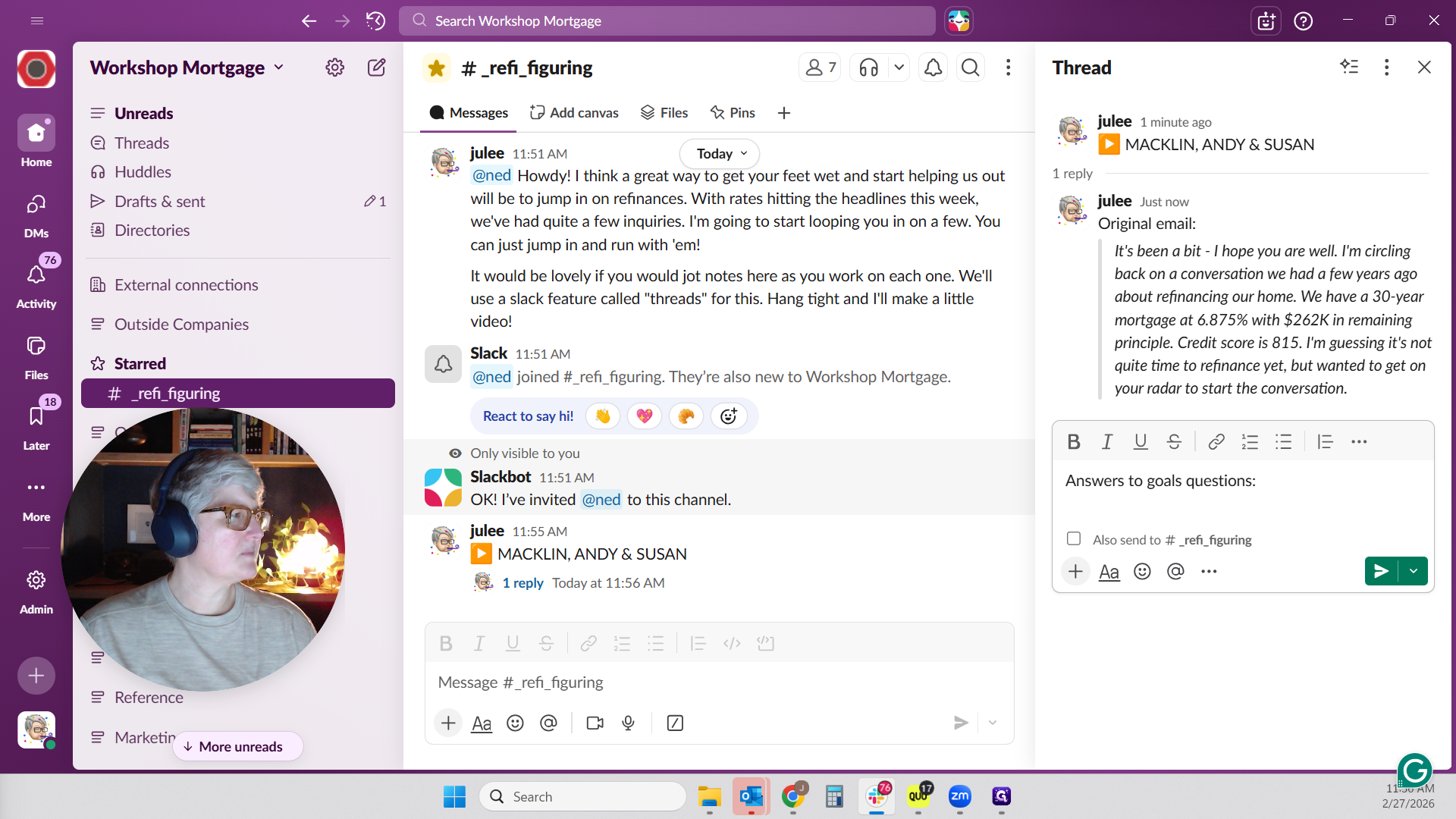 Now we have a post. If you keep posting, long threads will form and things can get messy. We want everything related to the Macklin potential refinance in one place. If you hover over it, you'll see "Add a reaction" or a small quote icon. If you click the quote icon, it says "Reply in thread." A window will appear where you can enter information that will be part of the thread.