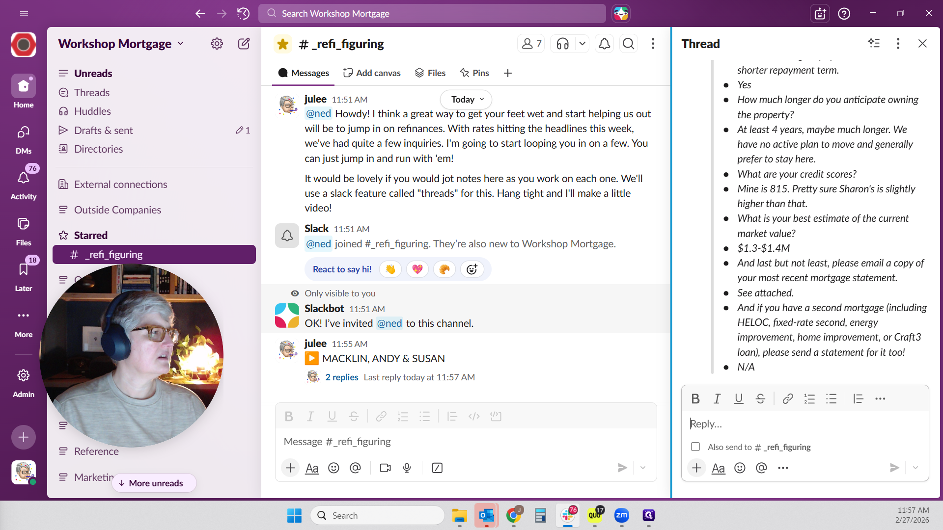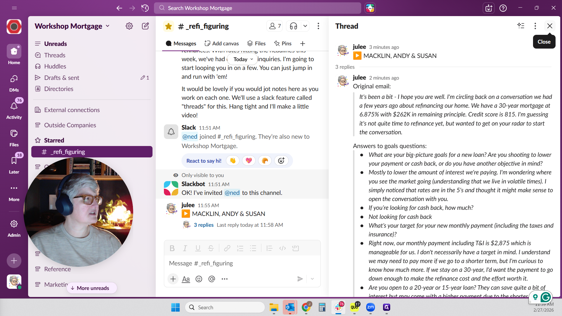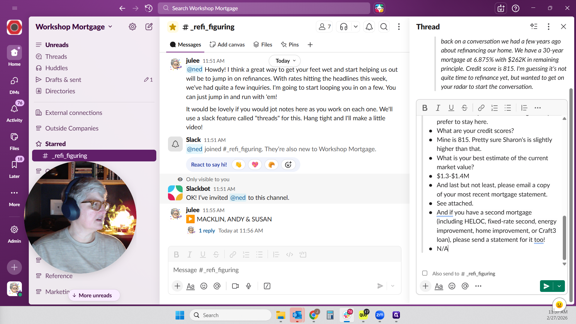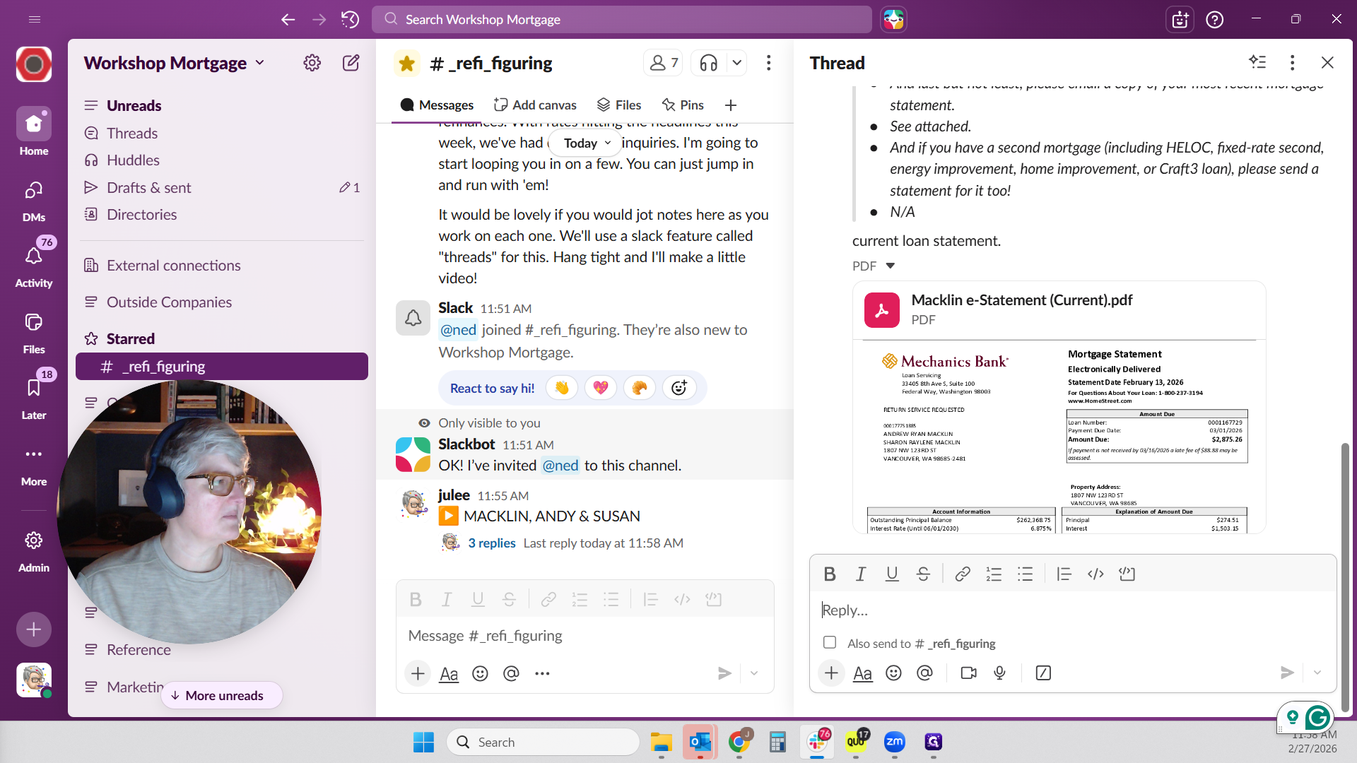 This is in the thread to the right, not the main channel. Here is the current loan statement. You can type notes and screenshot items here. If you want, you can paste screenshots as well.