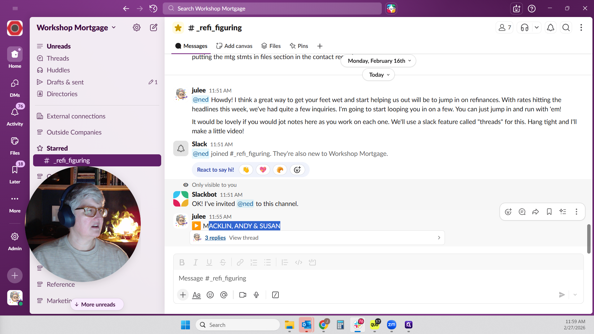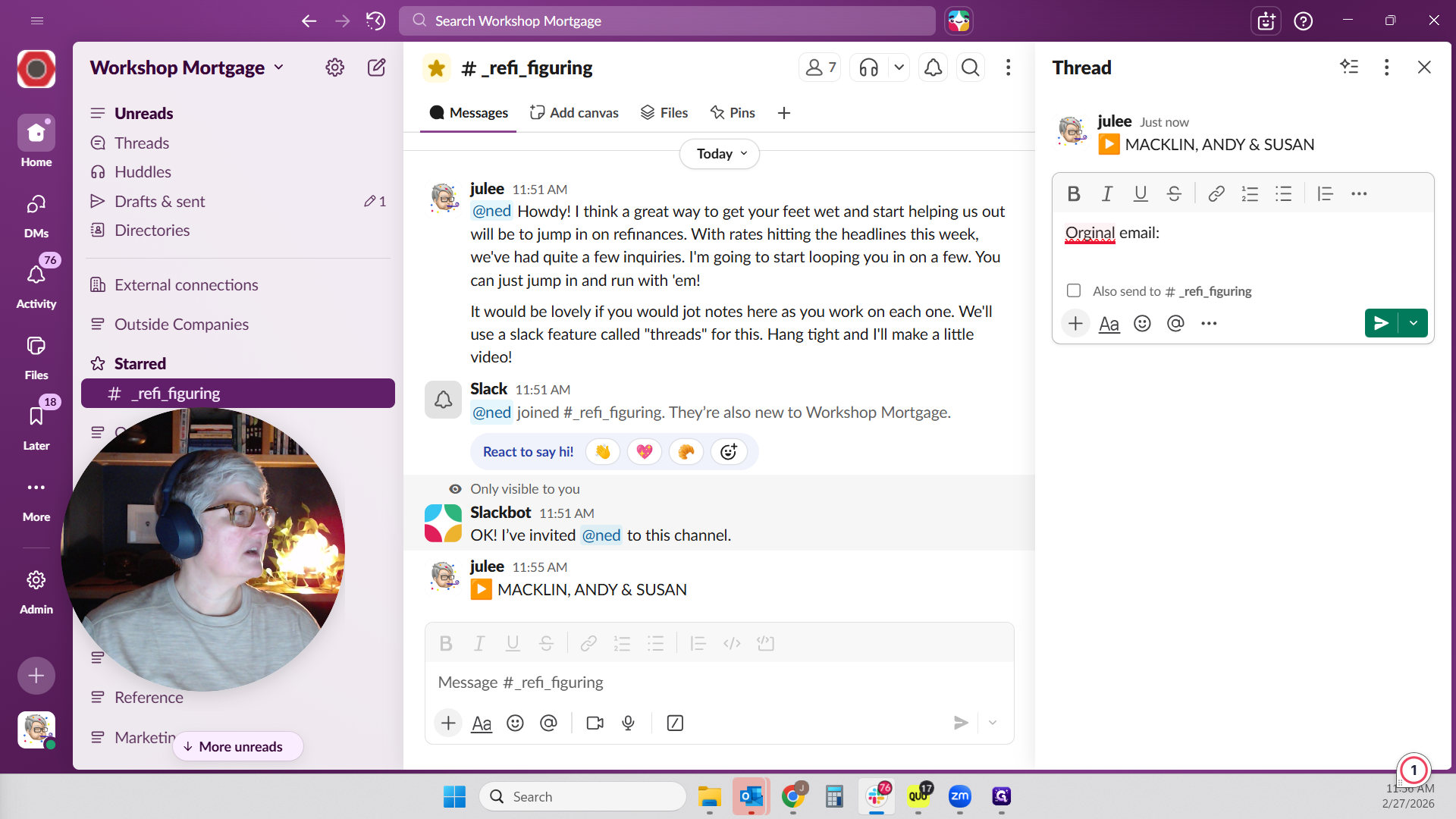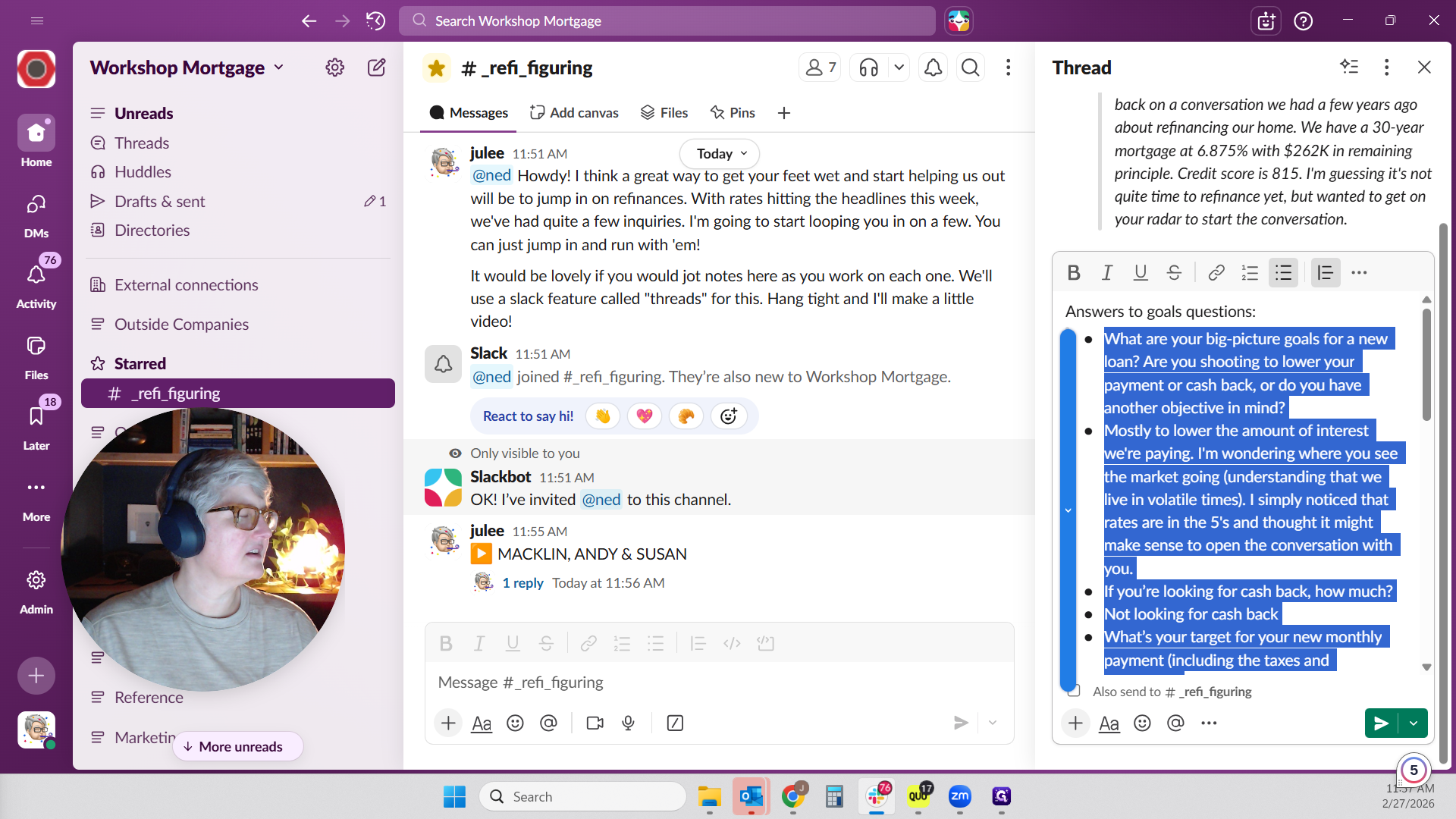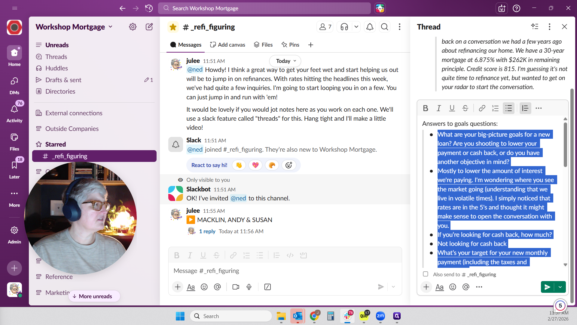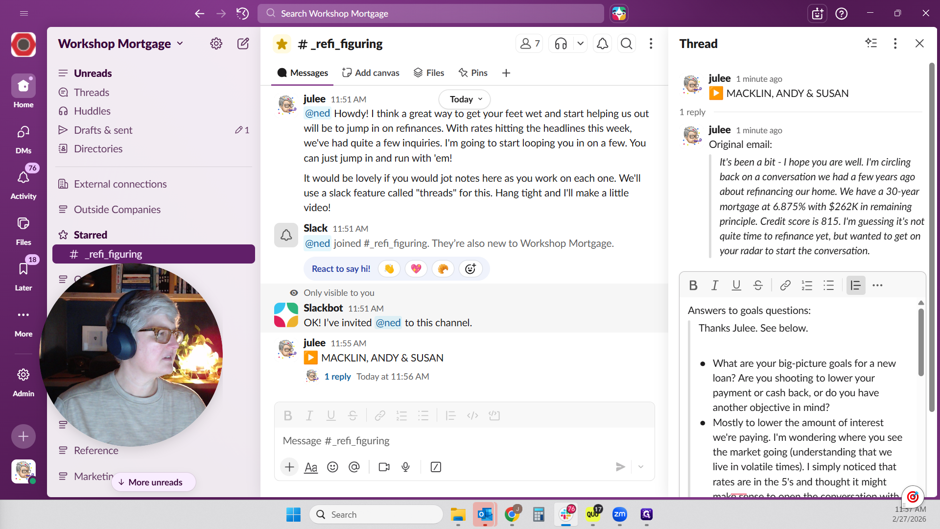 This is in the thread to the right, not the main channel. Here is the current loan statement. You can type notes and screenshot items here. If you want, you can paste screenshots as well.