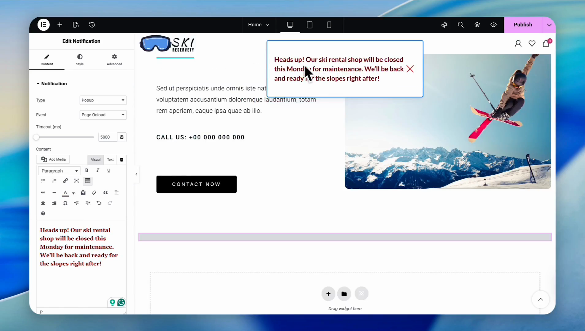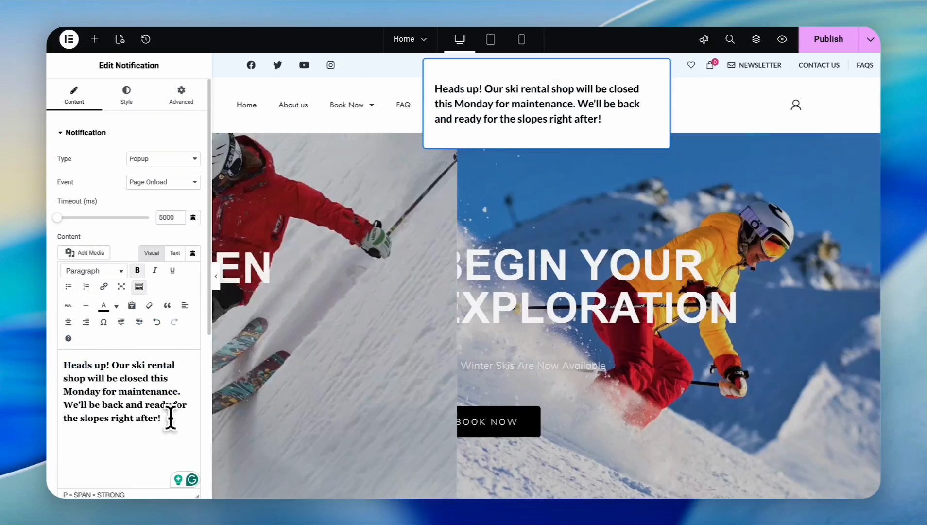In the sidebar, type your message in the text editor (e.g., "We will be closed Monday for scheduled maintenance.")