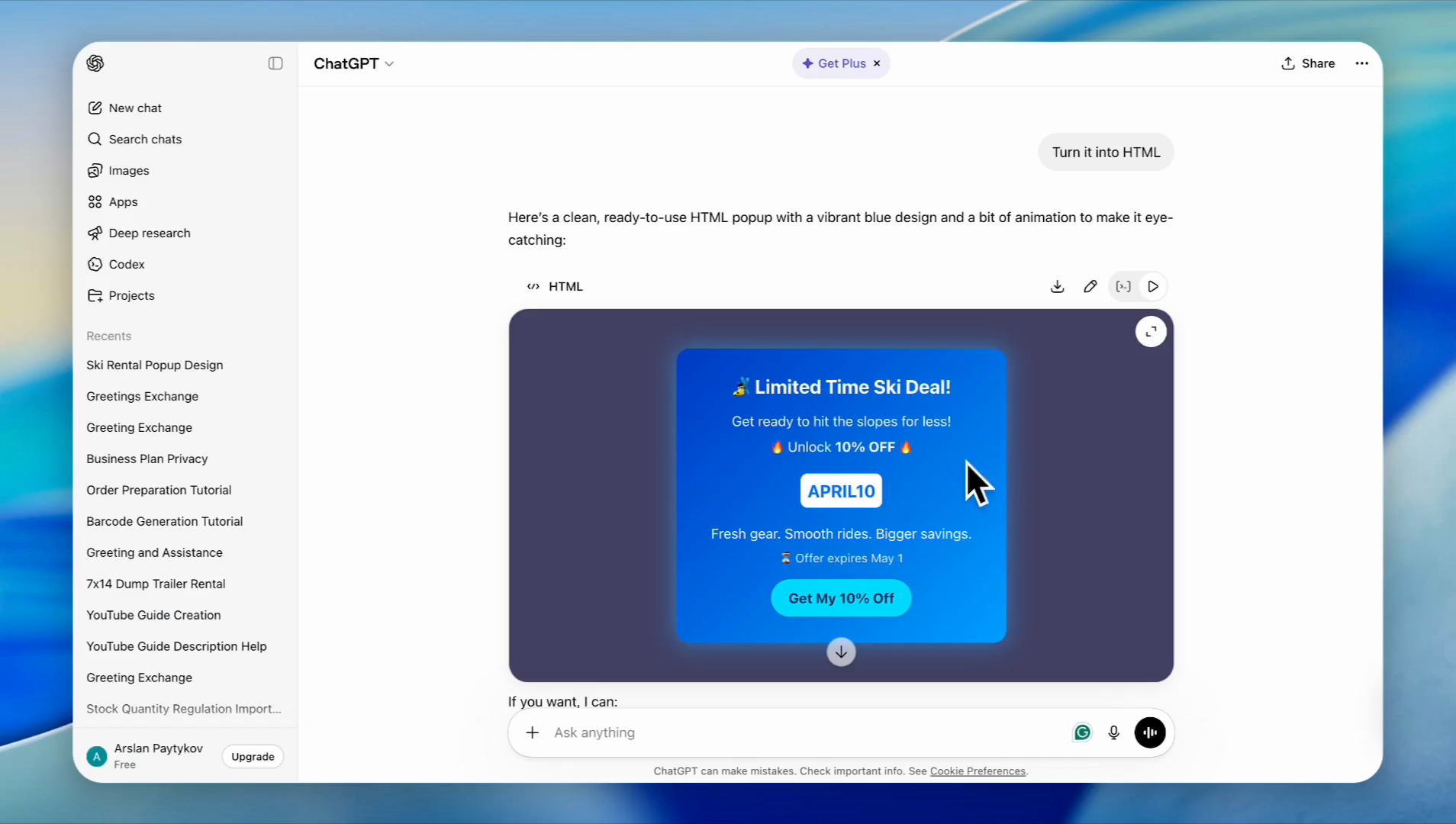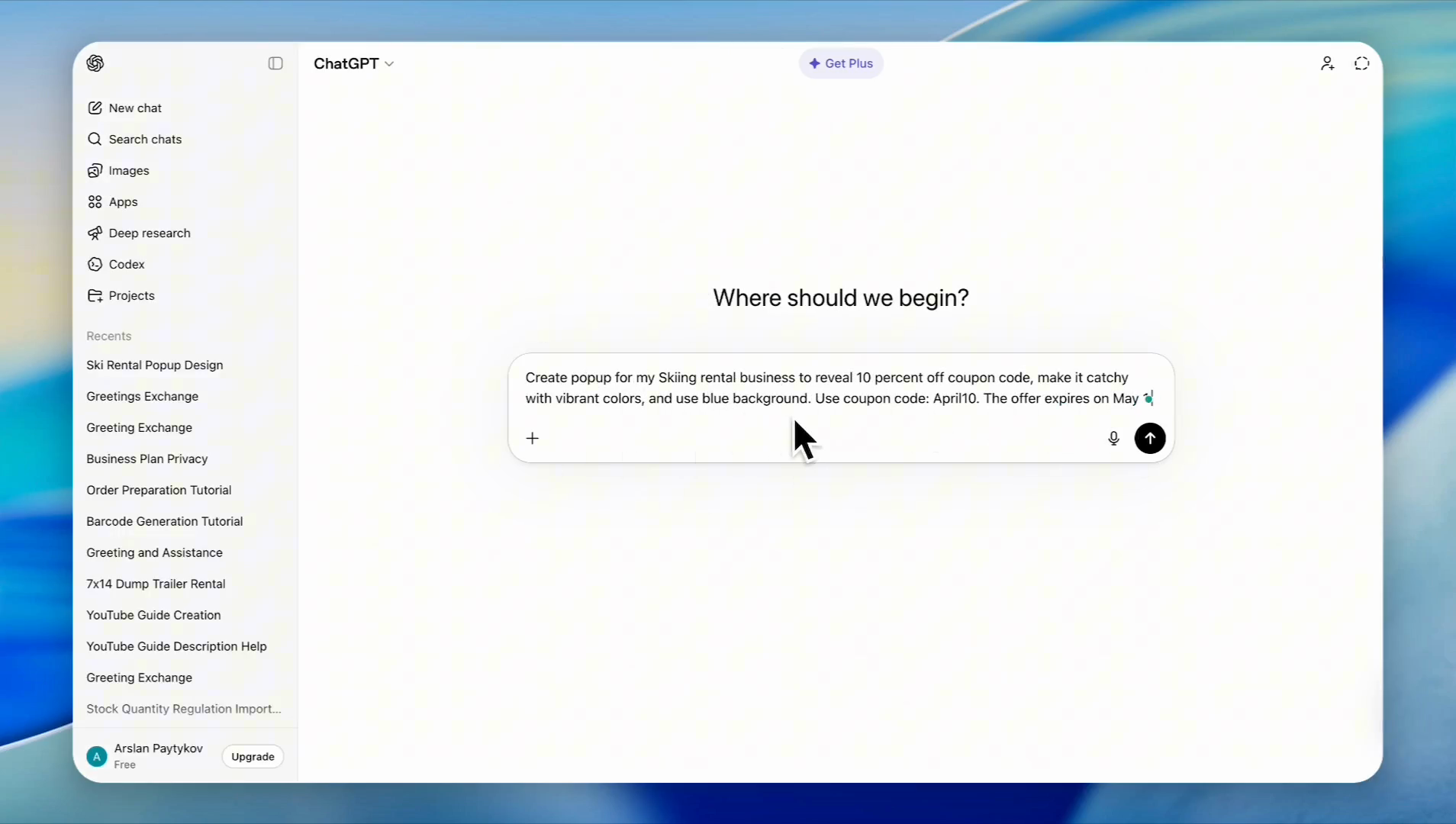 In ChatGPT, enter a prompt describing your ideal banner and submit it (e.g., "Create a pop-up for my ski rental business to reveal a 10% off coupon. Make it catchy, use vibrant colors with a blue background, and include the code APRIL 10 expiring May 1st.")