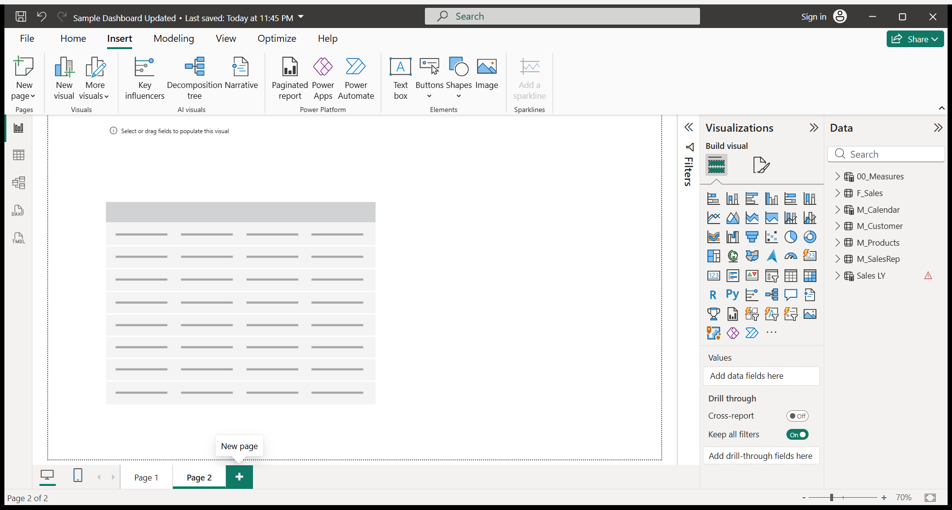 Here’s how I created a new page in Power BI Desktop. Now, we need to add a text box to this page. We need to add a title to this page. Go to the Insert tab. Under Insert, select the text box option.