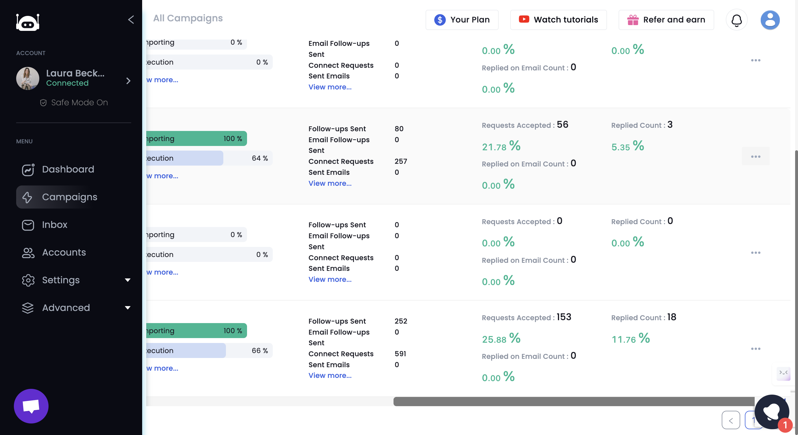 In this guide, we'll learn how to navigate and manage campaigns in SalesRobot. Once logged in, you will see the accounts or dashboard, displaying analytics for Laura's account. This includes campaign activity, connection requests, and replies over the last 30 days.
