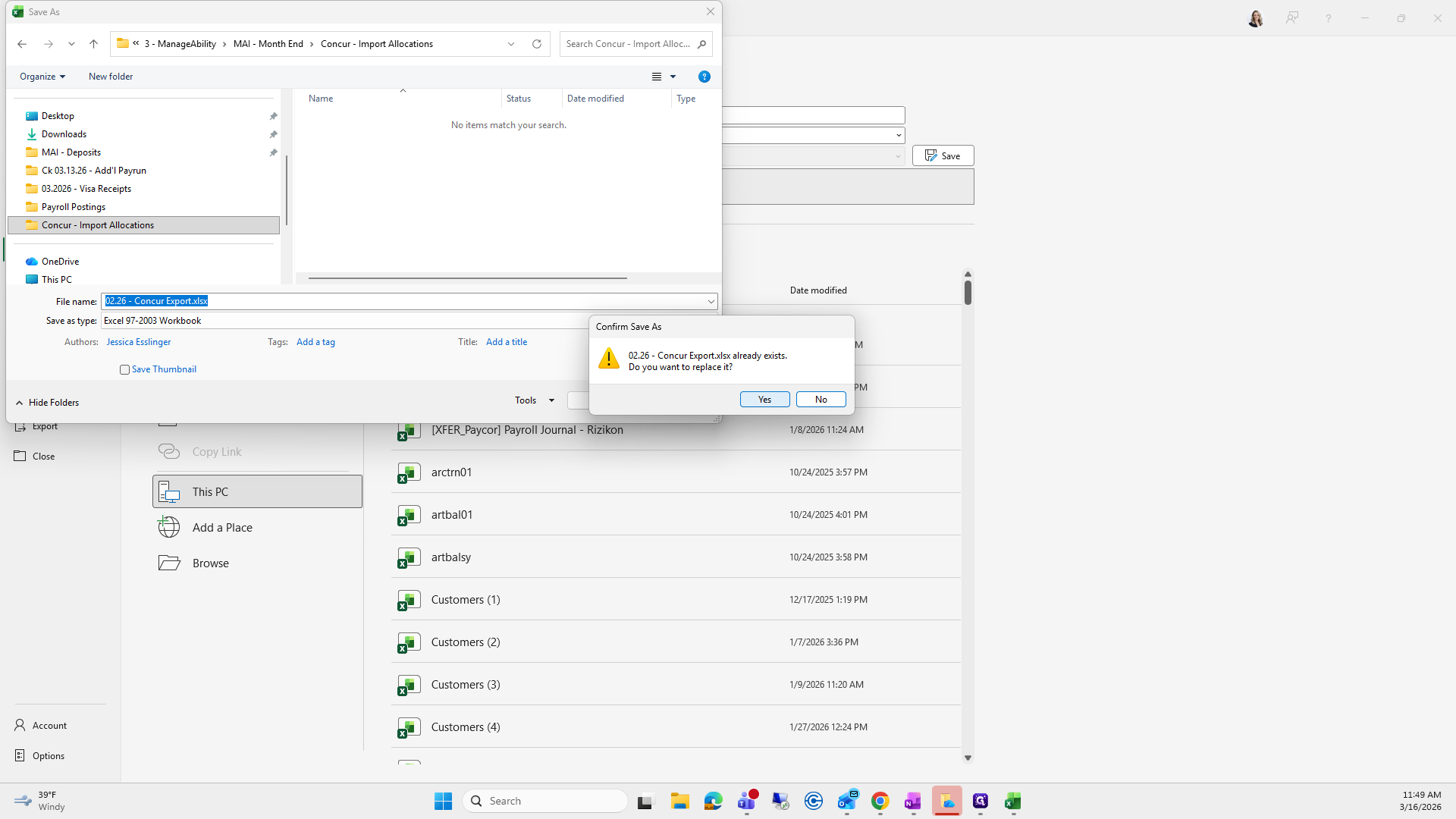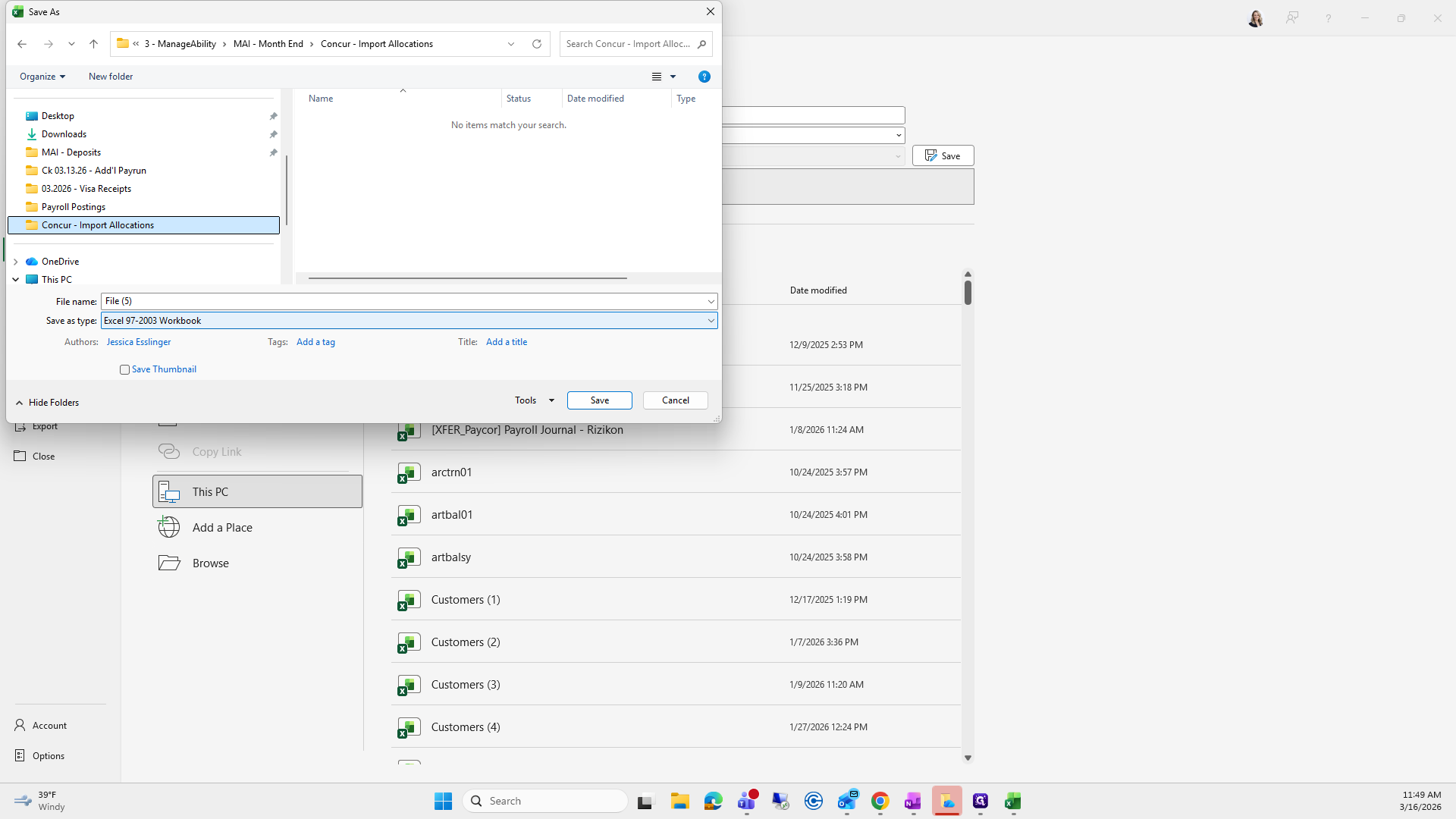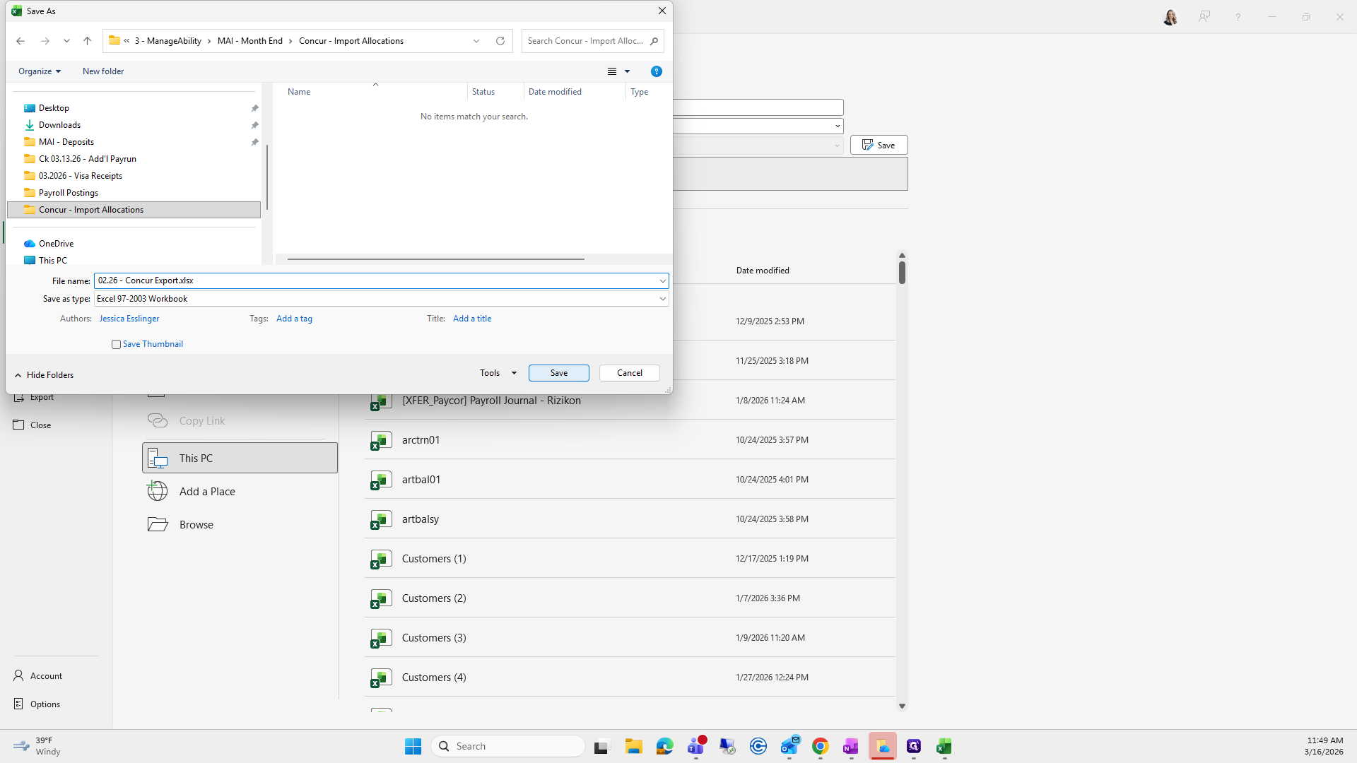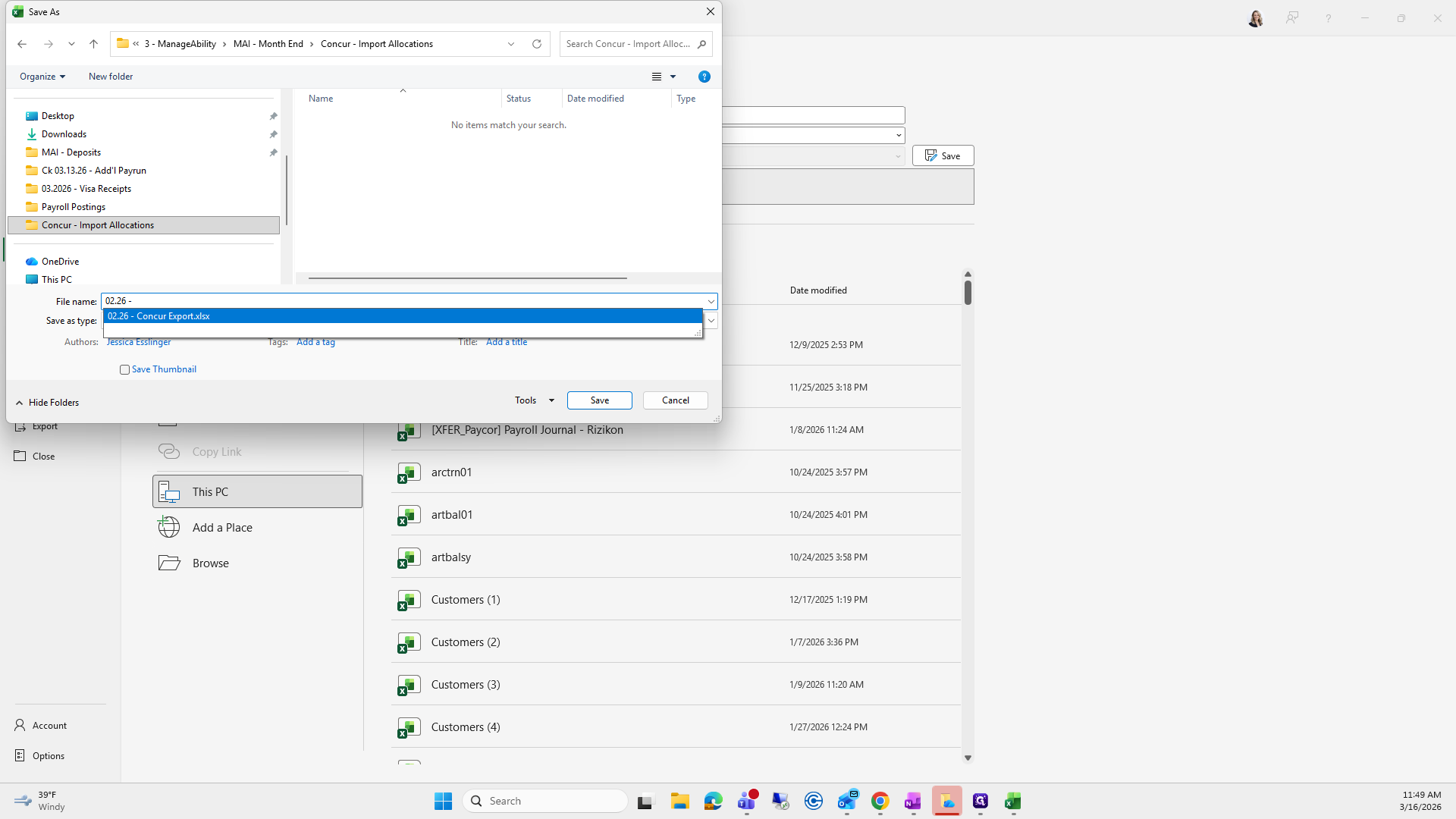 We will save it as the current month. Right now, it's "Concur Export," and I already have one saved here.