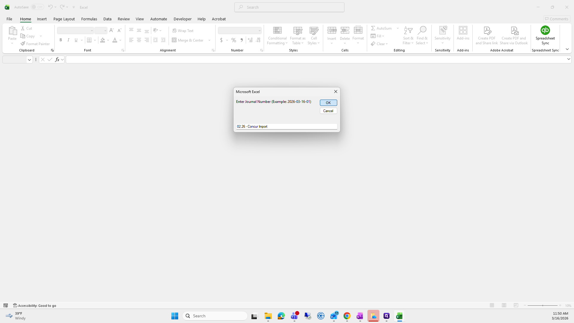 It will prompt you to enter a journal number for how you want it to appear in QuickBooks. I will enter the journal number "Concur Import." The system will prompt for the entry date, which should be the last day of the month or the date it was transferred out.