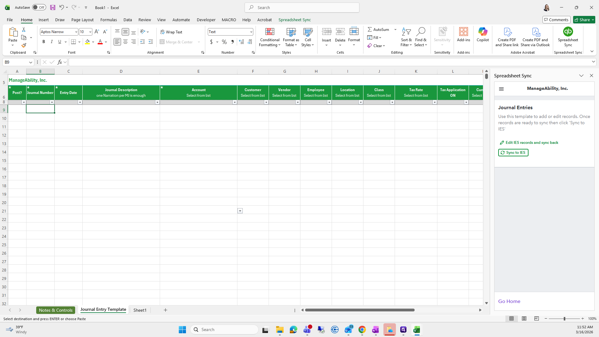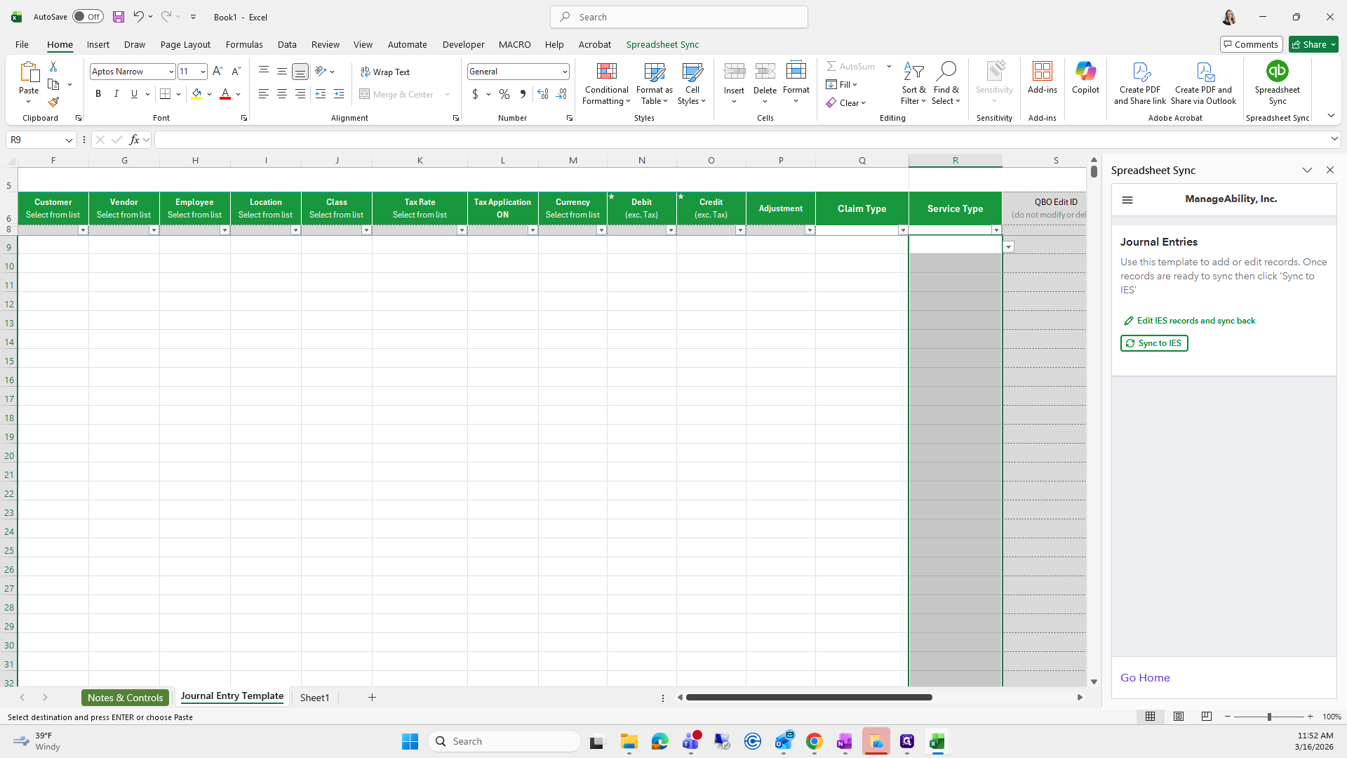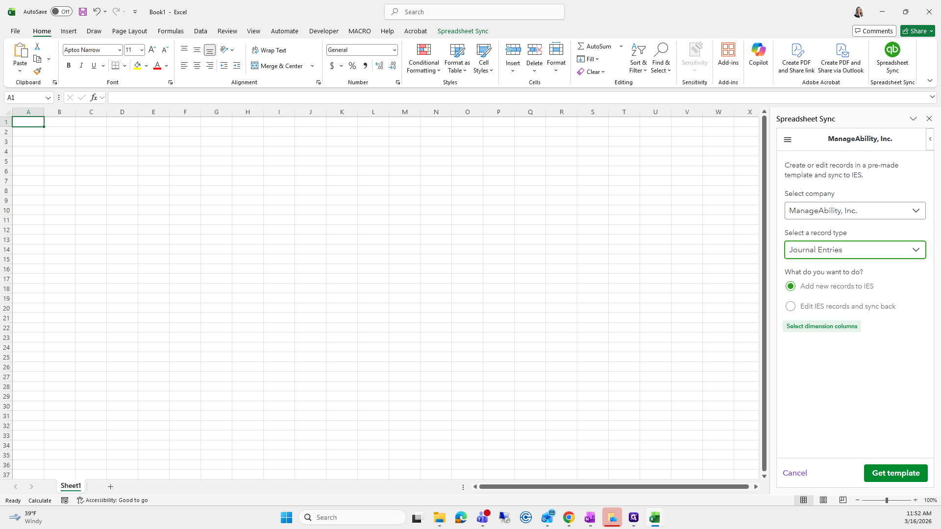 Choose Create or Edit Records. Set company manageability and the record type of journal entries. Add new records to IES. Select dimension columns, claim type, and service type. Click Template.