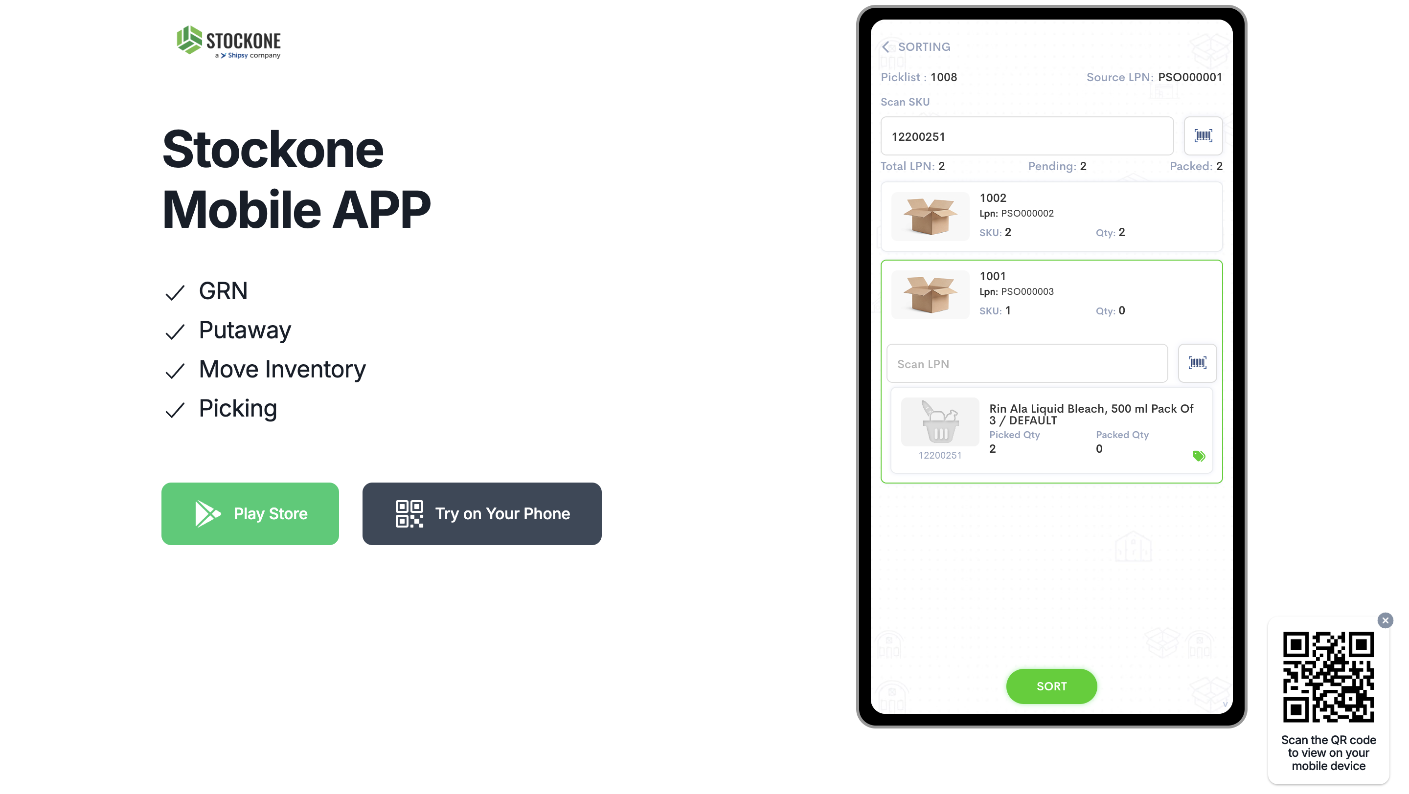 Click SORTING on the Home Screen of Picker app. Scan the Source LPN that was used for picking. (PSO000001)