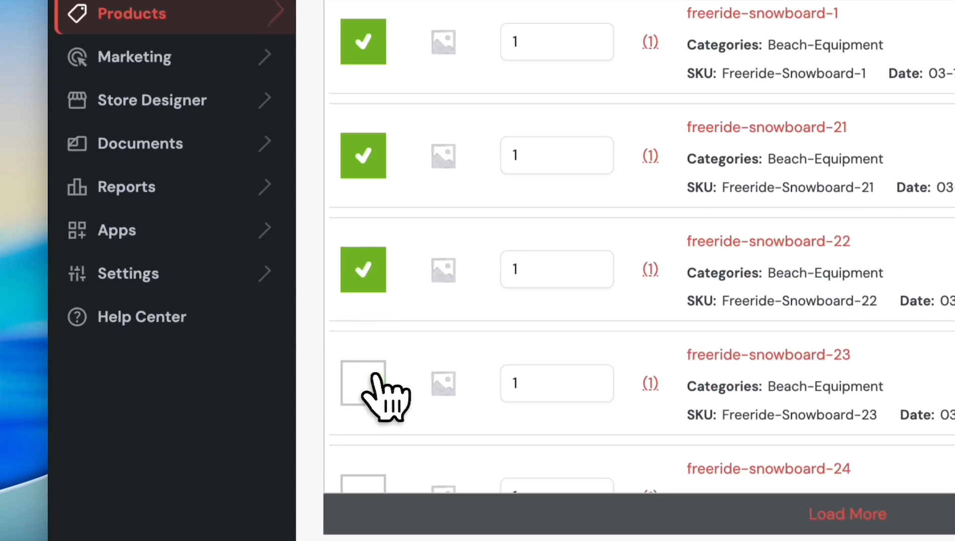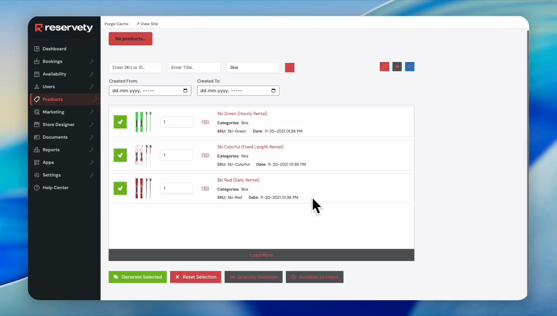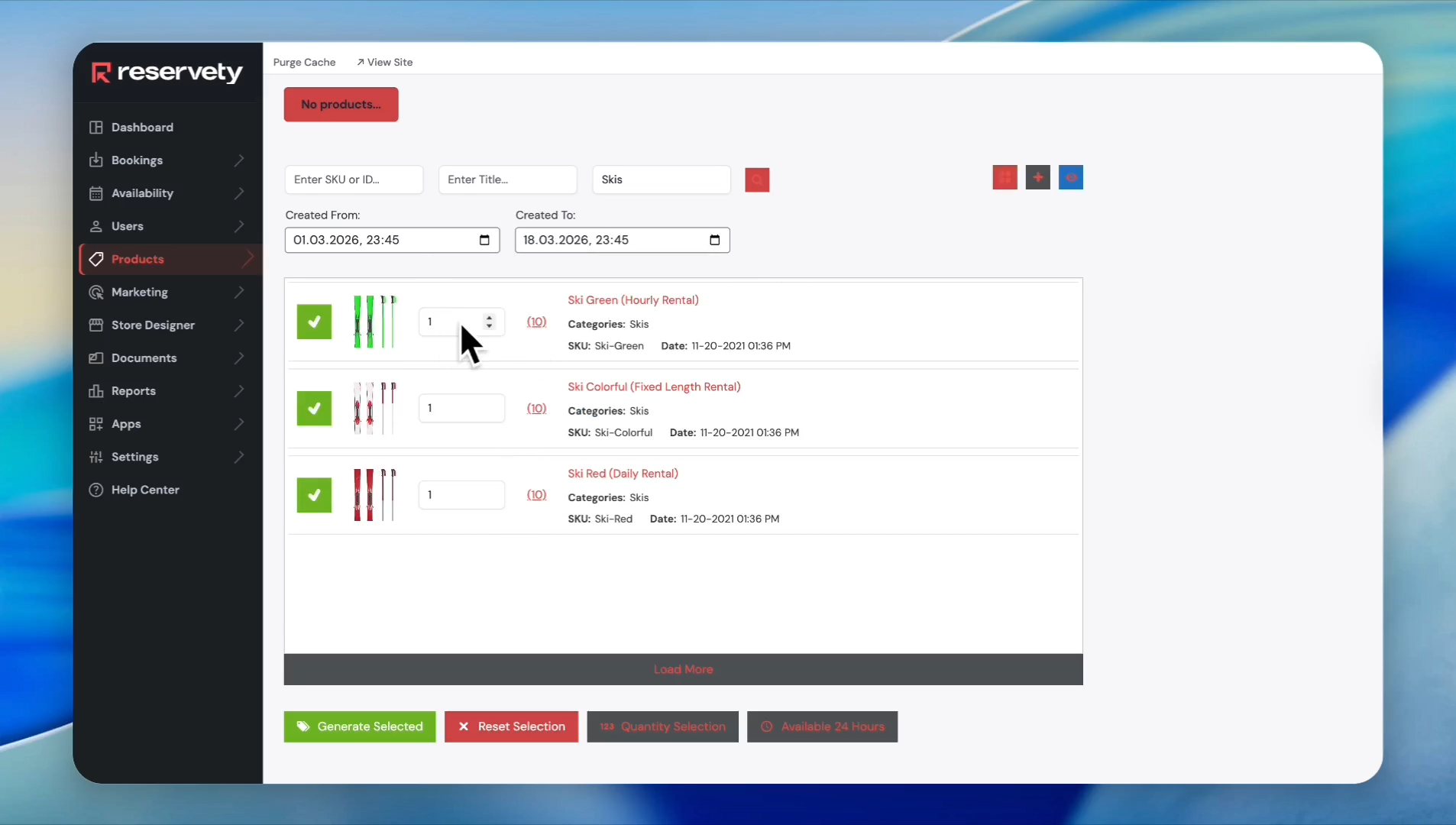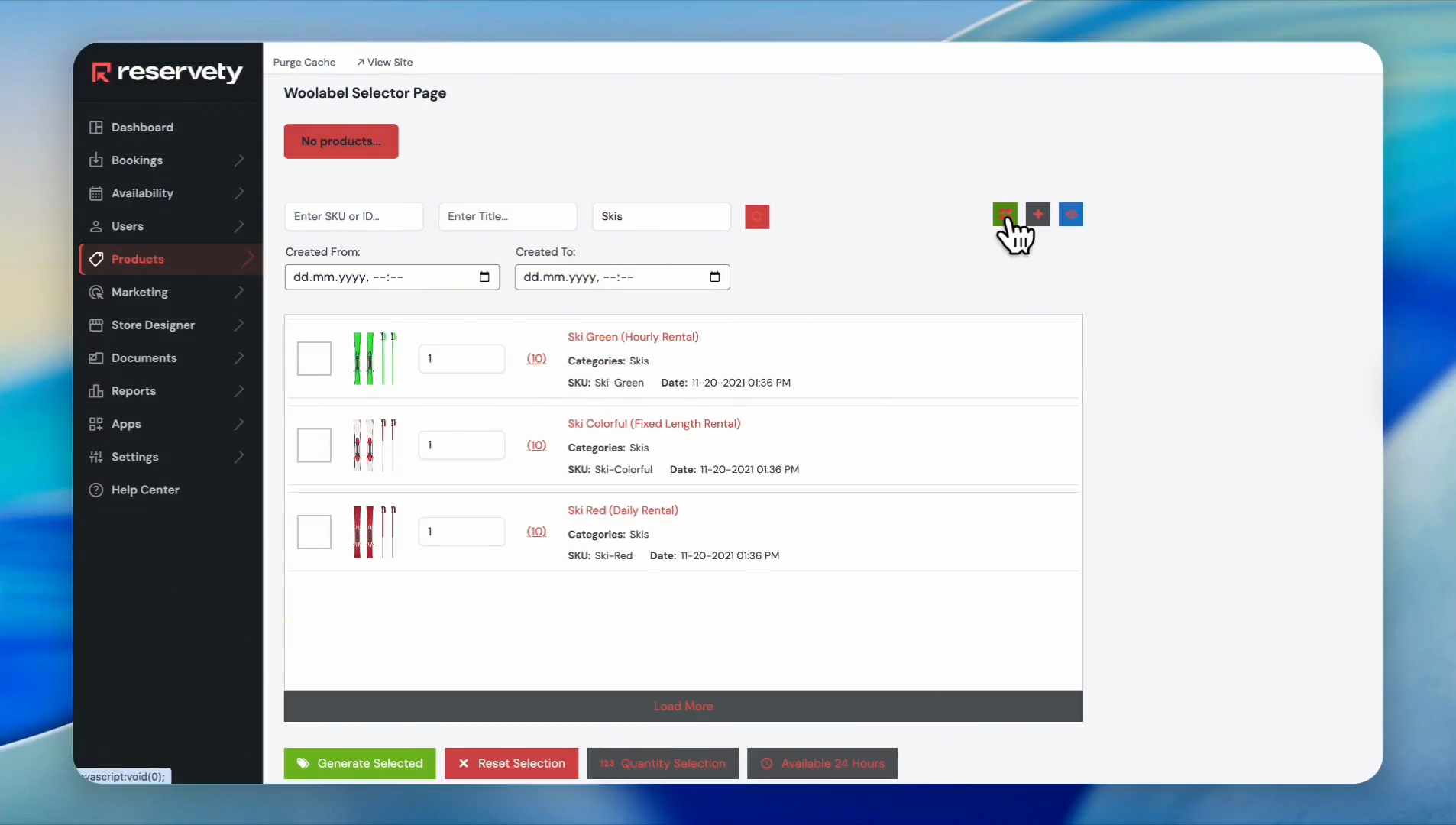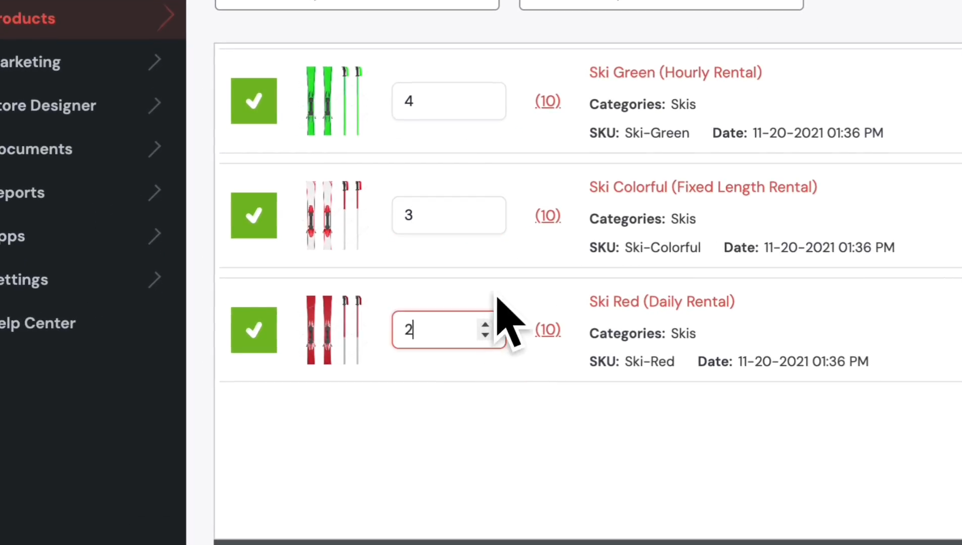 The system displays all products under Skis. To select all of them, click on the green box here. This process avoids you from having to put a check mark on all the serials manually.