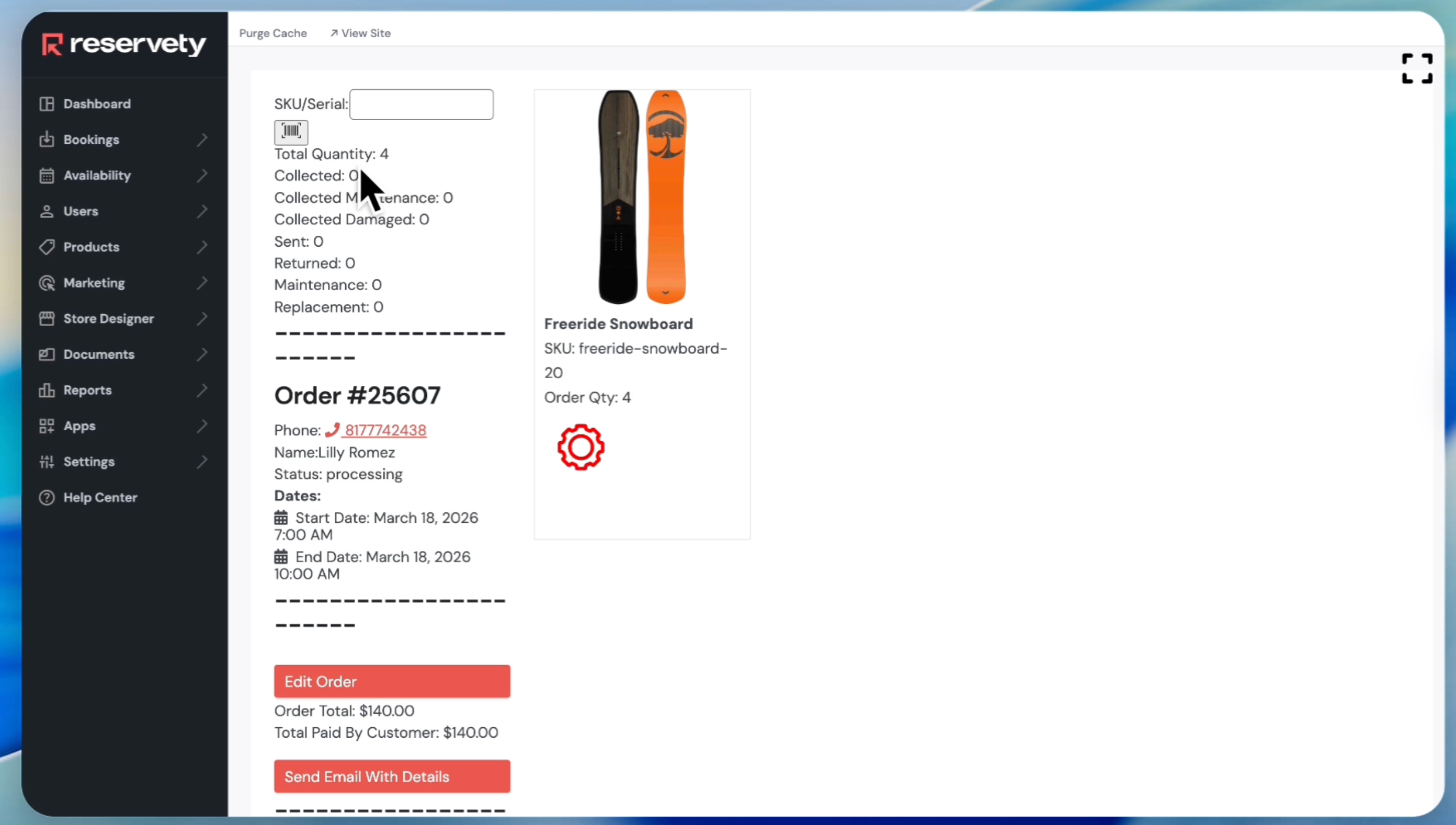 For example, we typed "Freeride Snowboard" and clicked the search icon. The system generated a list of products with serial numbers belonging to Freeride Snowboard.