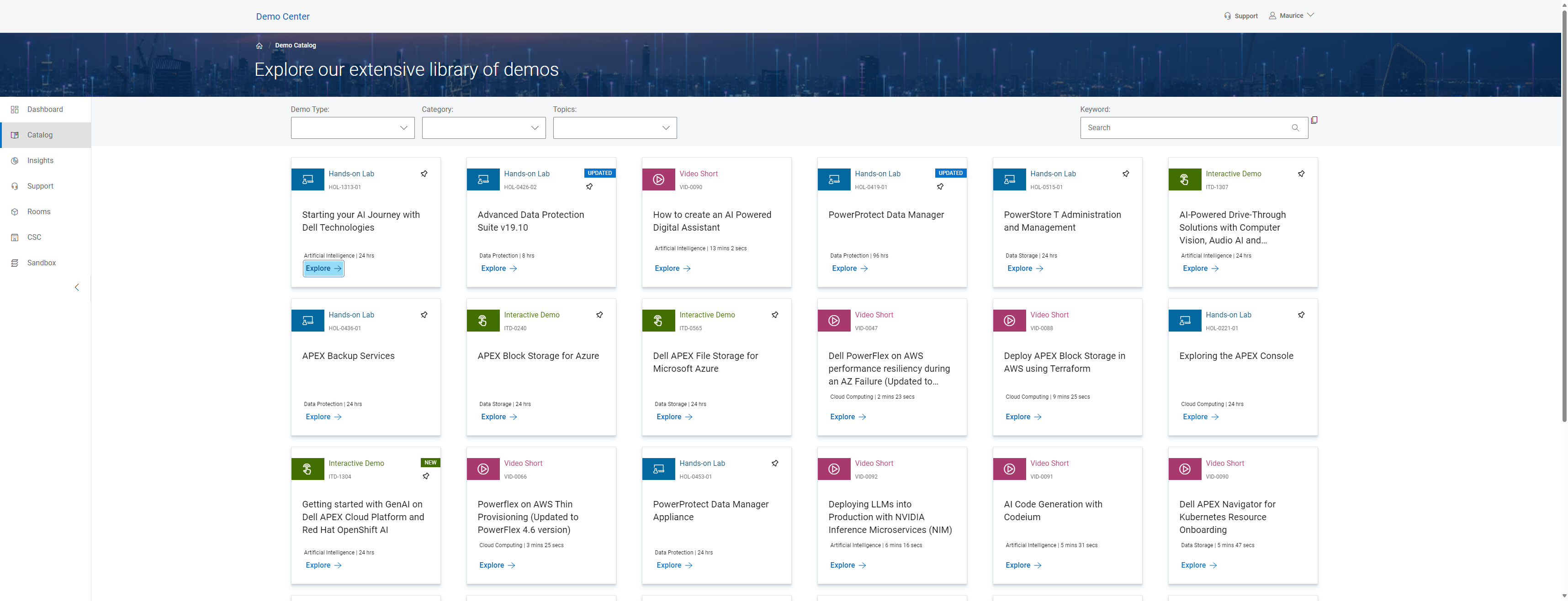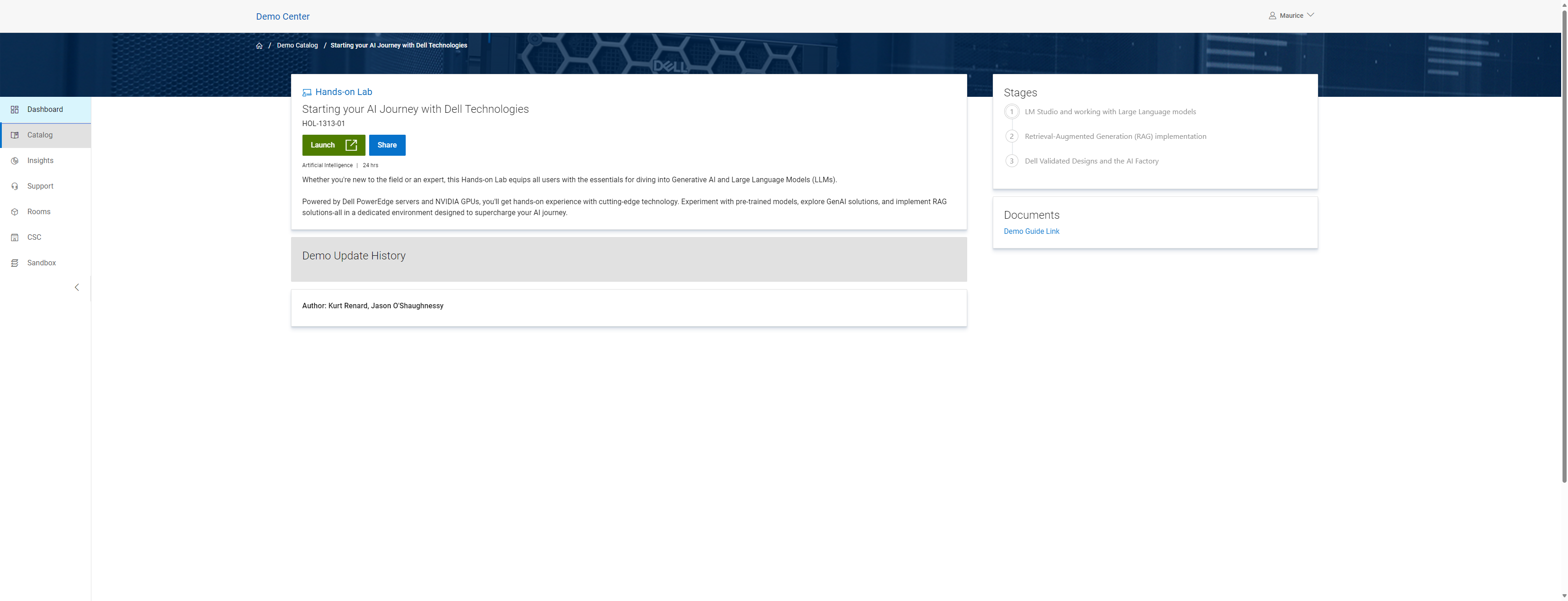 All right, let's kick off with the demo. Now, we get the catalog, expand it, and go back to the dashboard. Launch the lab. The lab is launched. We want to follow the guide. Stop.