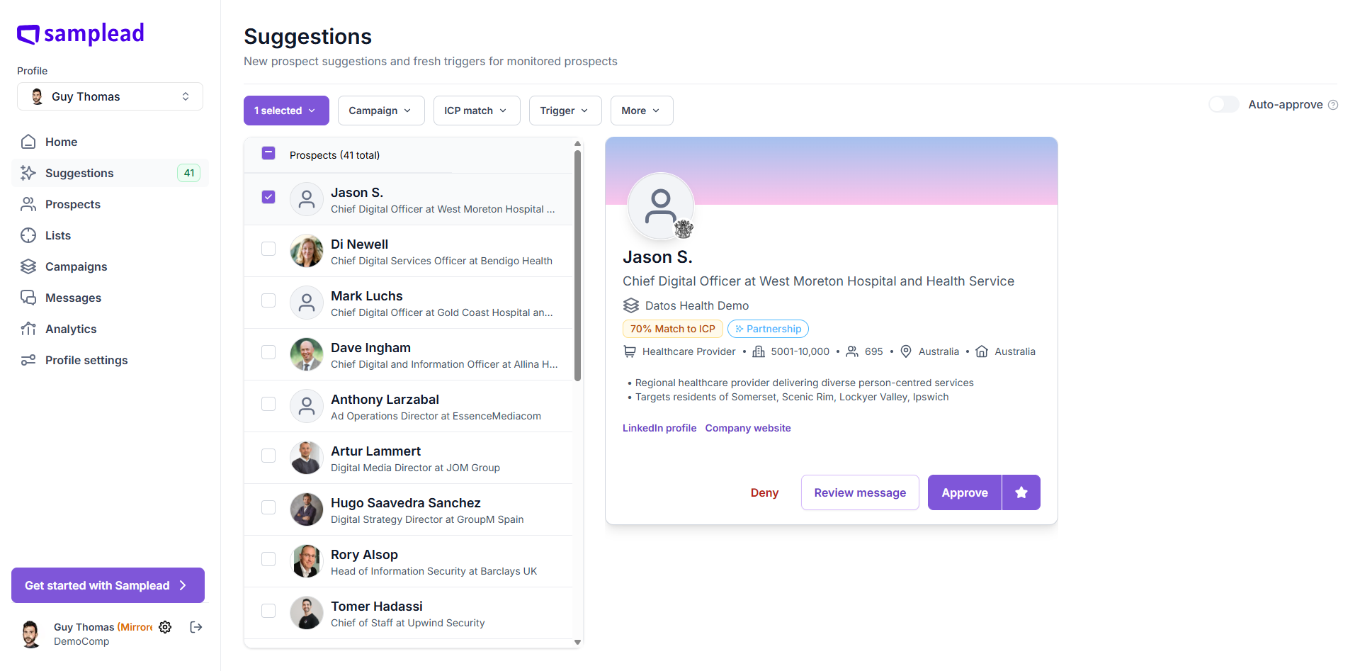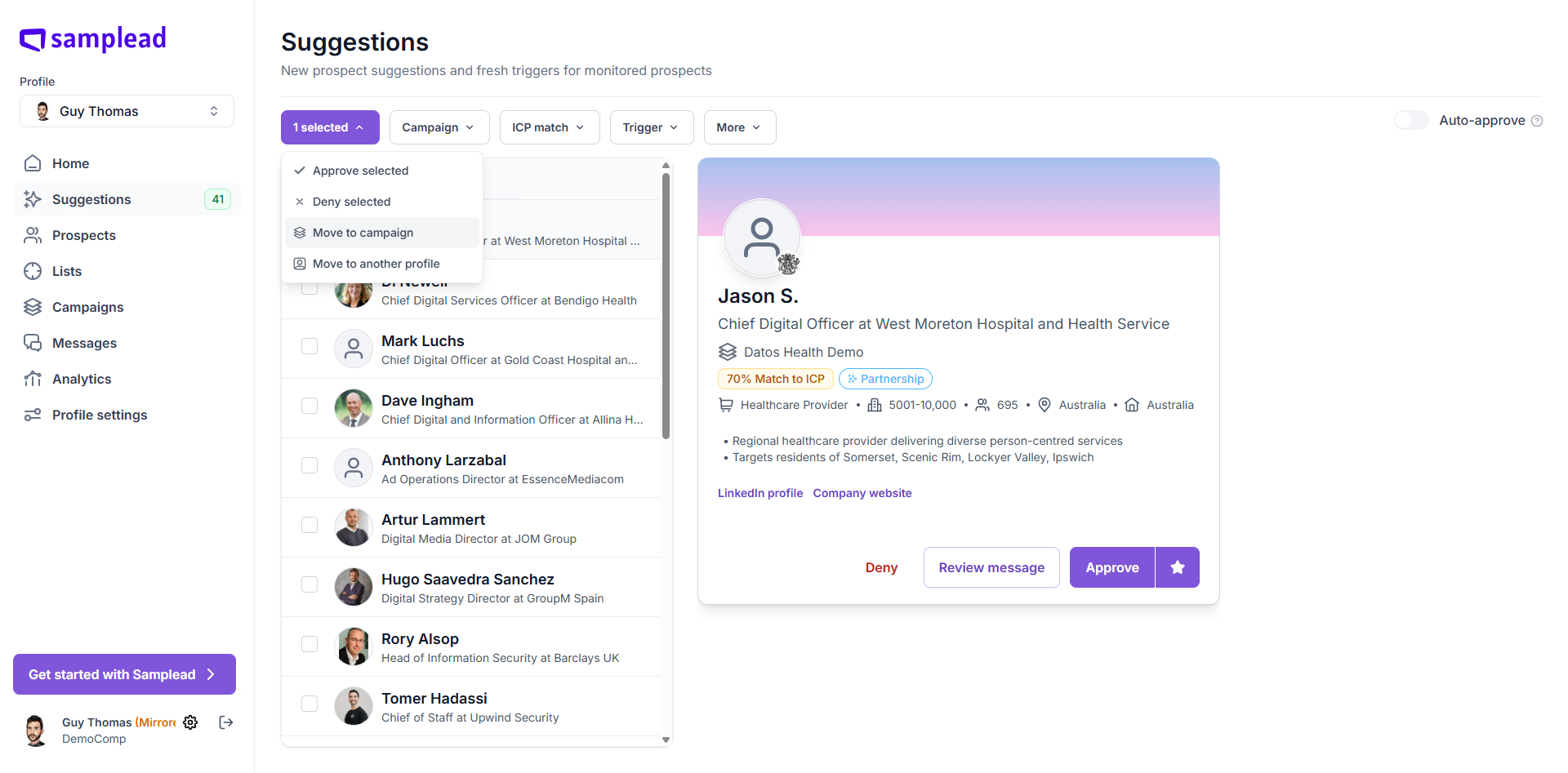 When you first receive your prospects, they have been randomly assigned to different campaigns unless you tell us otherwise. In the example we see Jason S. has been assigned to the Datos Health Demo campaign - it says this under his name and title.