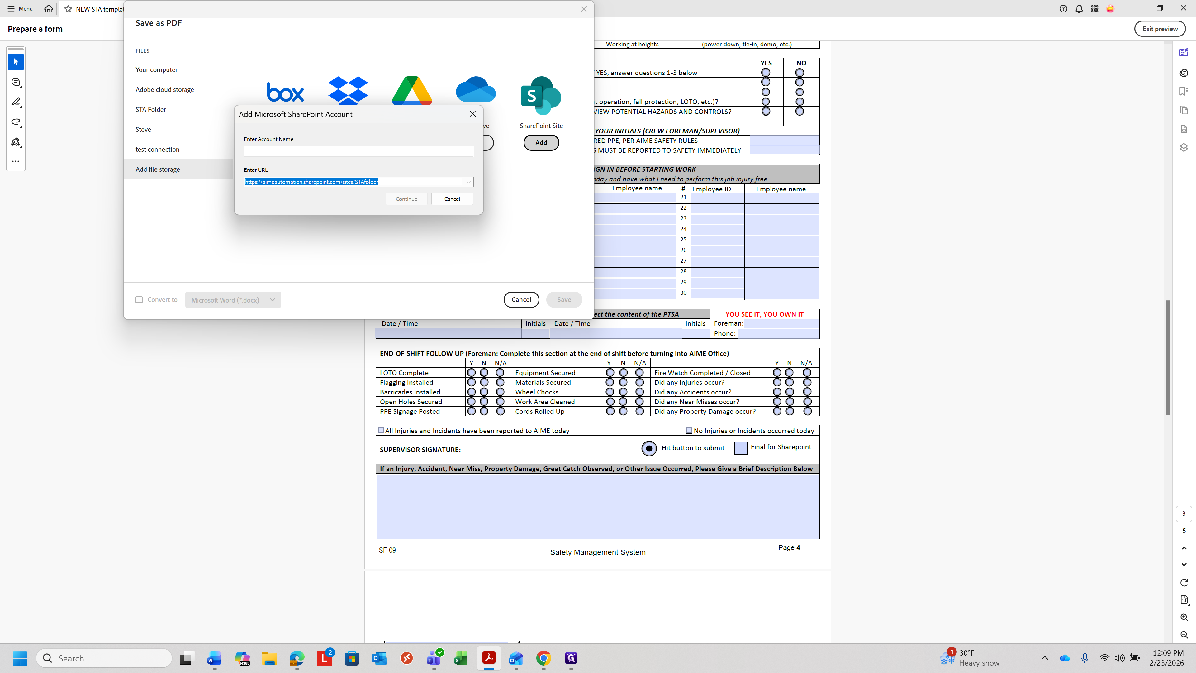 If you don't already have the STA folder set up with a direct link to SharePoint or Teams, you can add file storage and add your SharePoint site here. You can name it whatever you want, and set the folder name as given on the sheet. This is where you want it to point to.