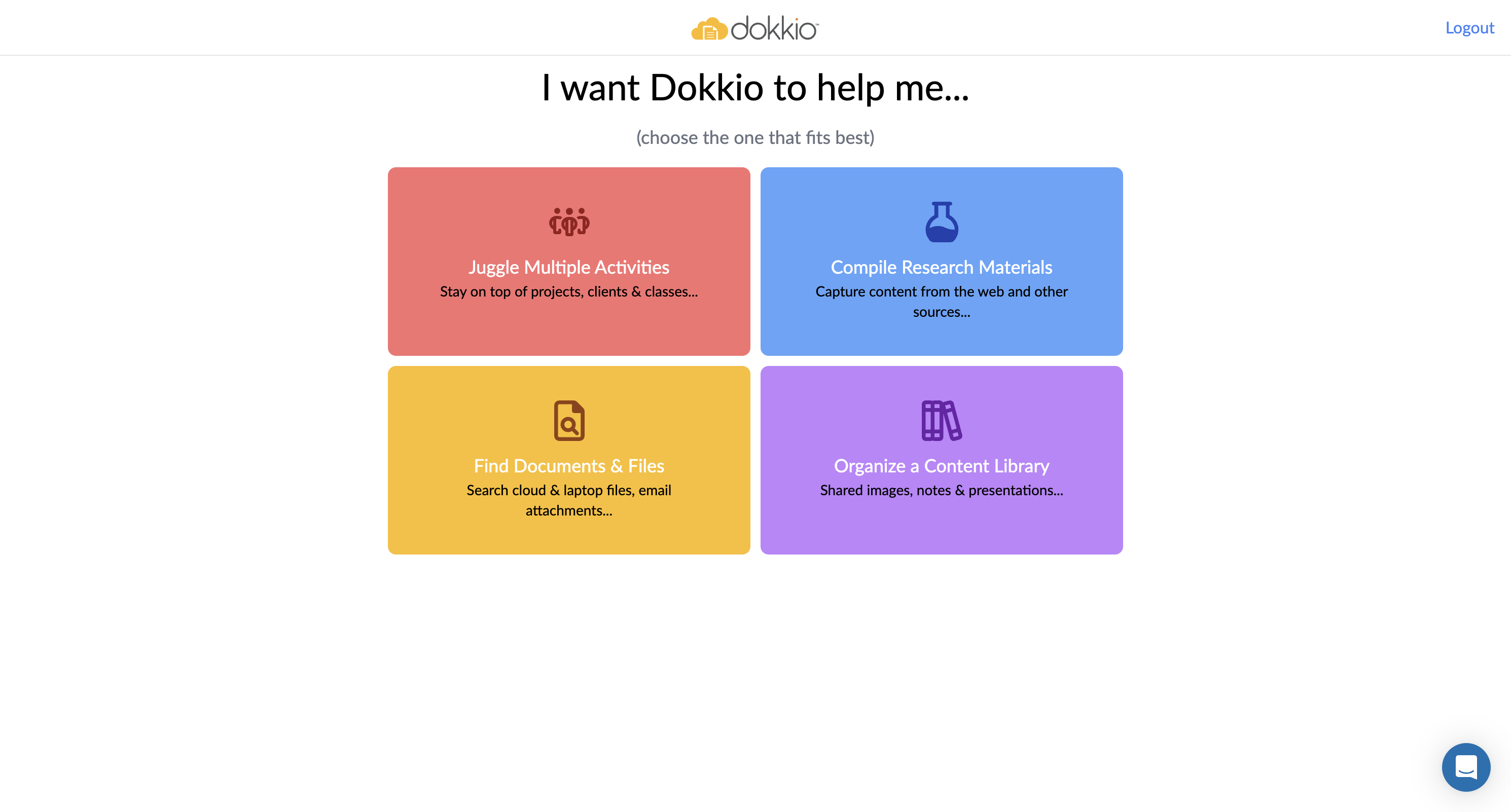1) Use case: Selecting the right use case at onboarding is not life or death, but it could save time -- within your workspace, Dokkio will suggest sections specific to your use case. (e.g. "Tech Company" gets sections like "Feature", "Product", "Project"; "Non-Profit" gets "Board Member", "Campaign").