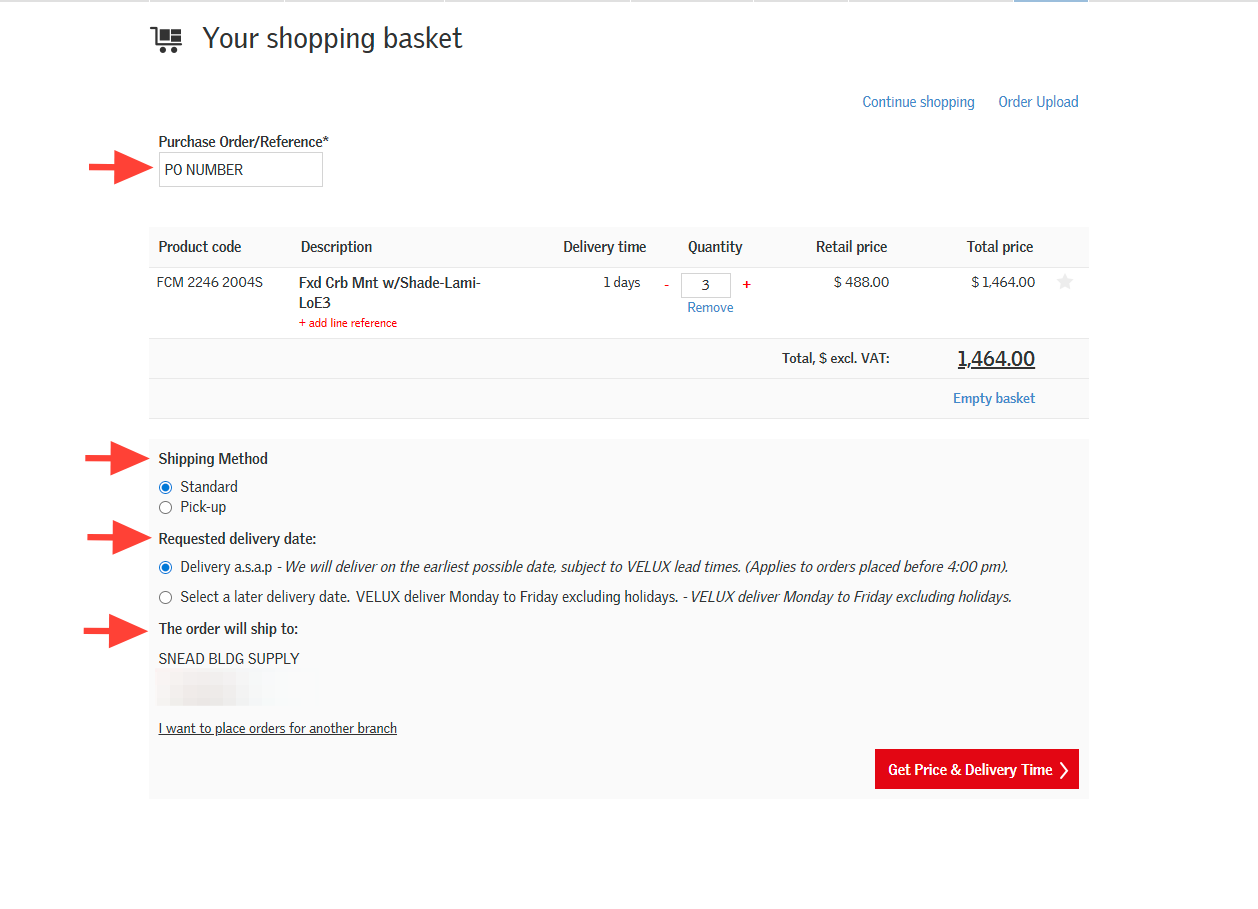Enter your PO number or job name if for a quote in the Purchase Order/Reference field. Note the Shipping Method defaults to standard and the Requested delivery date defaults to Delivery a.s.a.p but these can be adjusted as needed. Verify all information and click Get Price & Delivery Time.