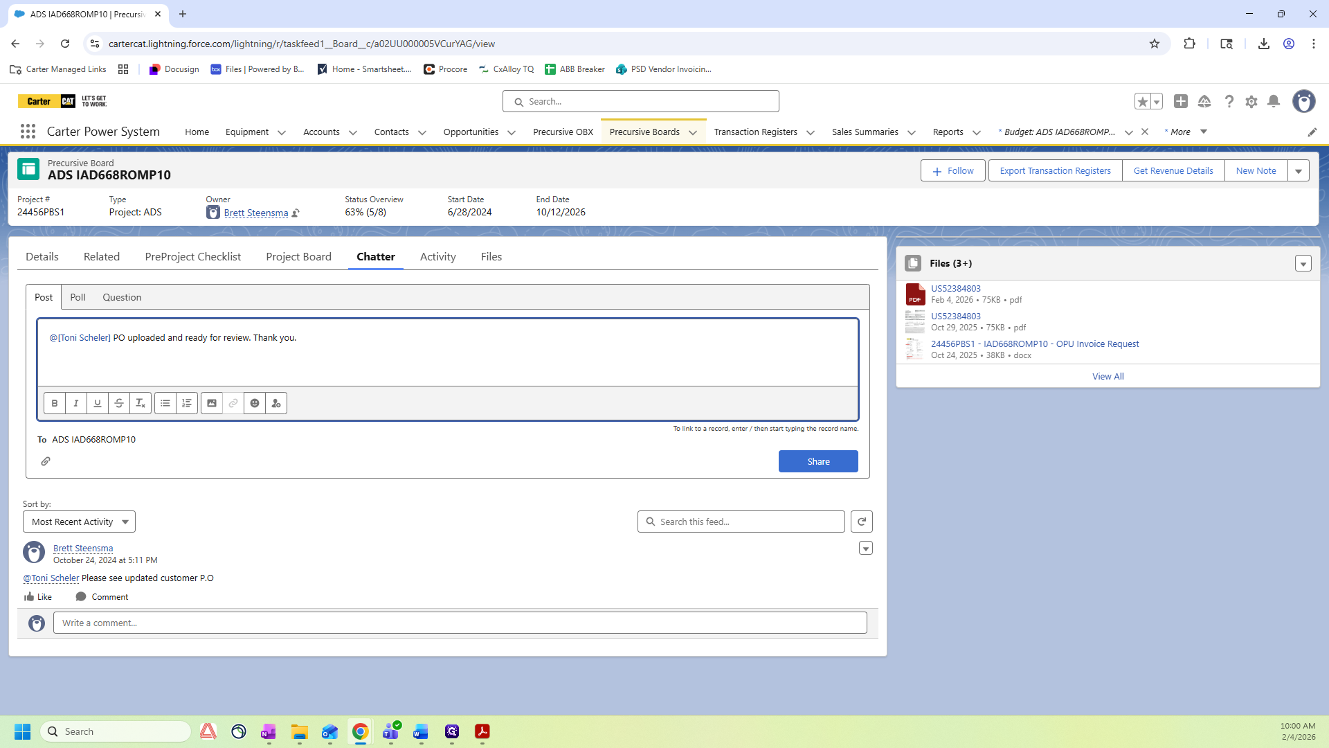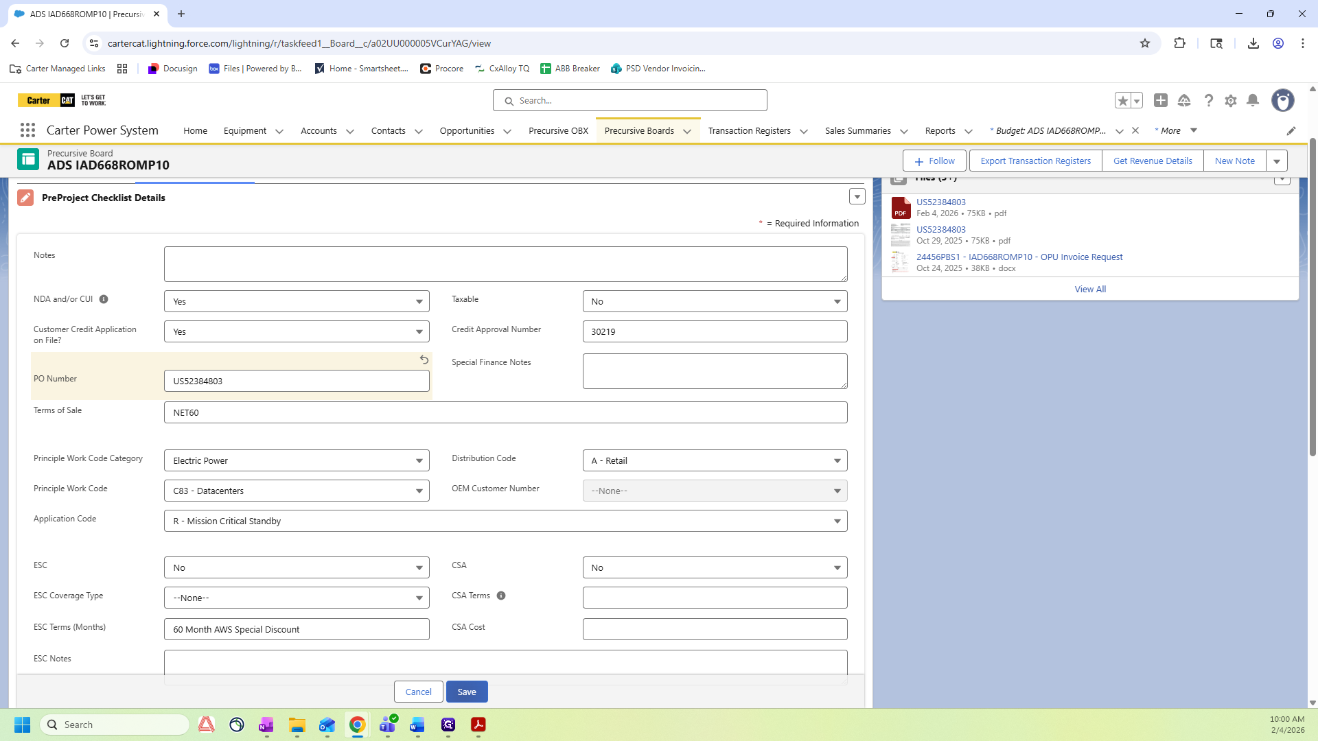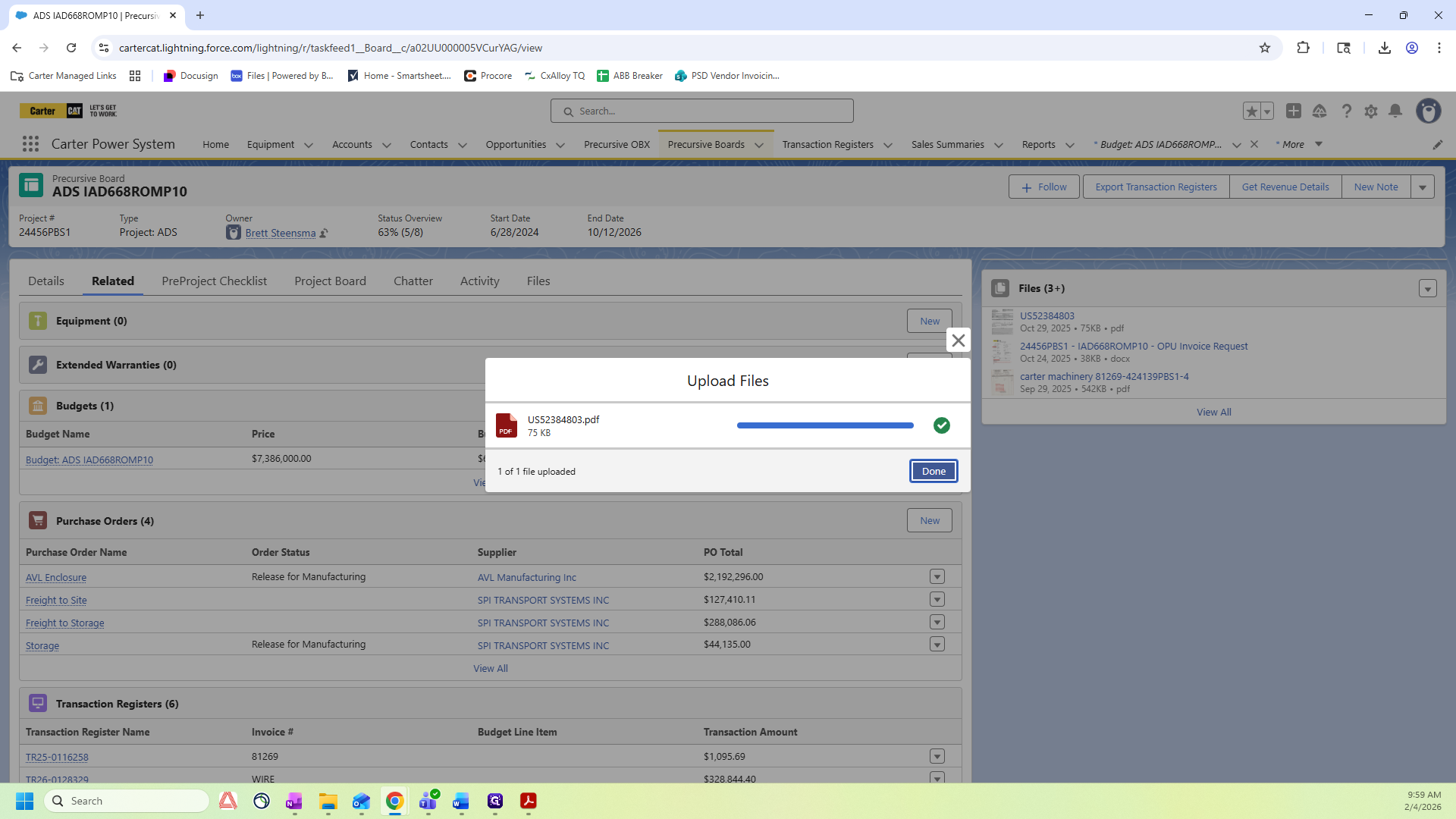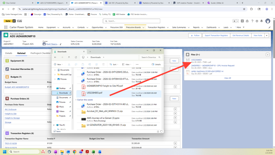 If the purchase order and Budget match, as well as the Need By Date, move on to the next steps. Steps 7-10 walk through how to attach a PDF copy of the purchase order to the Salesforce Board.