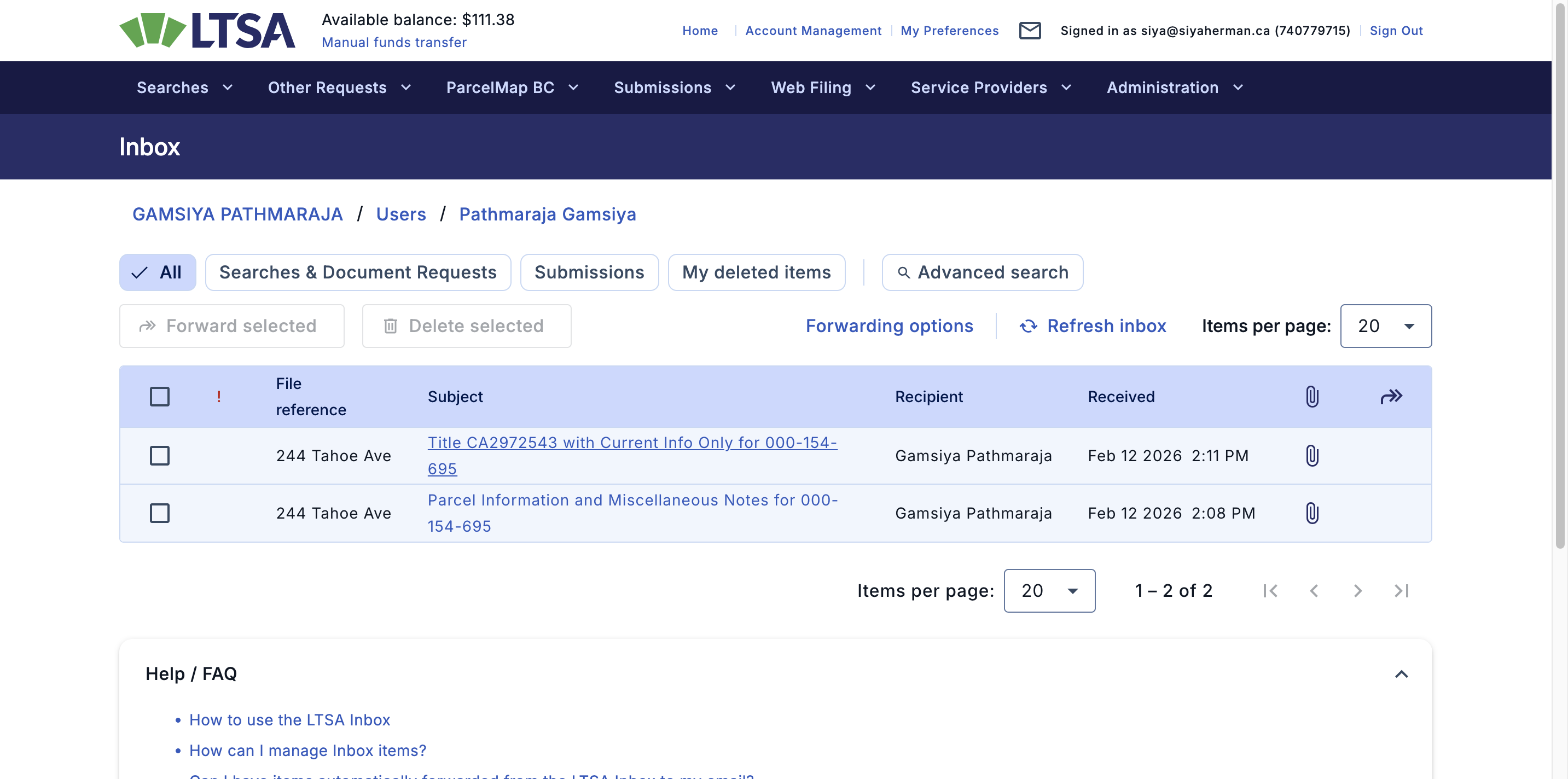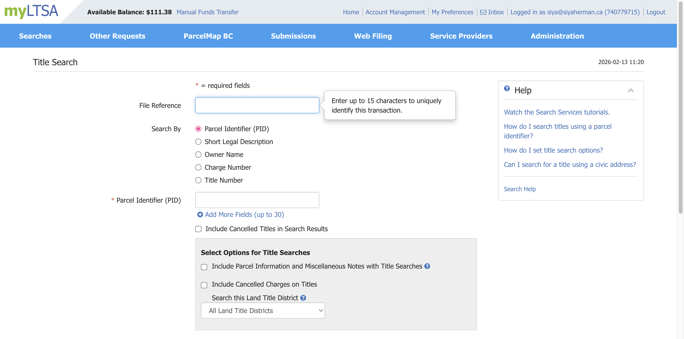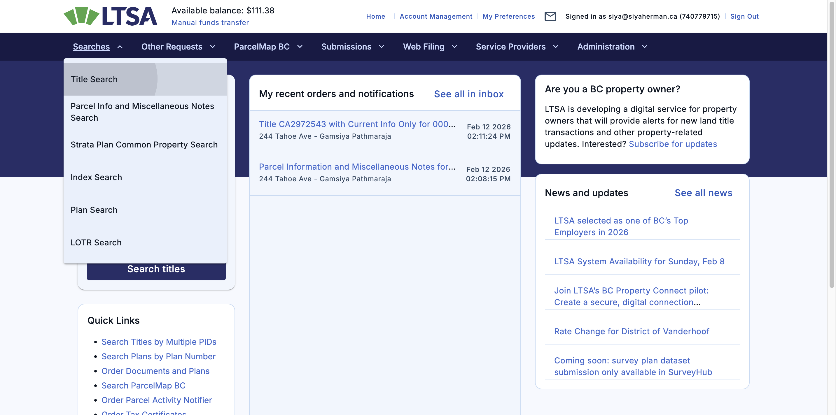 Hi, I'll show you how to pull the property title in LTSA. First, go to these searches. Then, click on "Title Search."