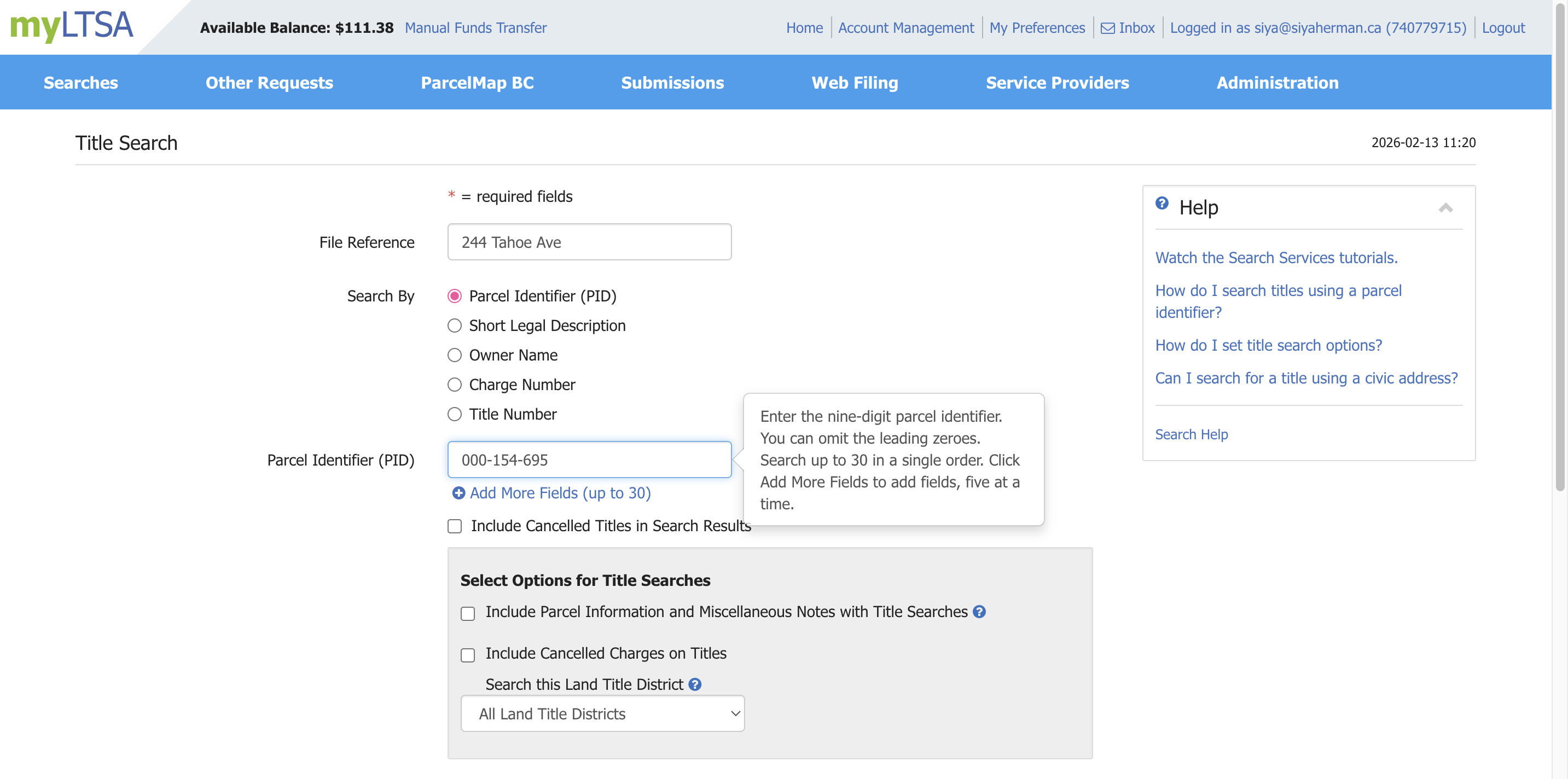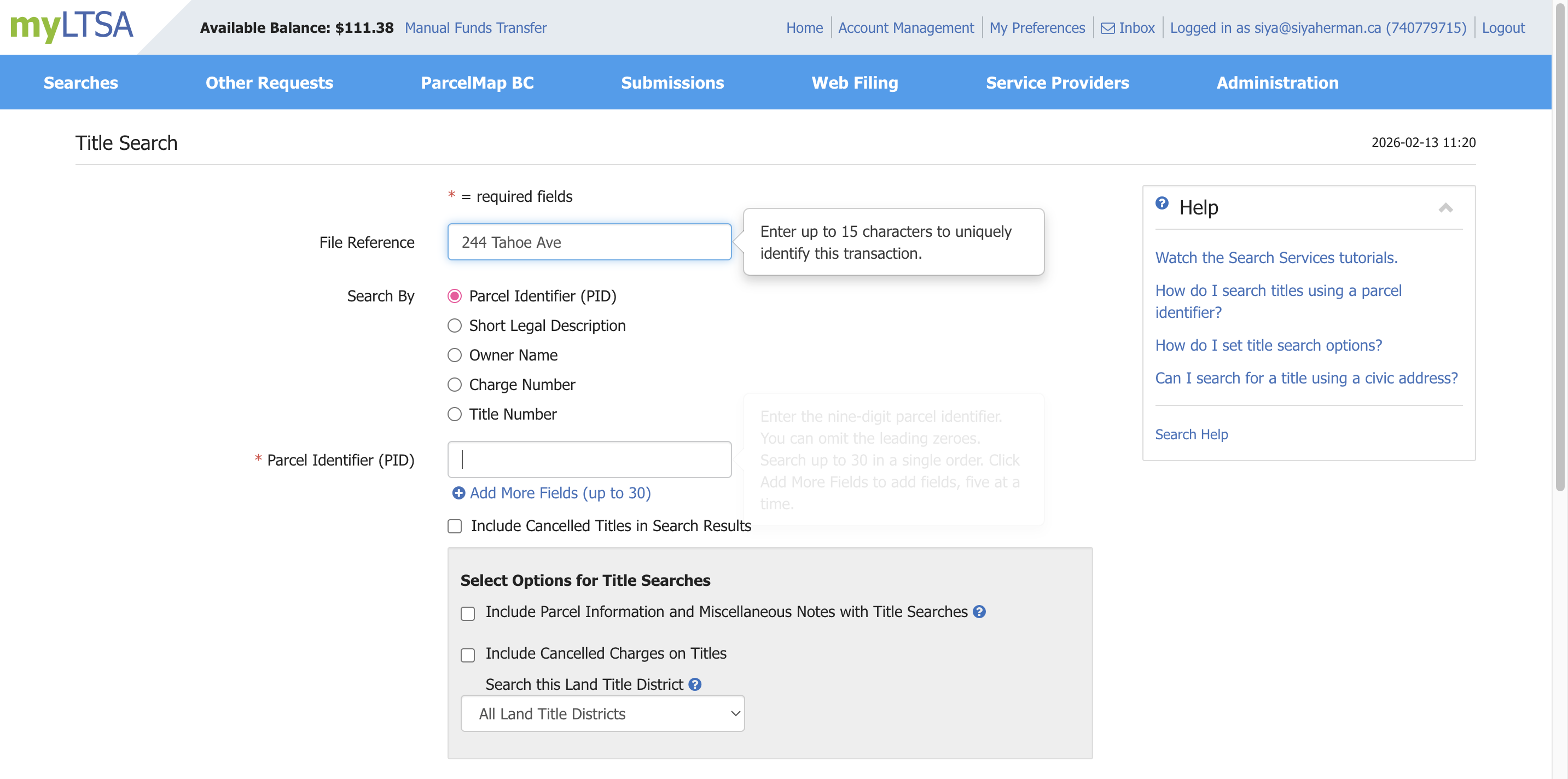 For the file reference, you type the property address. Let's use 244 Tahoe Ave. Then you need to enter the parcel identifier, or PID.