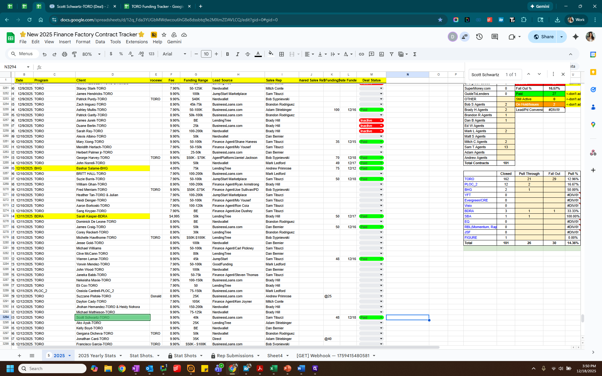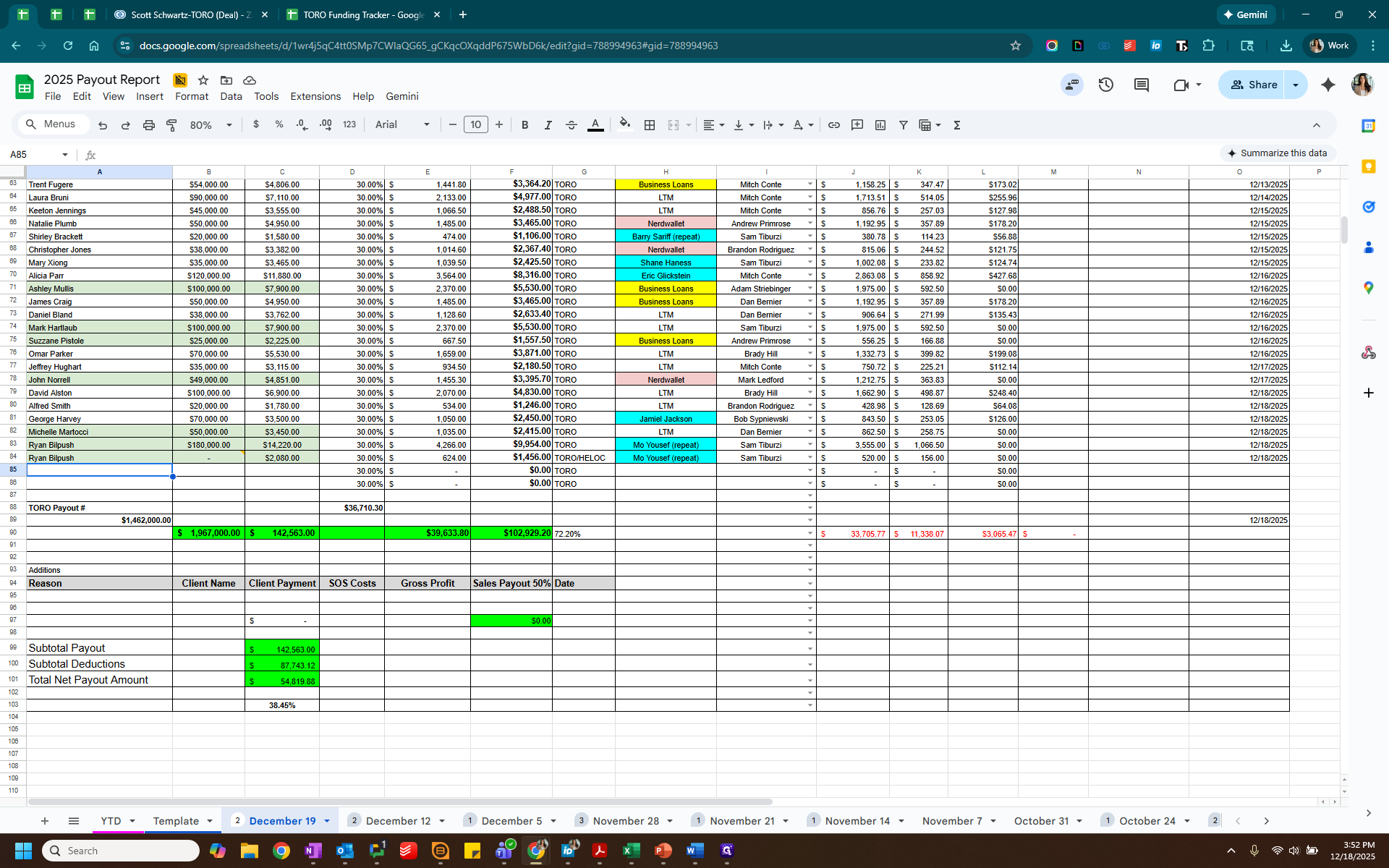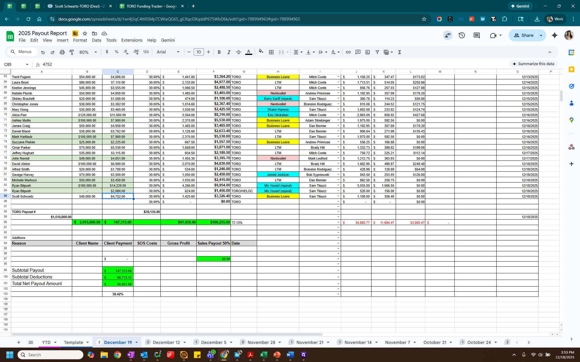 We will enter the same client into the payout tracker and add the relevant information. Client Name, invoiced amount, client payment. Add the lead source and rep.