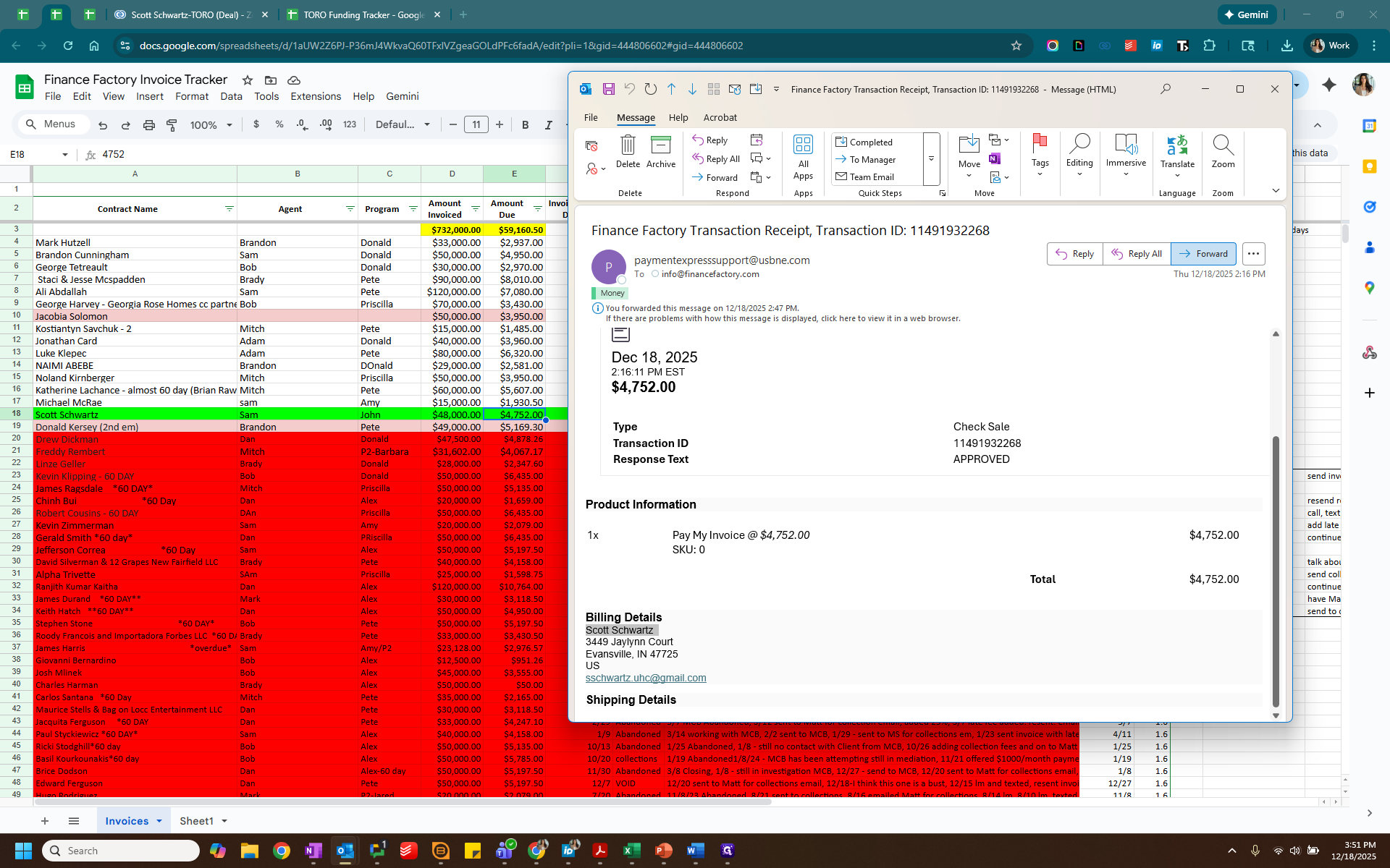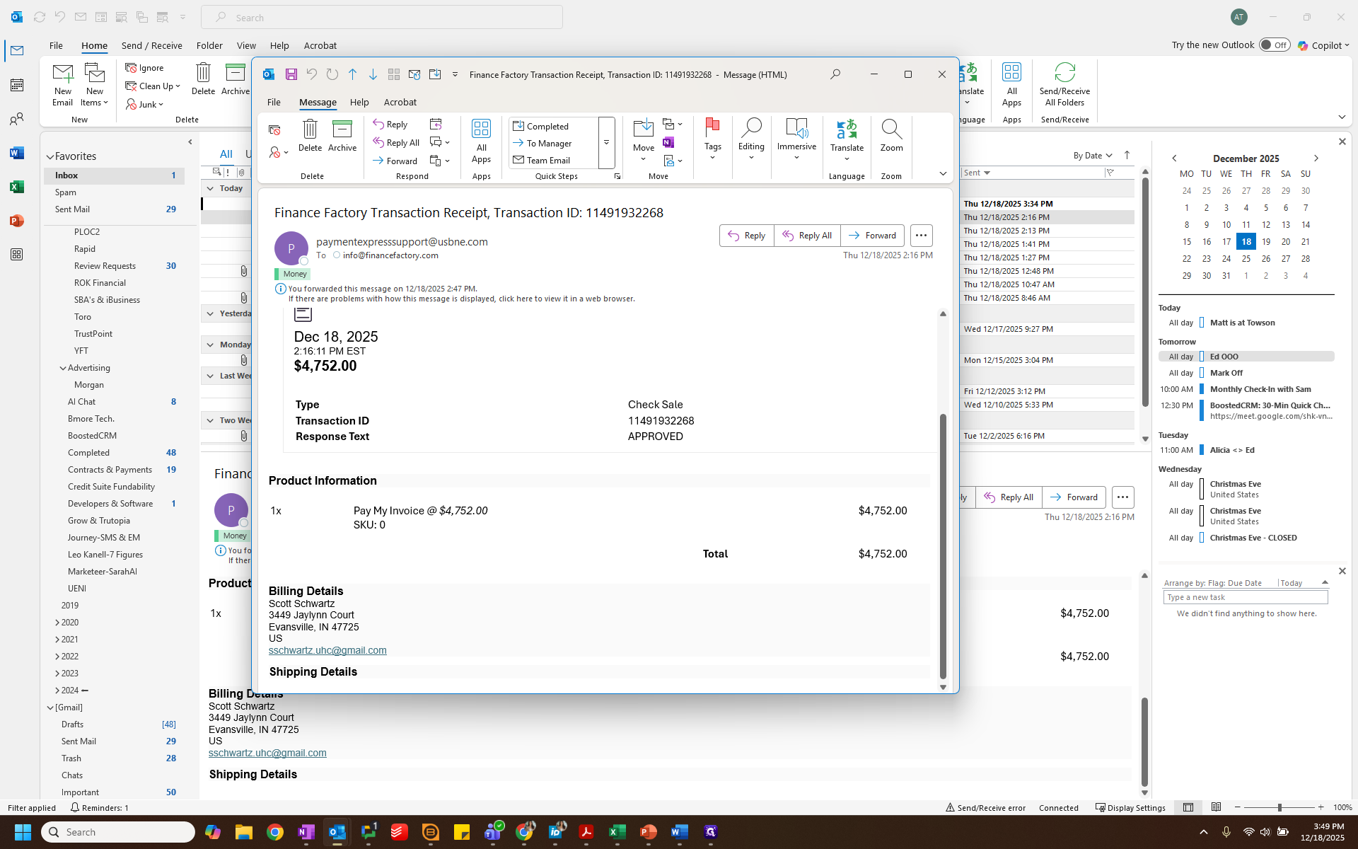 We can check the email to see the amount, which is $4752.00