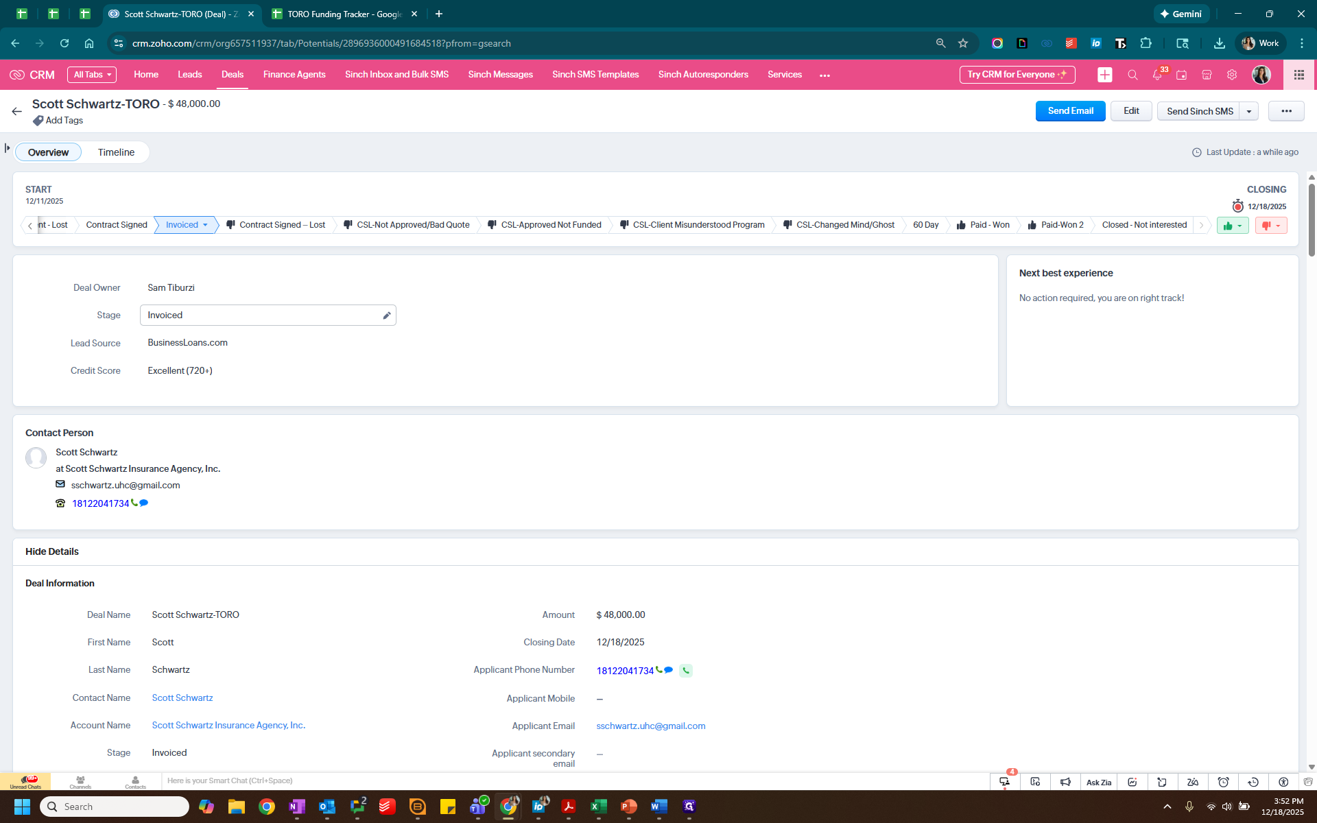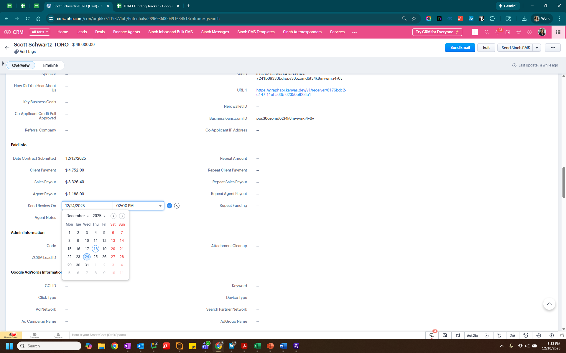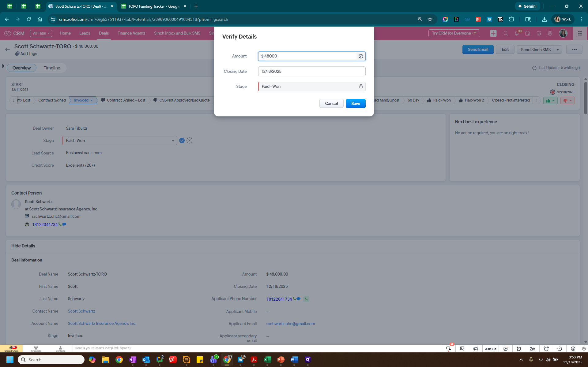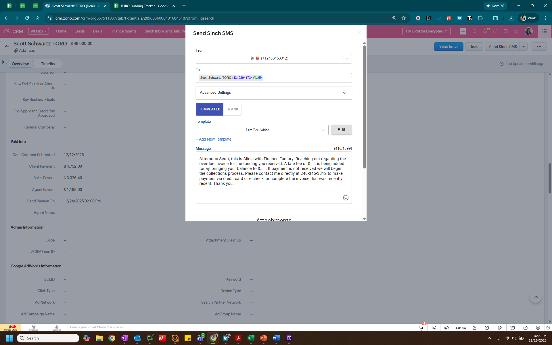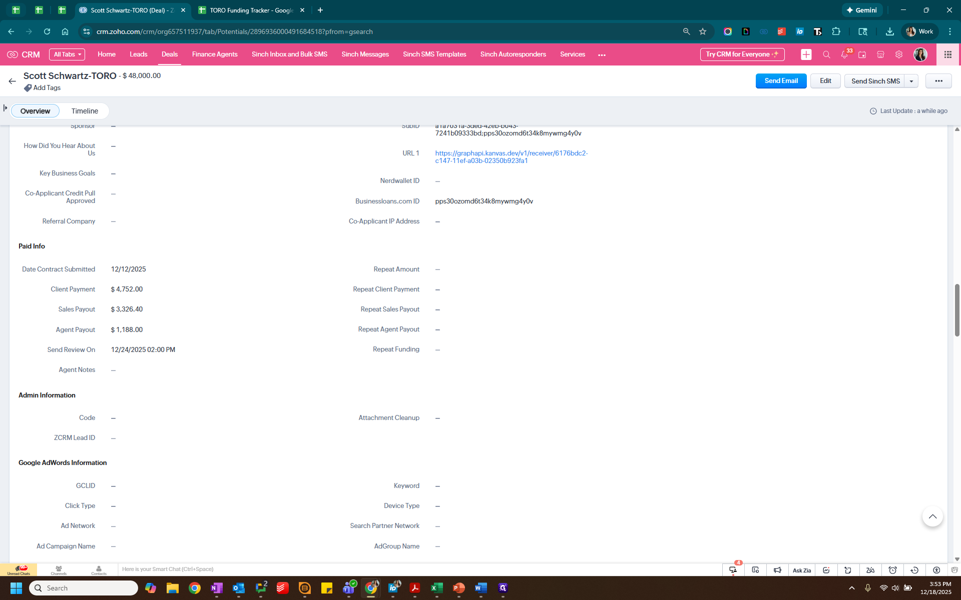 We know that it is Sam. Since it was paid by check, we will delete these credit card fees. Next, we will go into Zoho to check the lead source, which is business loans, and add that information here.