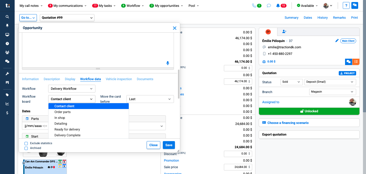 Learn step-by-step how to send a card to the workflow after marking a quote as sold, including updating client meeting information and selecting the appropriate workflow and column.