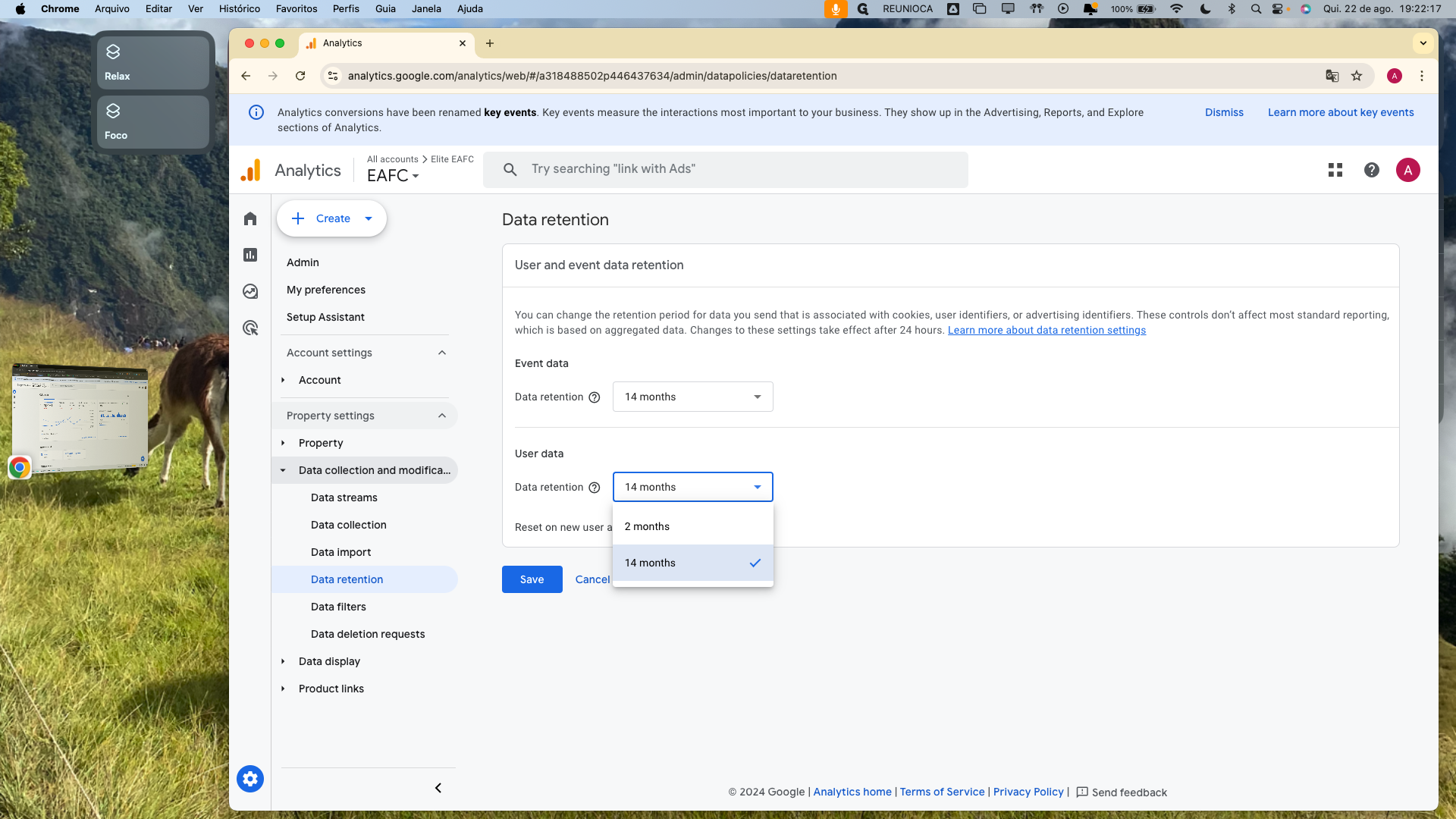Alright, we are here to set up GA4. The first thing to do is click on the gear icon at the bottom. Go to Data Streams. Click on Site. Close this option if it appears. Click on Edit Stream Details. Enter the correct address here. Click on Update Stream. Click on the gear icon in Enhanced Measurement. Disable all items here and save. Click on Configure Tag Settings. Click on Manage Automatic Event Detection. Uncheck all these items and save. Close. Close this, click on Data Collection. Enable all three available fields here, here, and here. In Data Retention, change to 14 months and save.