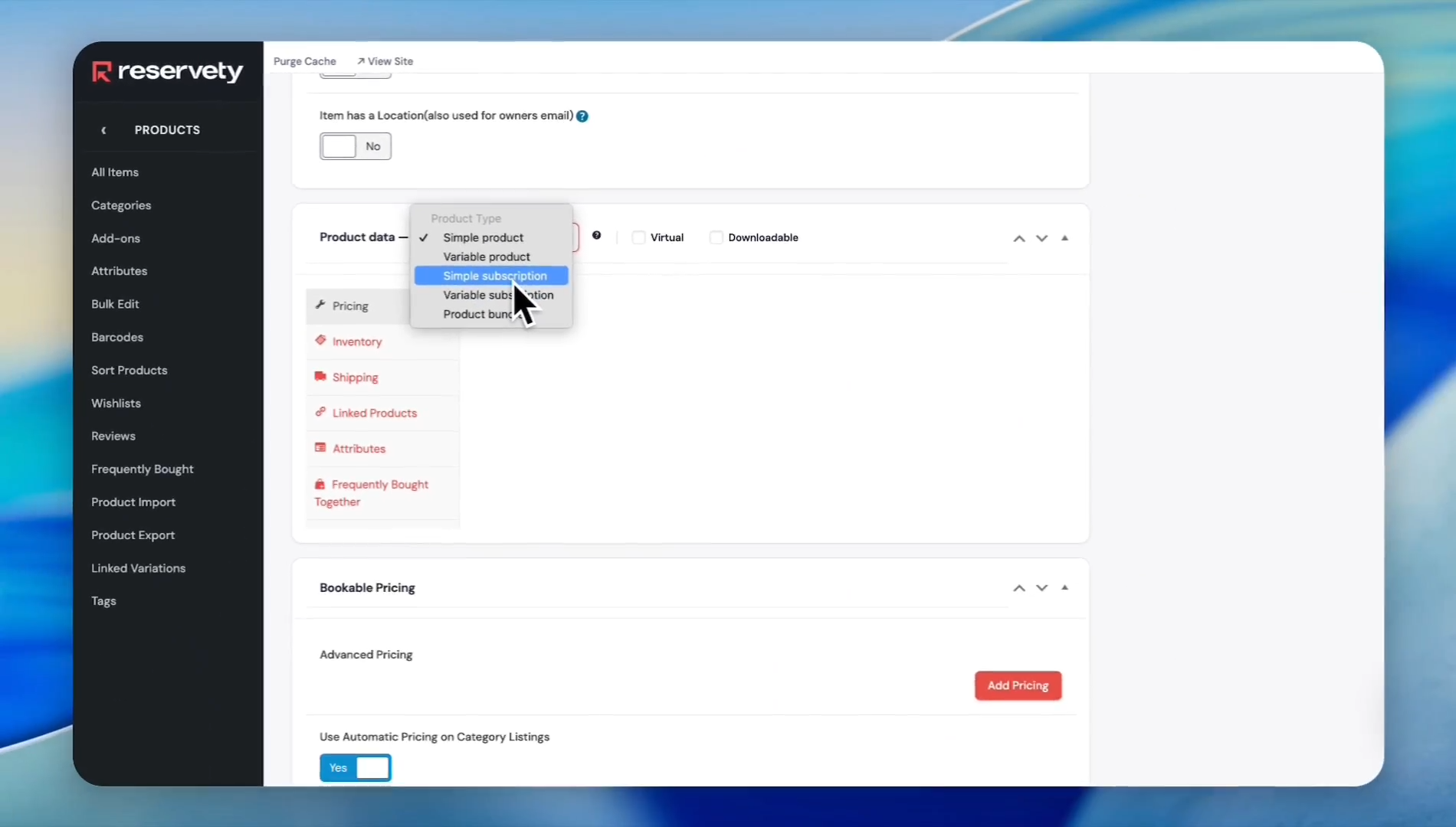 In the Product Data section, select Simple subscription from the dropdown menu
