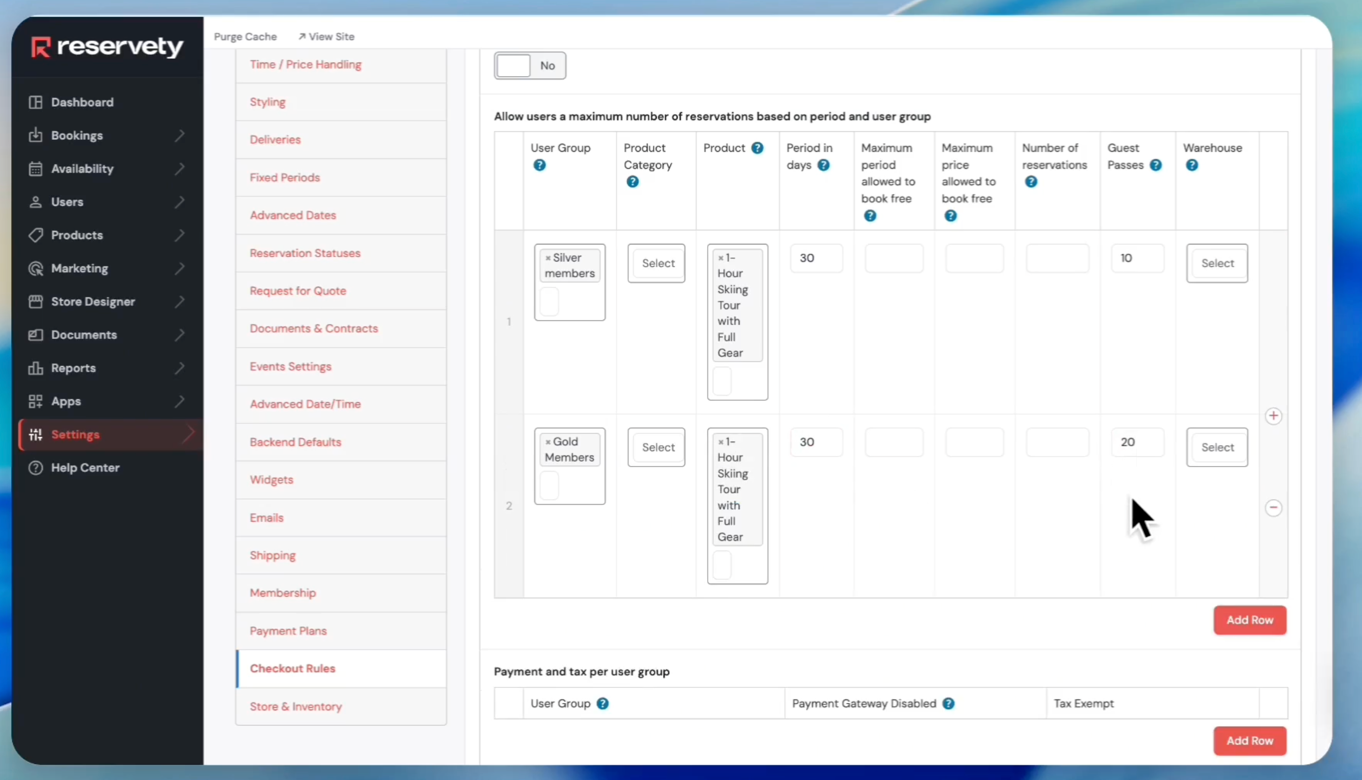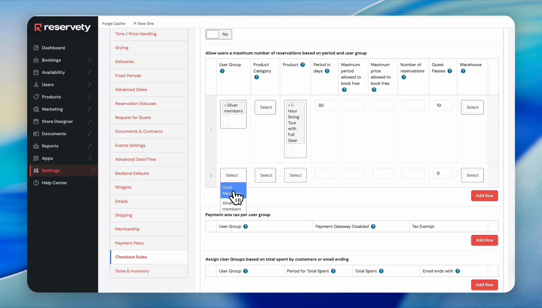 Enter 30 into the Period in days field to restrict the timeframe. Enter 10 into the Guest Passes field. Click Add Row to add a separate configuration for Gold Members.