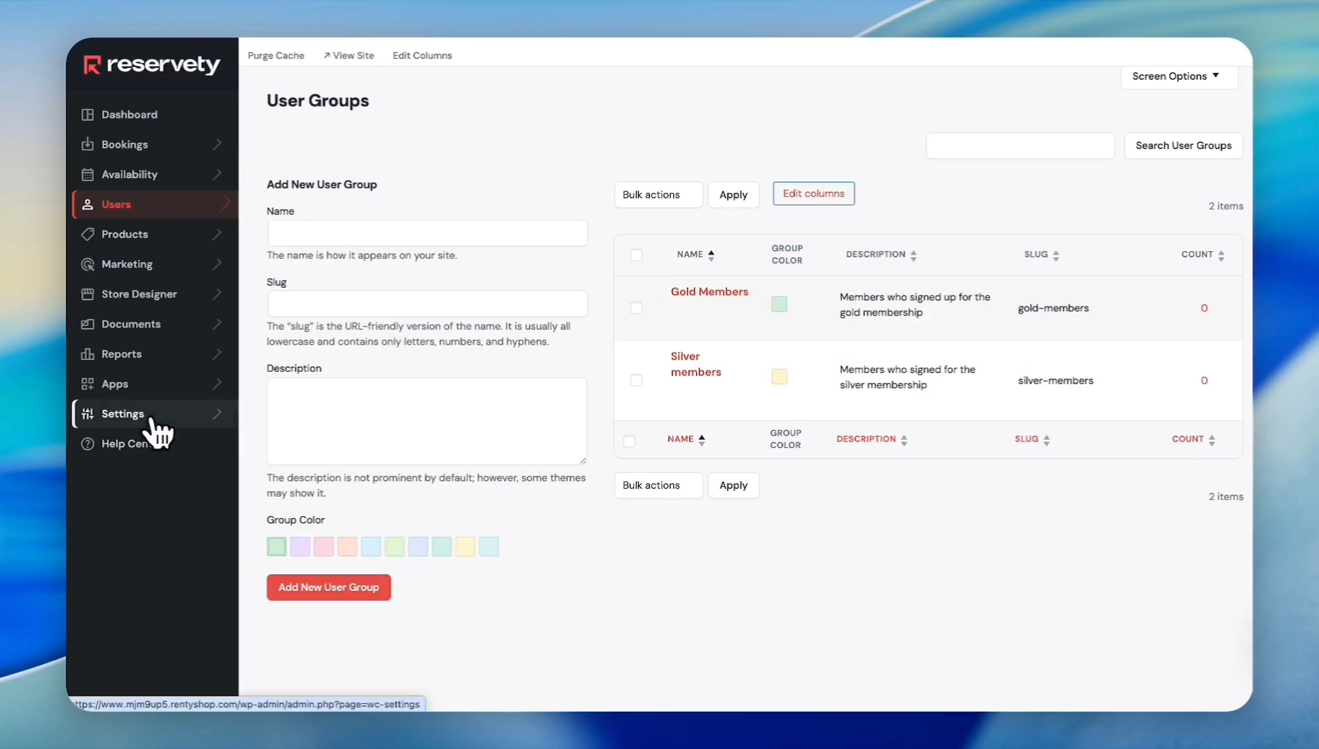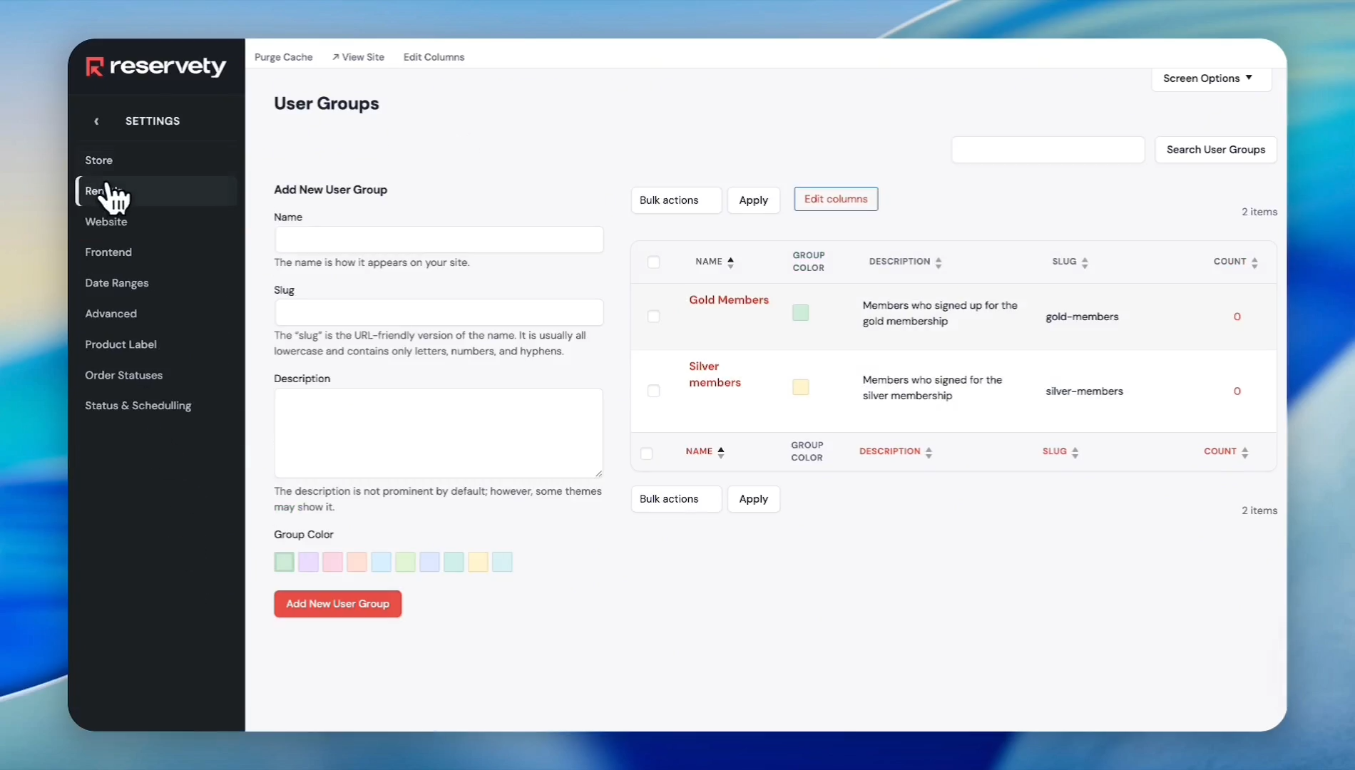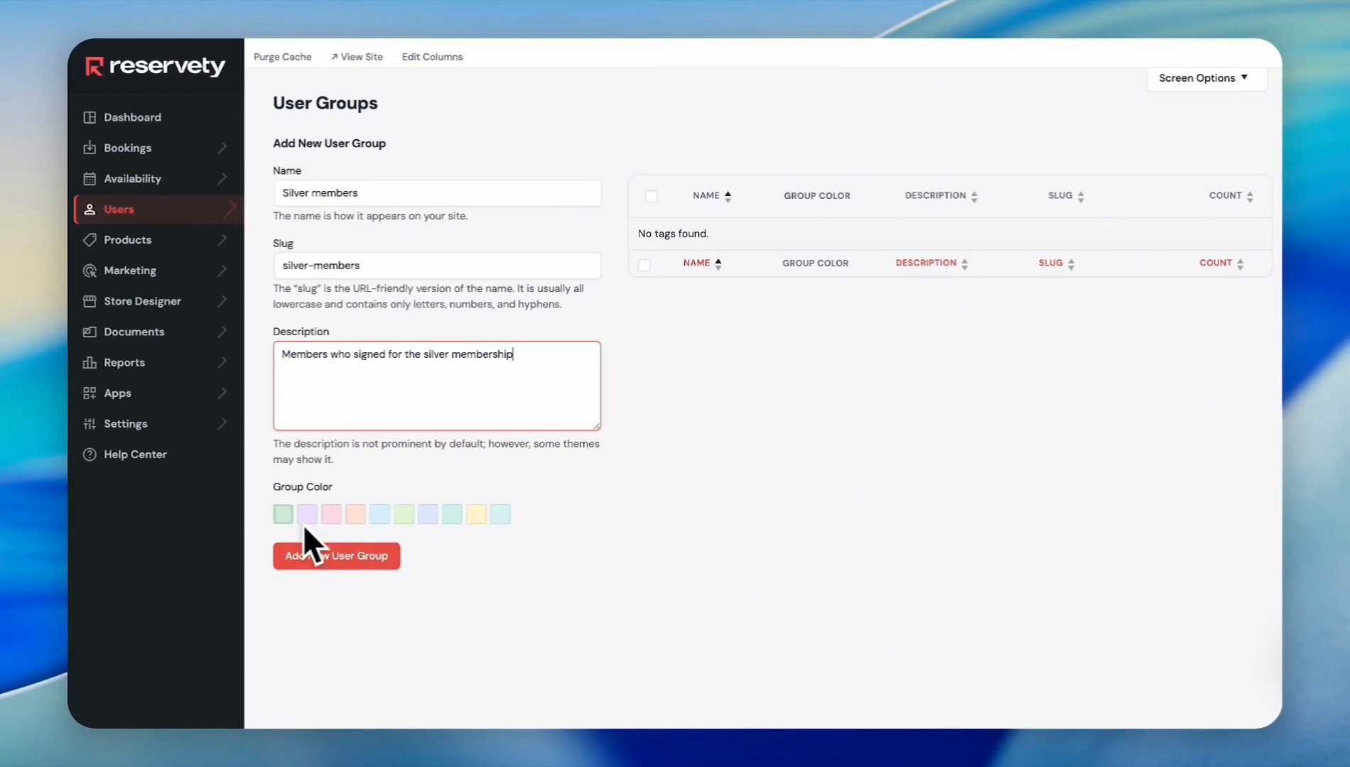 Enter a group name (e.g., Silver Members), a slug, and a brief description. Select a color for the user group, then click Add New User Group