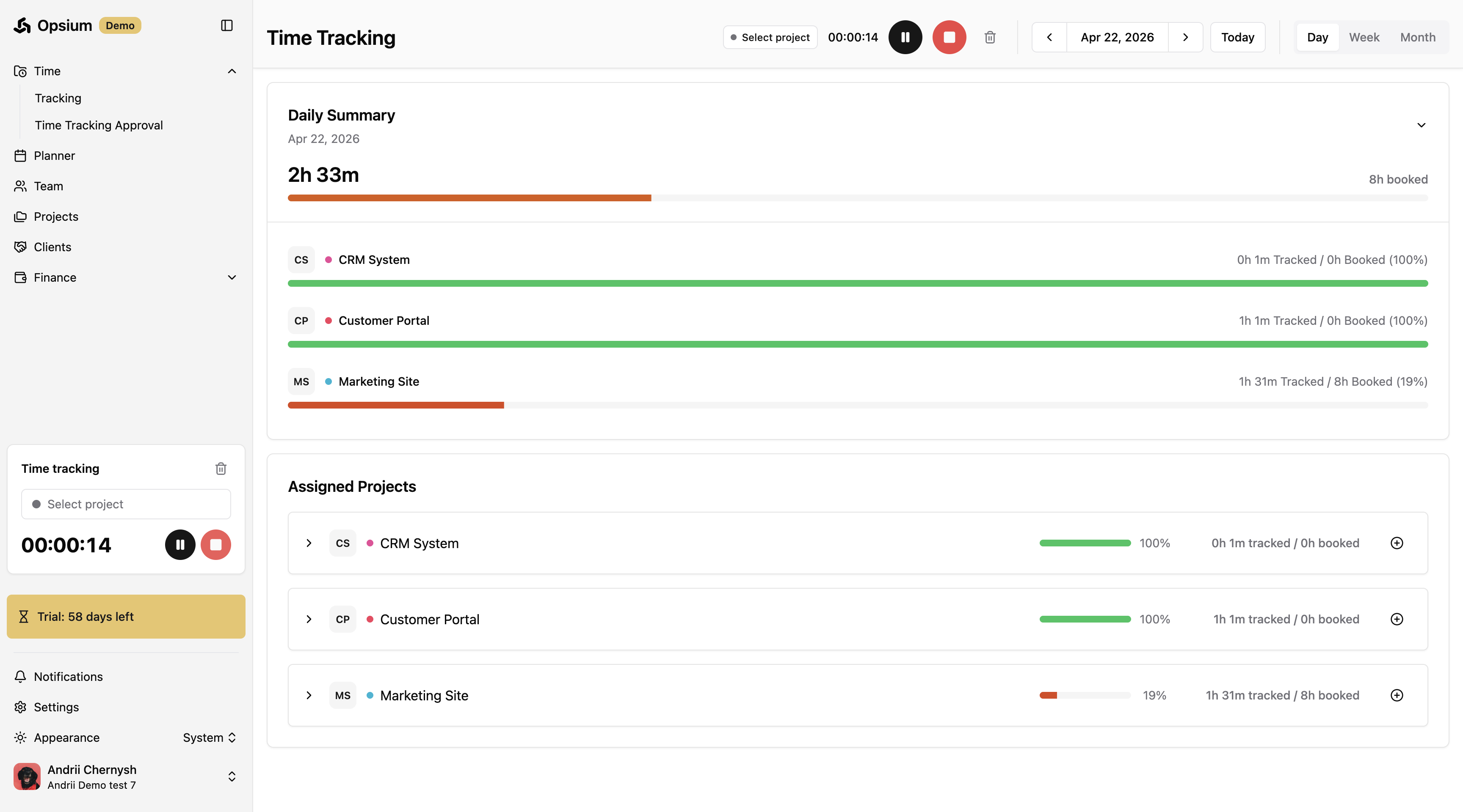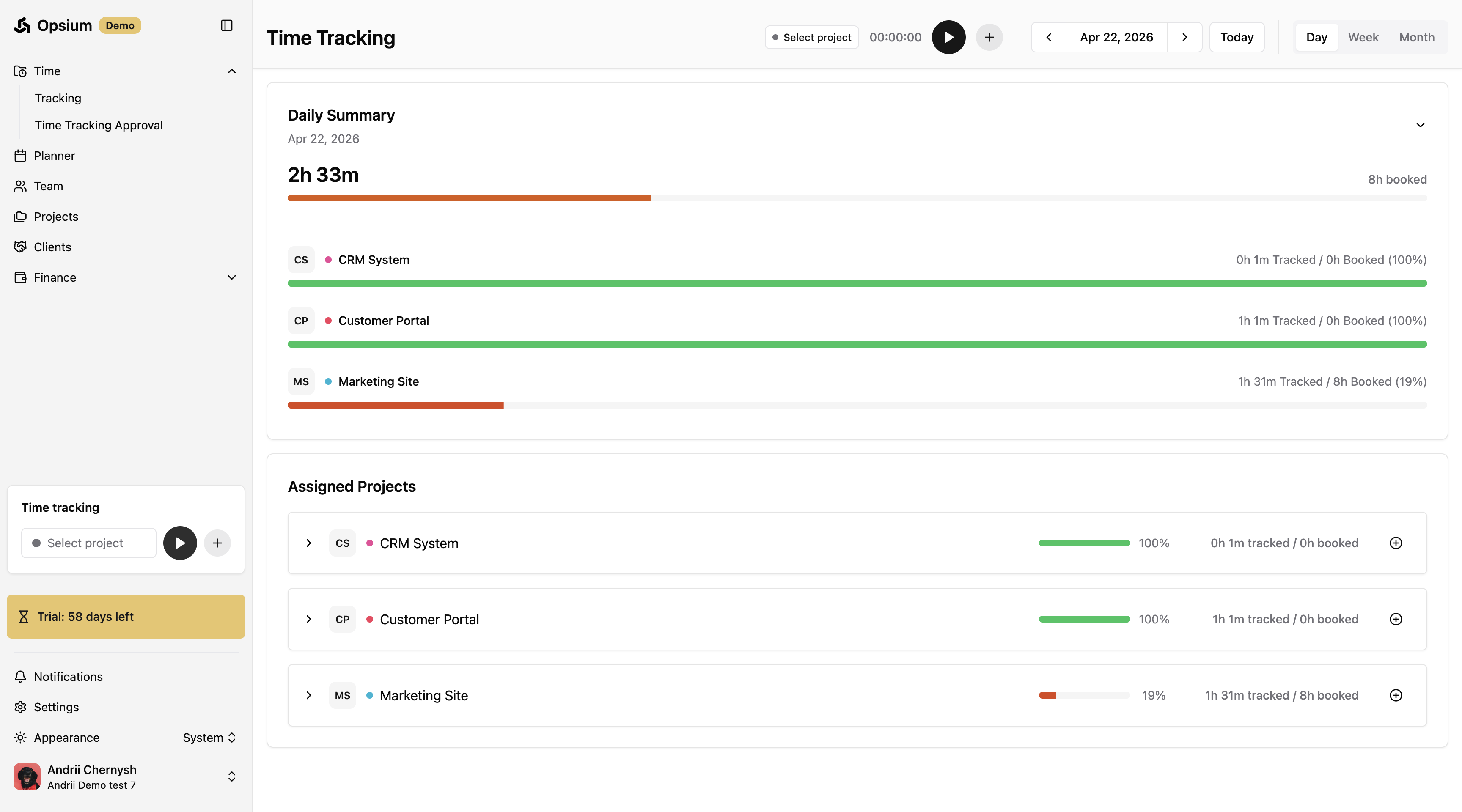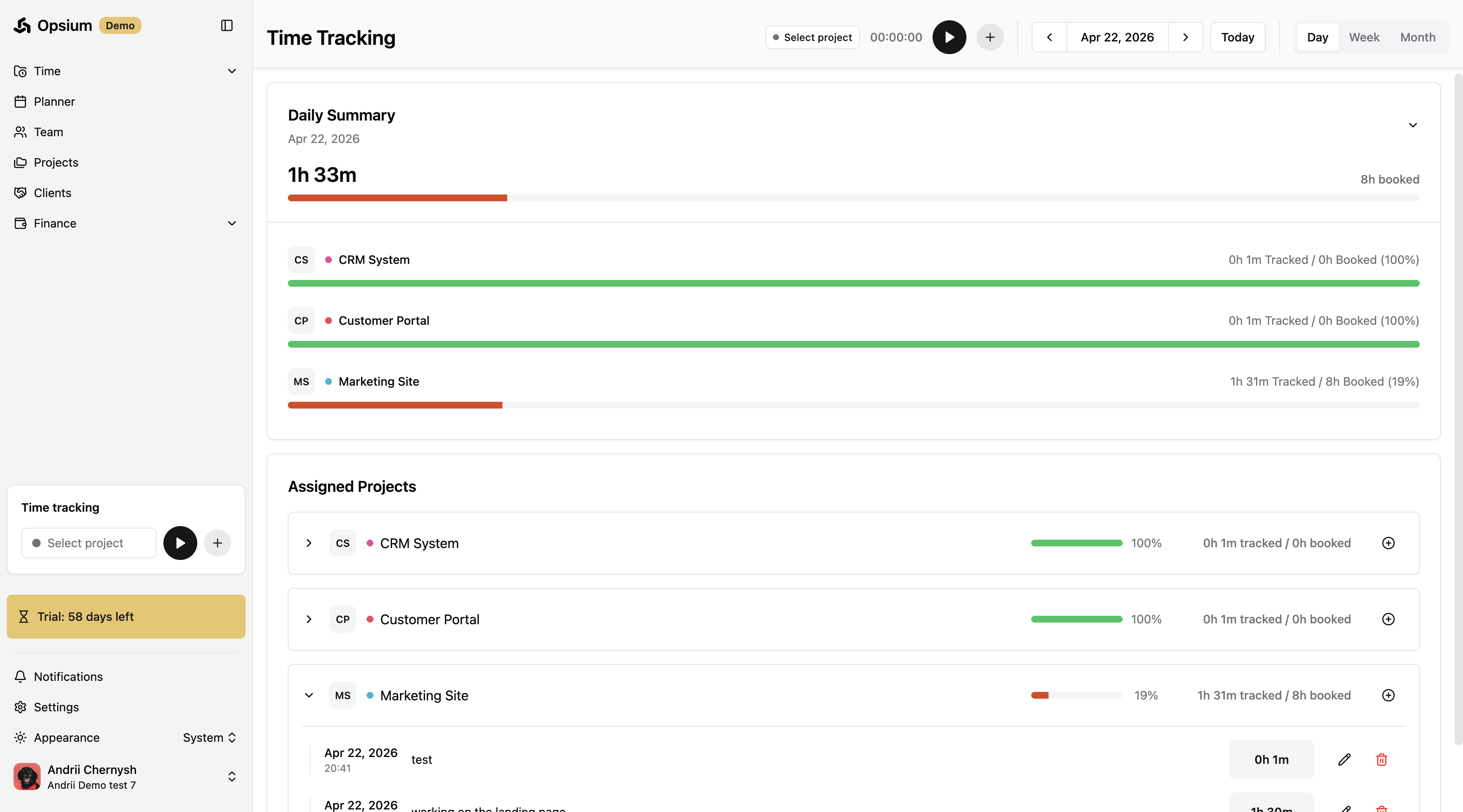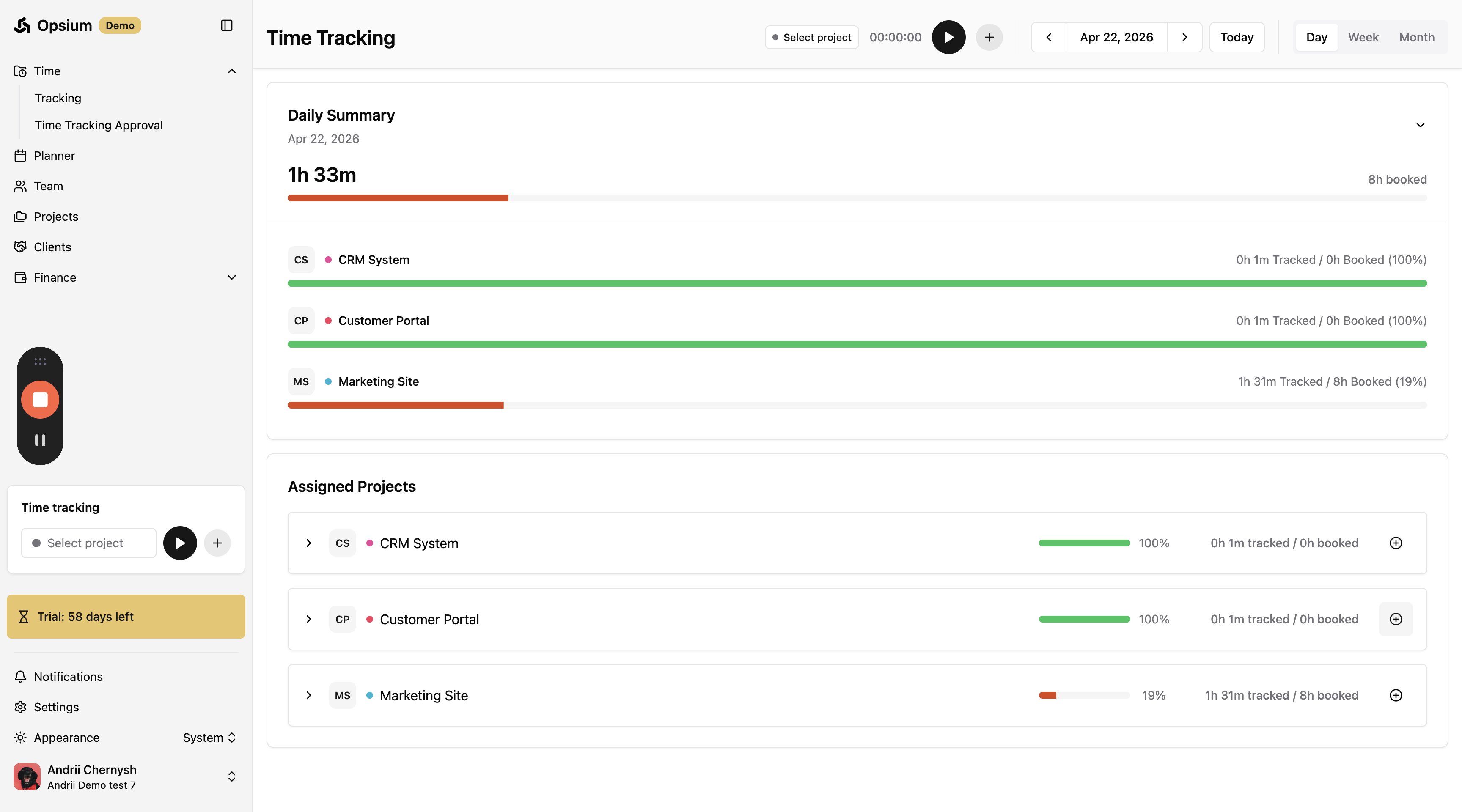 Opsium makes it easy to log your work hours. You can view your assigned projects, manually add a fixed amount of time, or use the live timer to track work as you go.