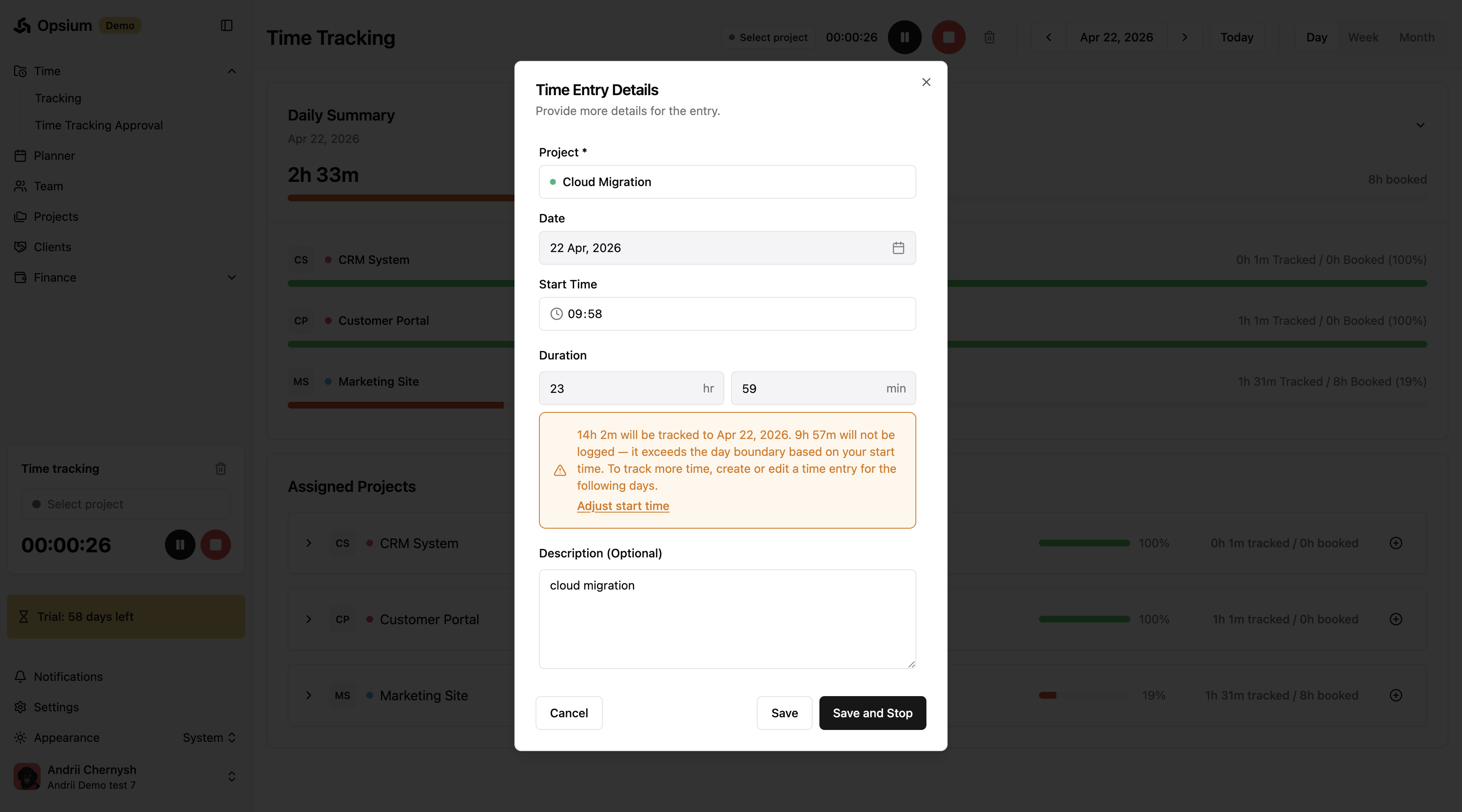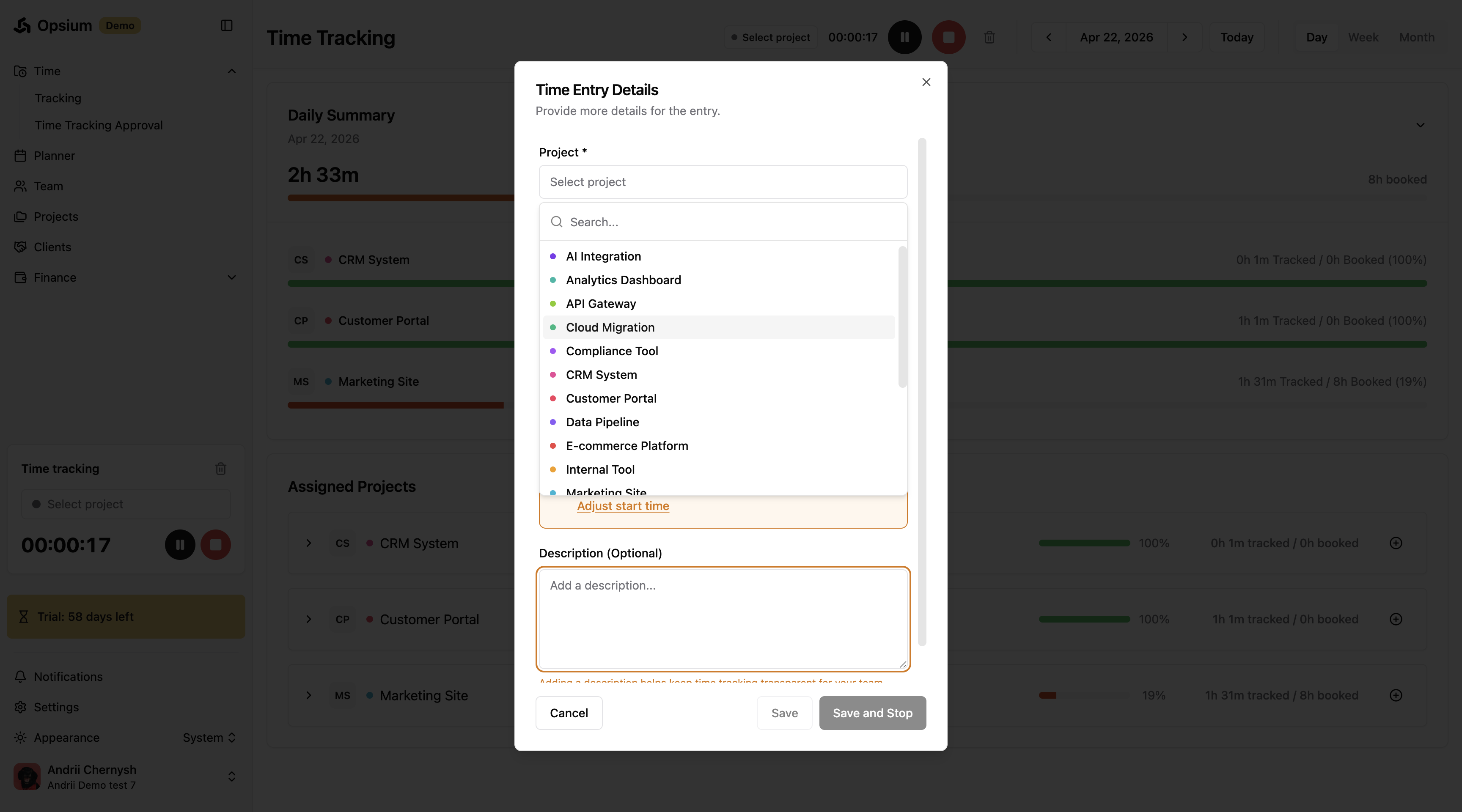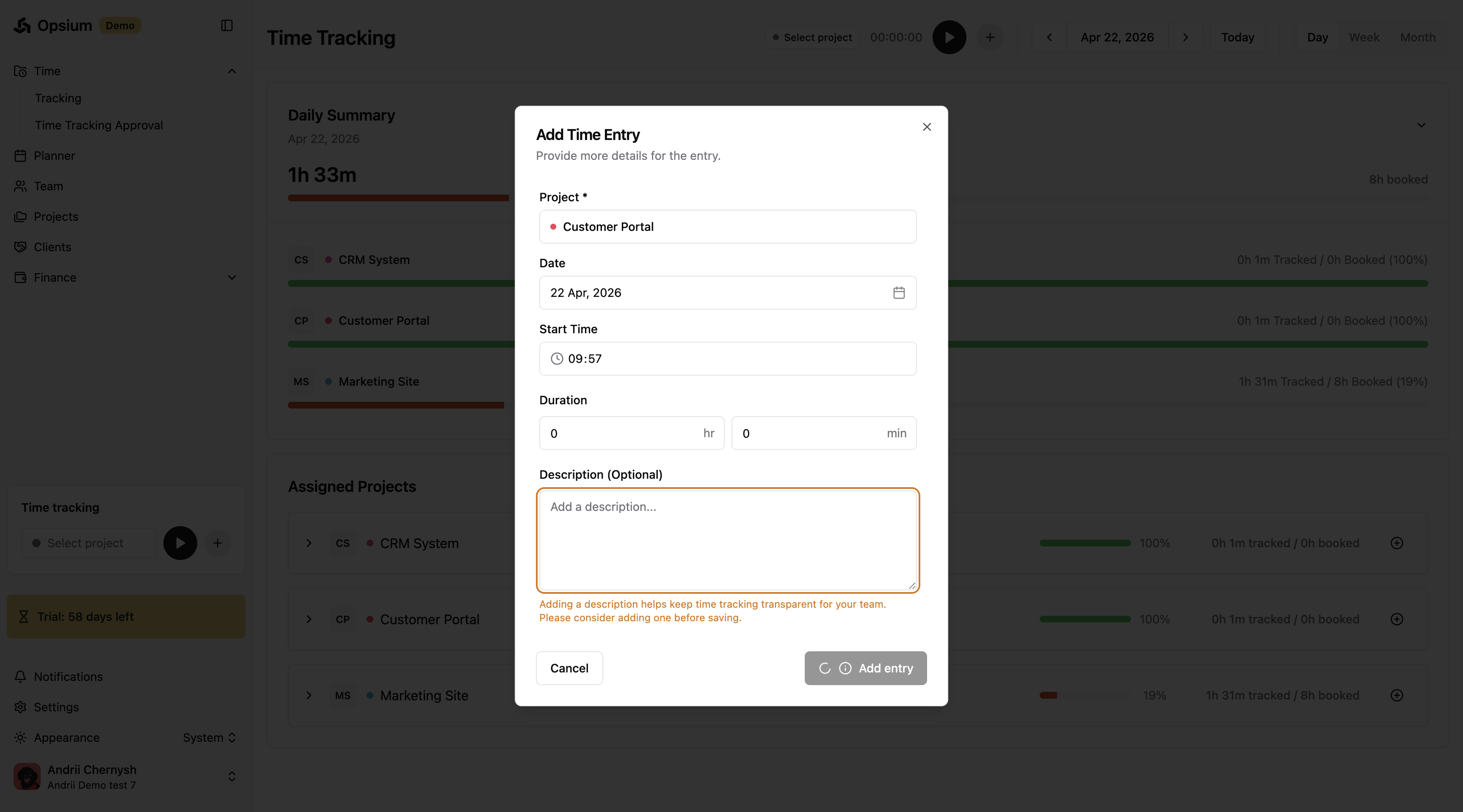 Learn how to easily log your work hours in Opsium using manual time entries, the project dashboard, or the live timer feature.