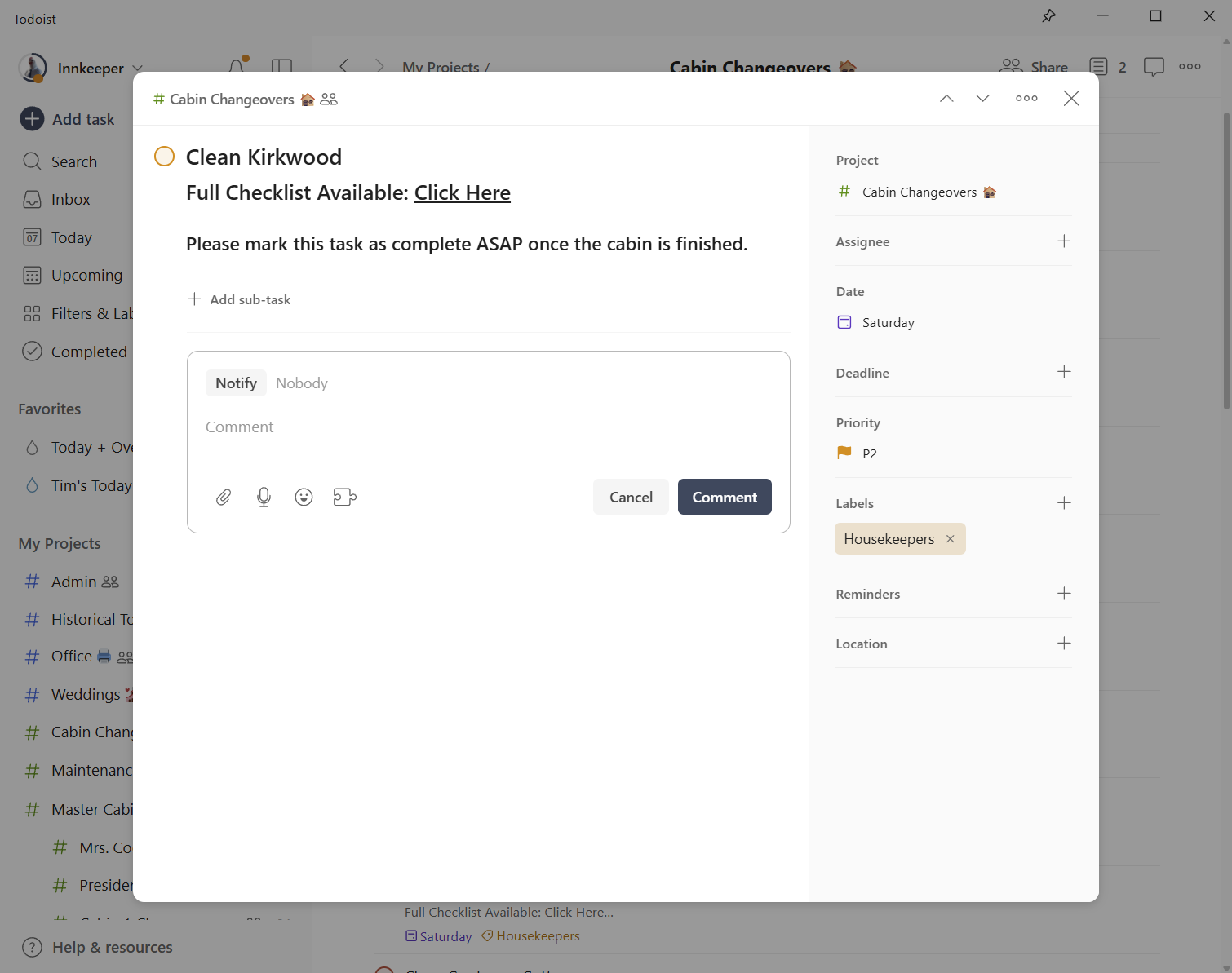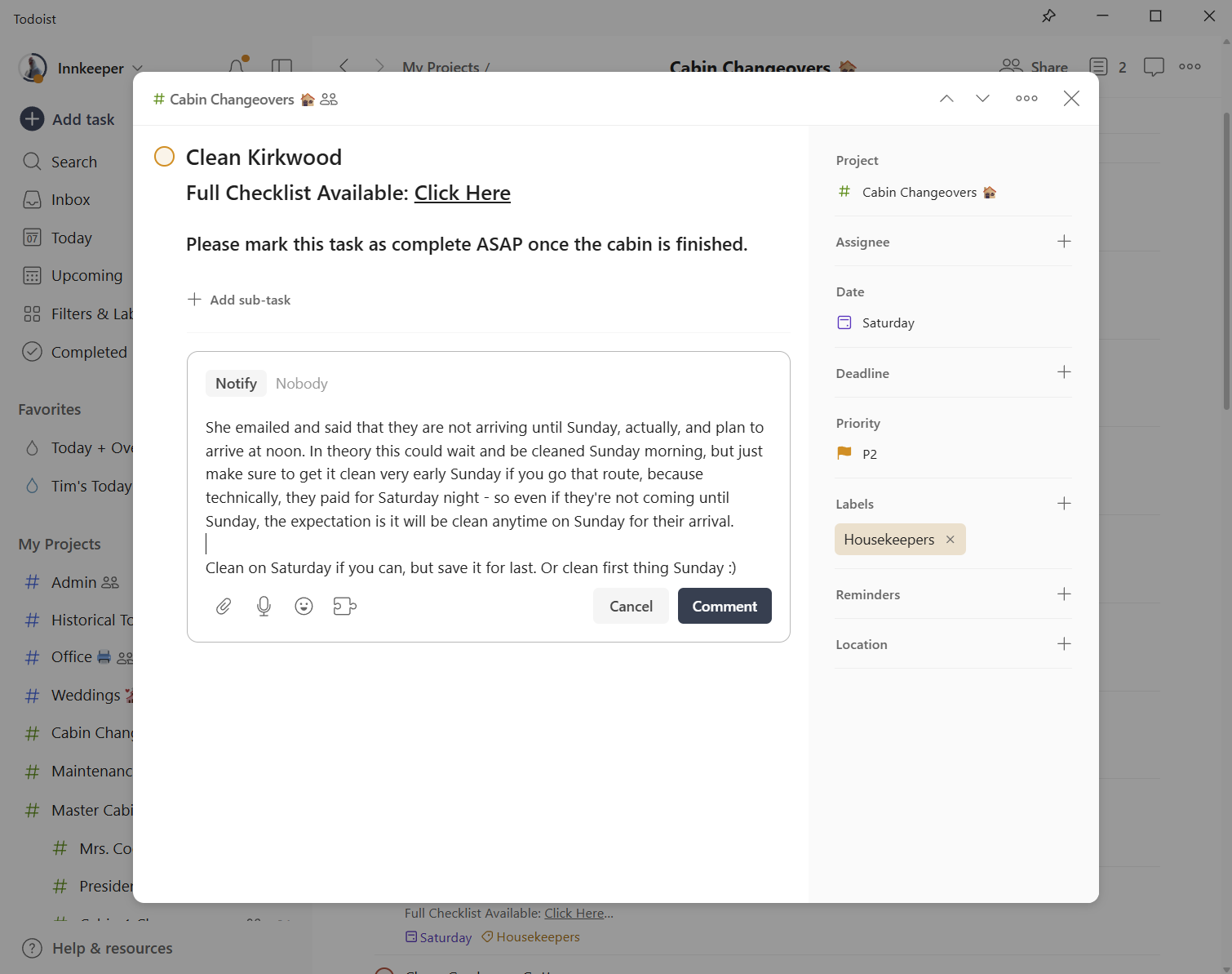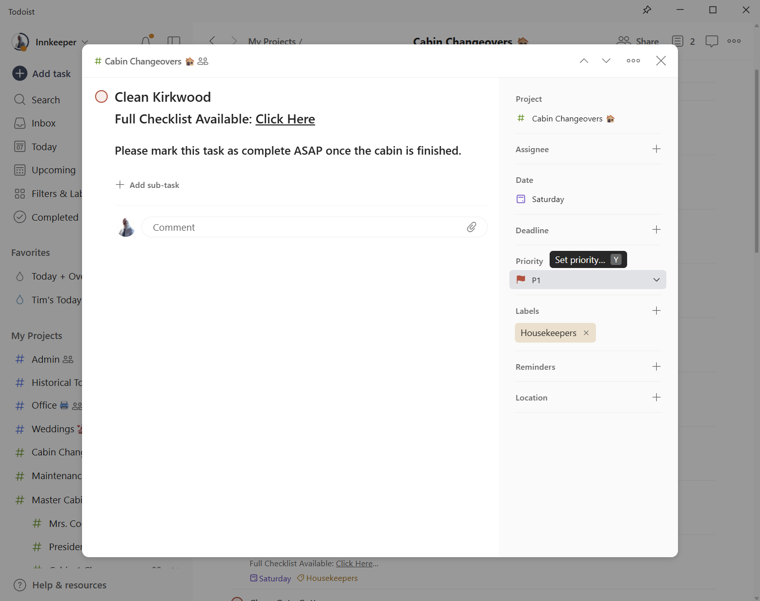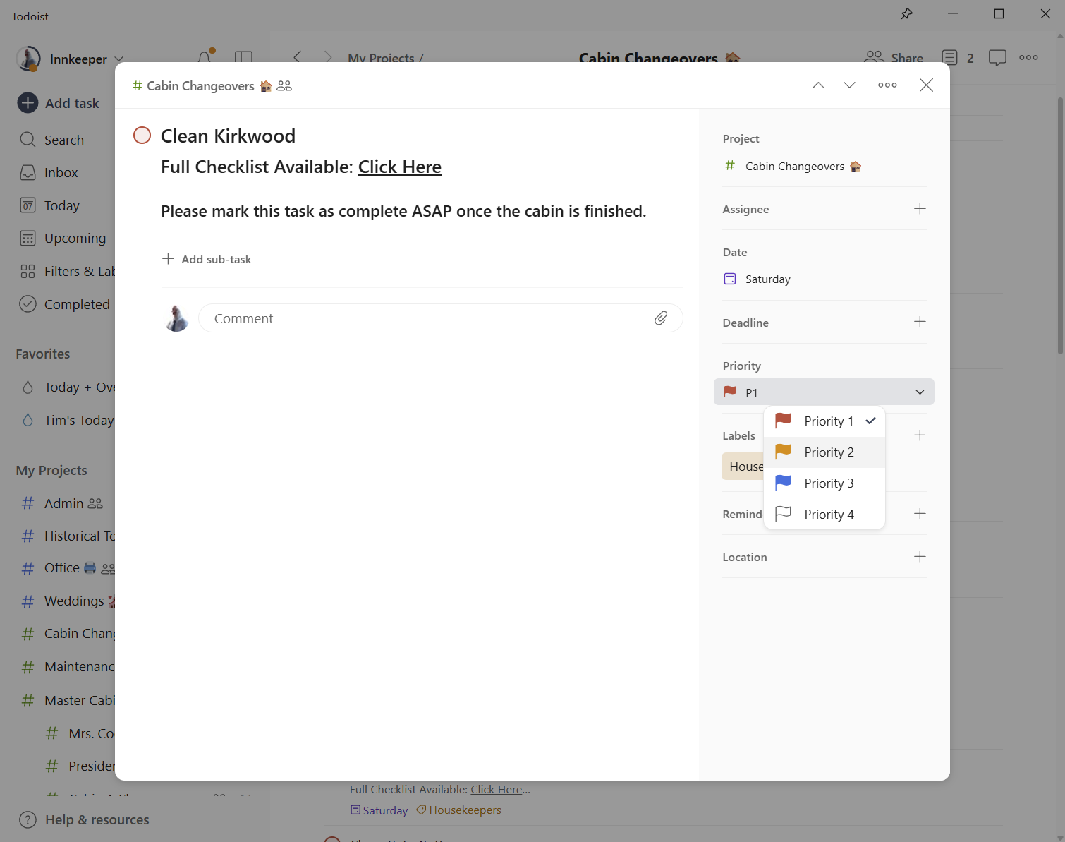 In this guide, we'll learn how to update task priorities and leave helpful comments in Todoist when plans change for cabin changeovers. Adjusting priorities and adding notes ensures everyone involved has the latest information and can plan their work more efficiently.