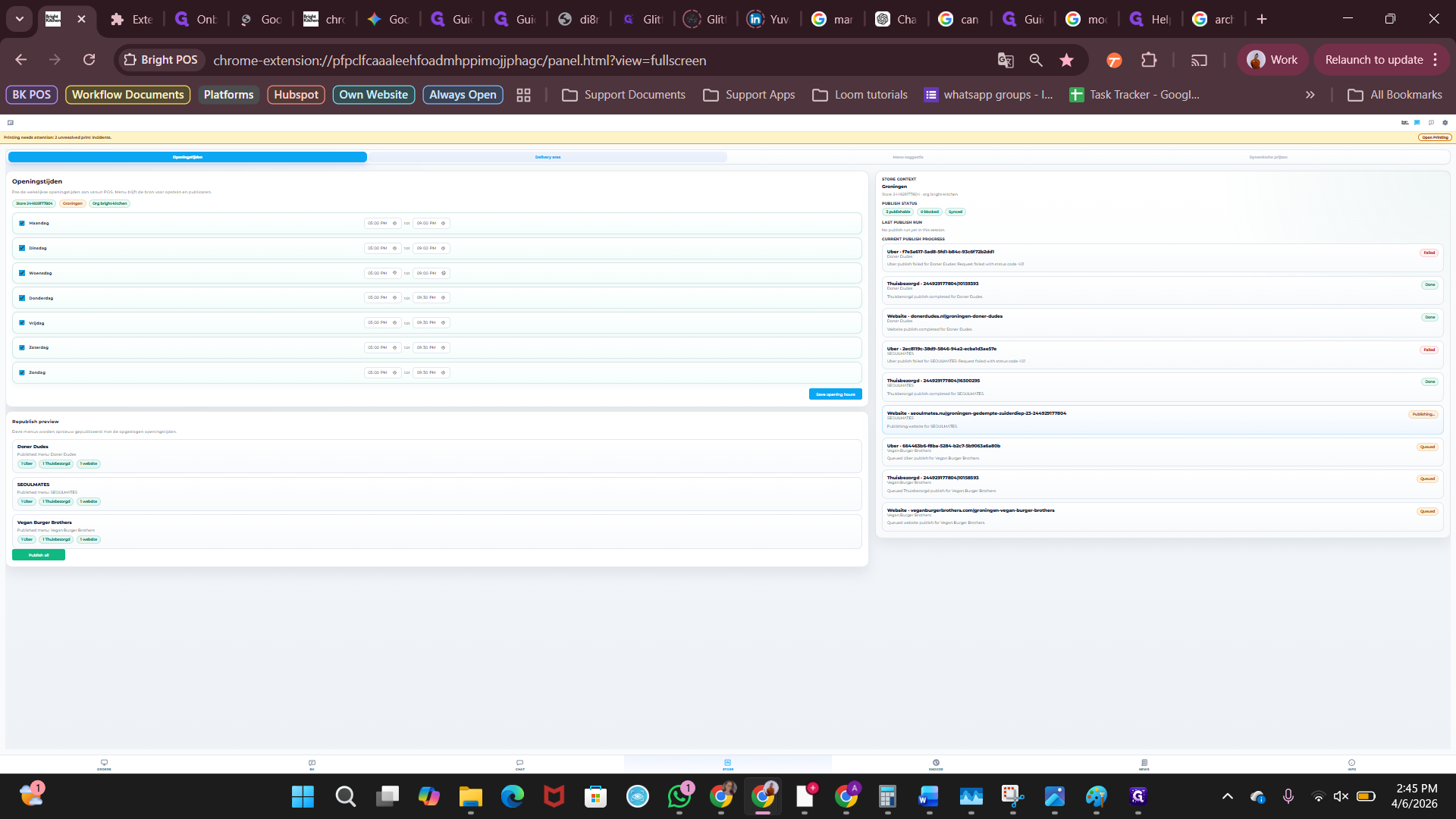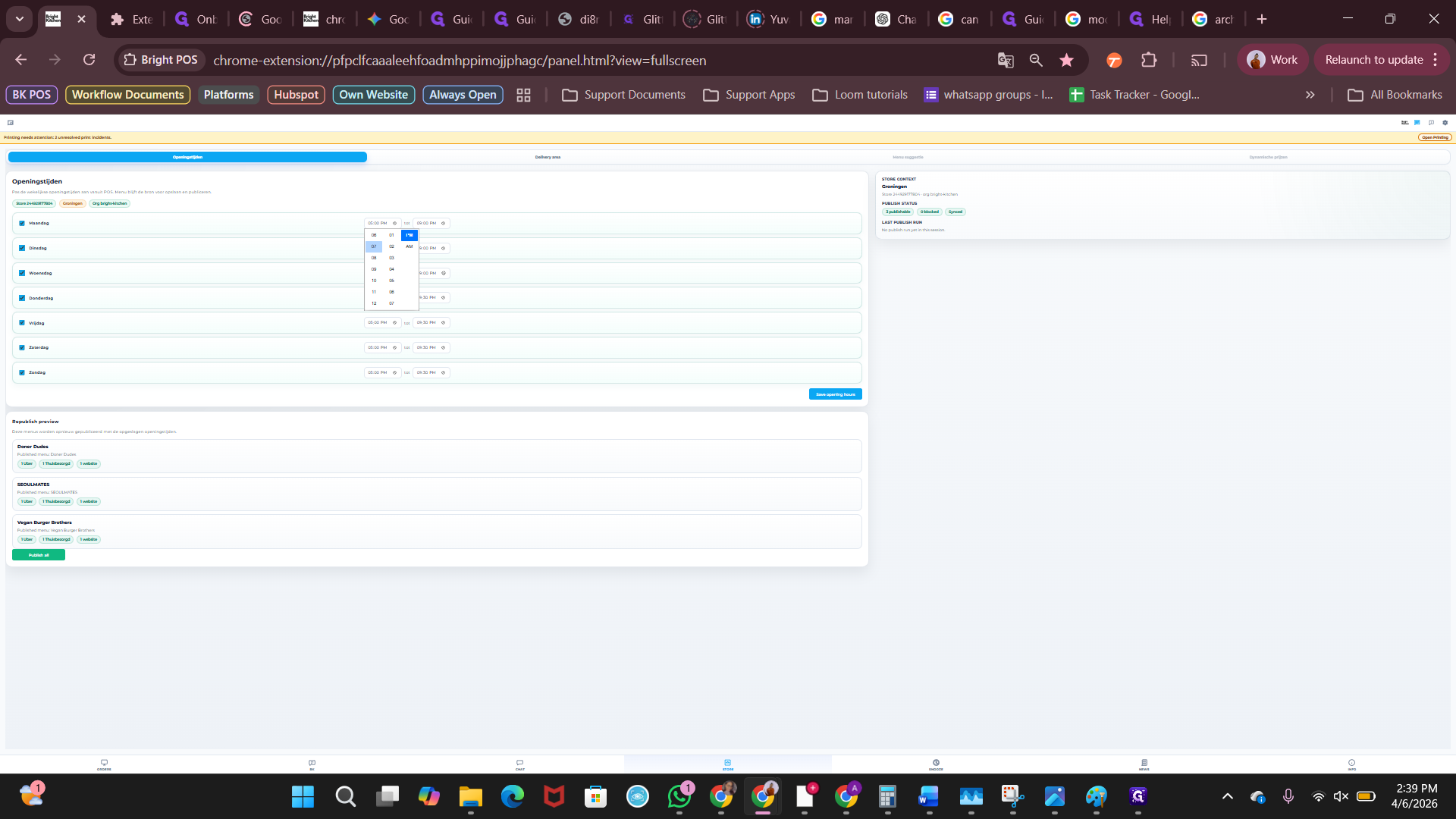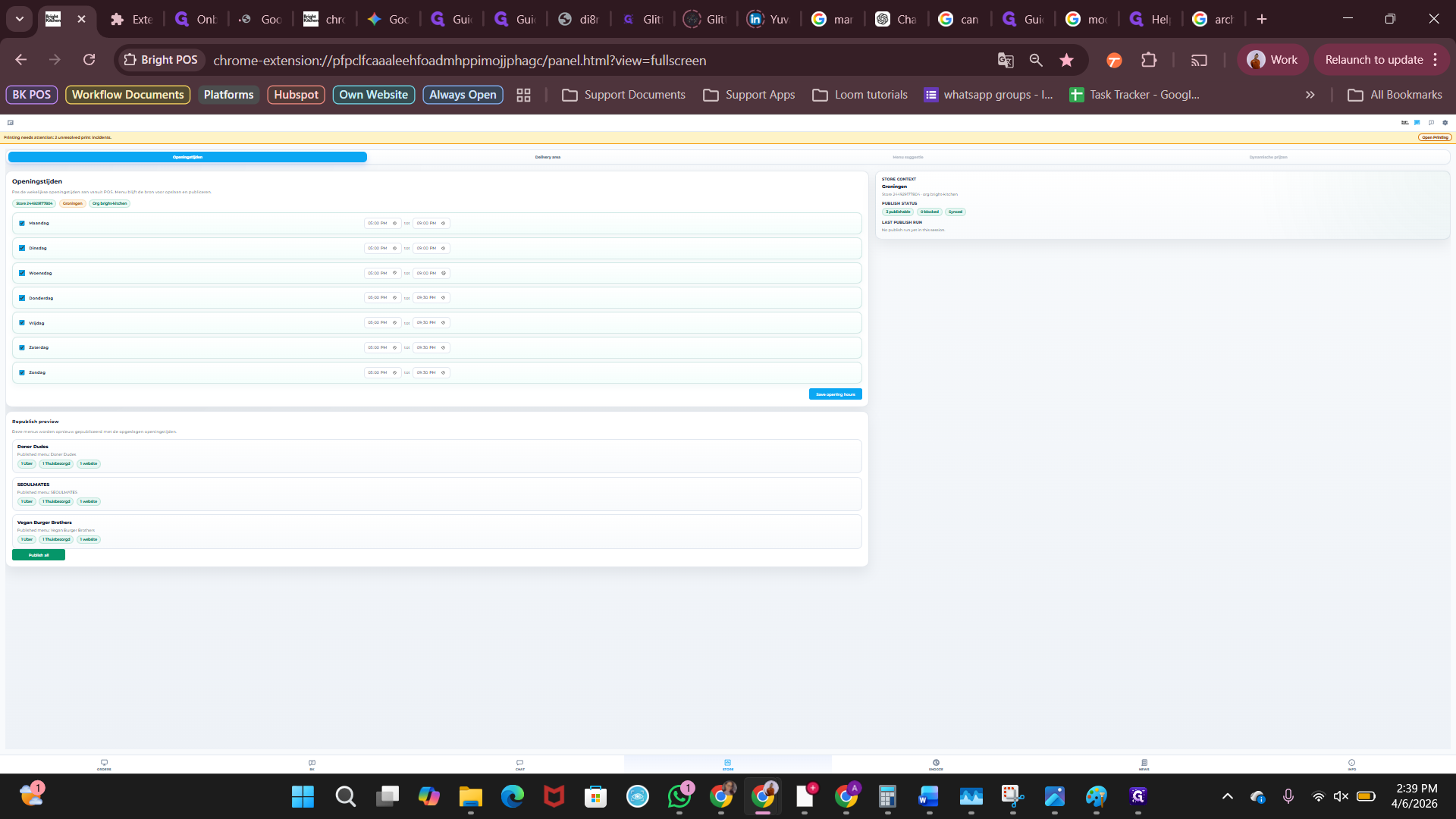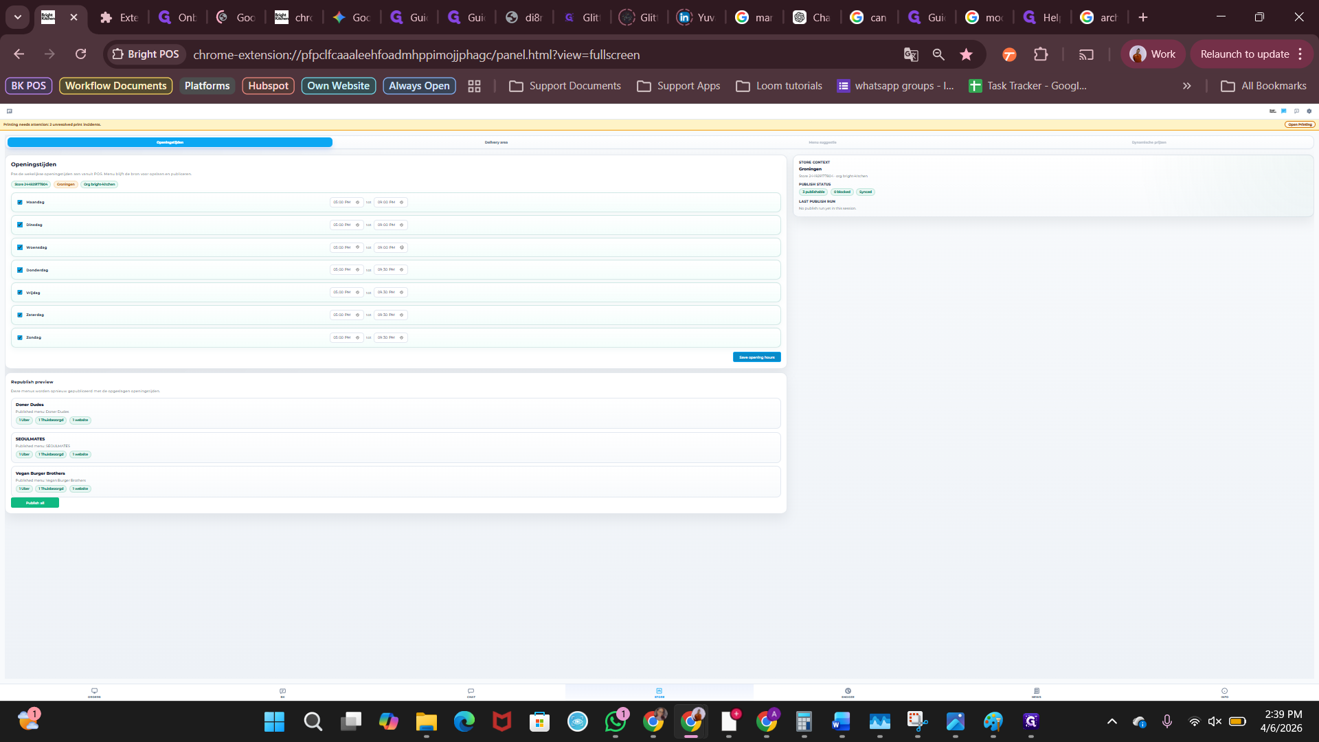 Klik op "publish all" om de openingstijden voor alle brands te publiceren naar de websites.