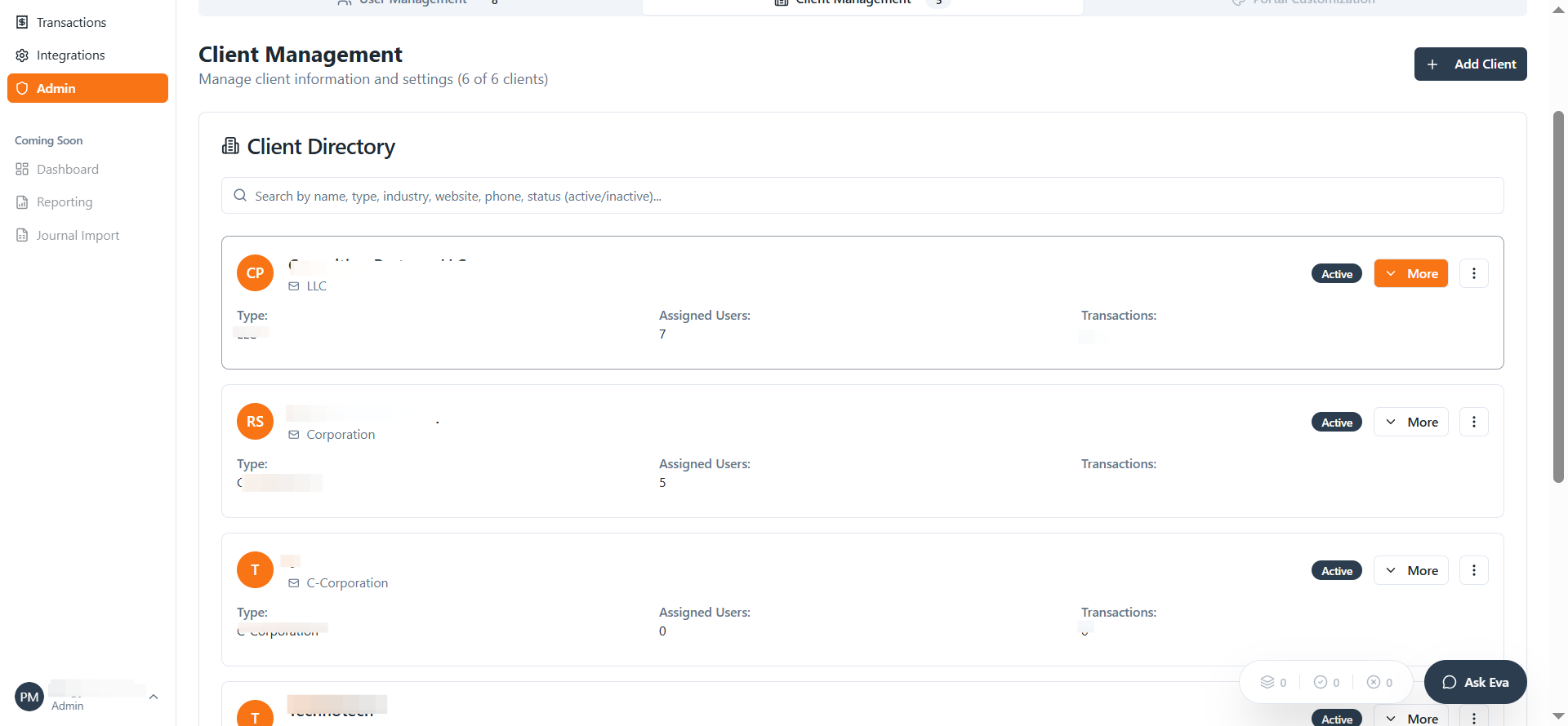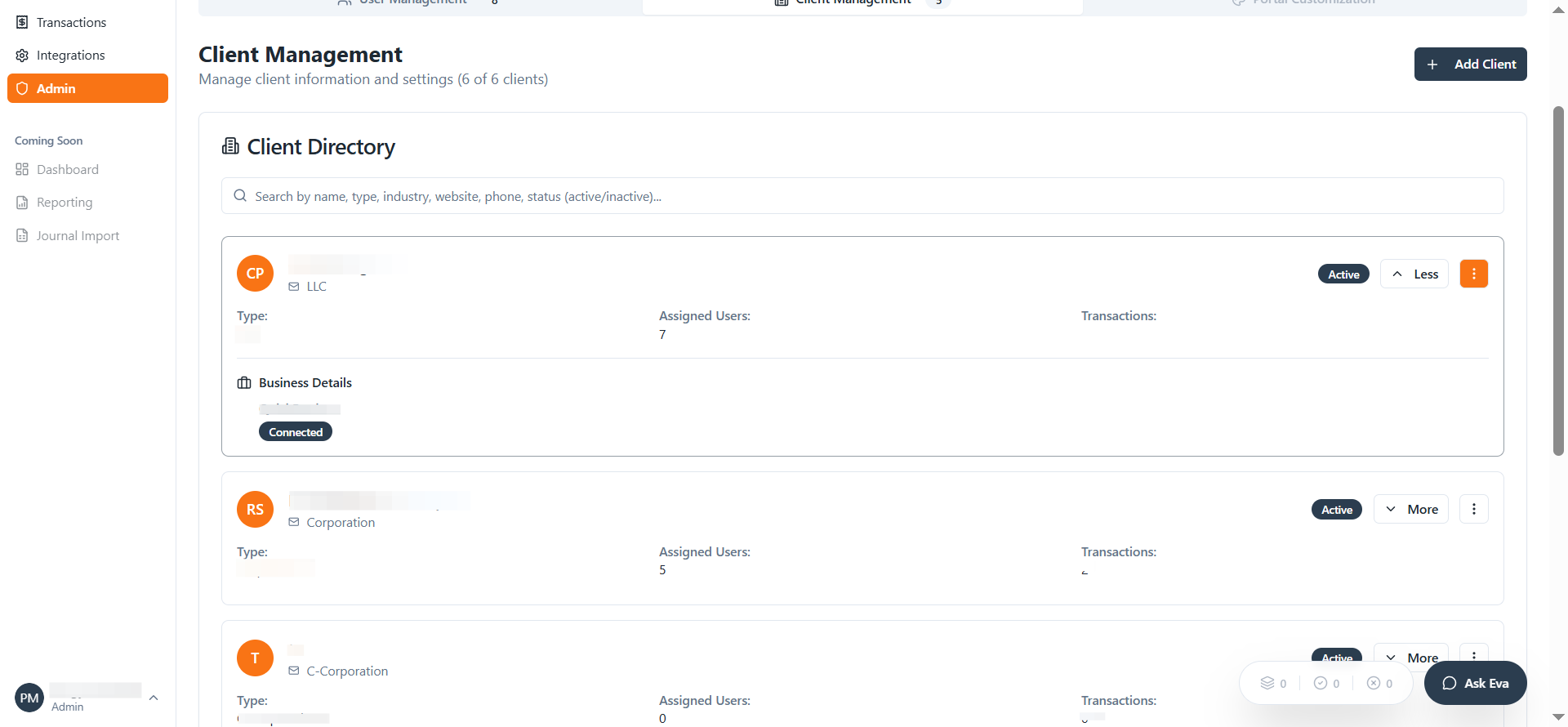 Within Admin Management, you can also access Client Management. This section allows you to view all client details, including the client name.