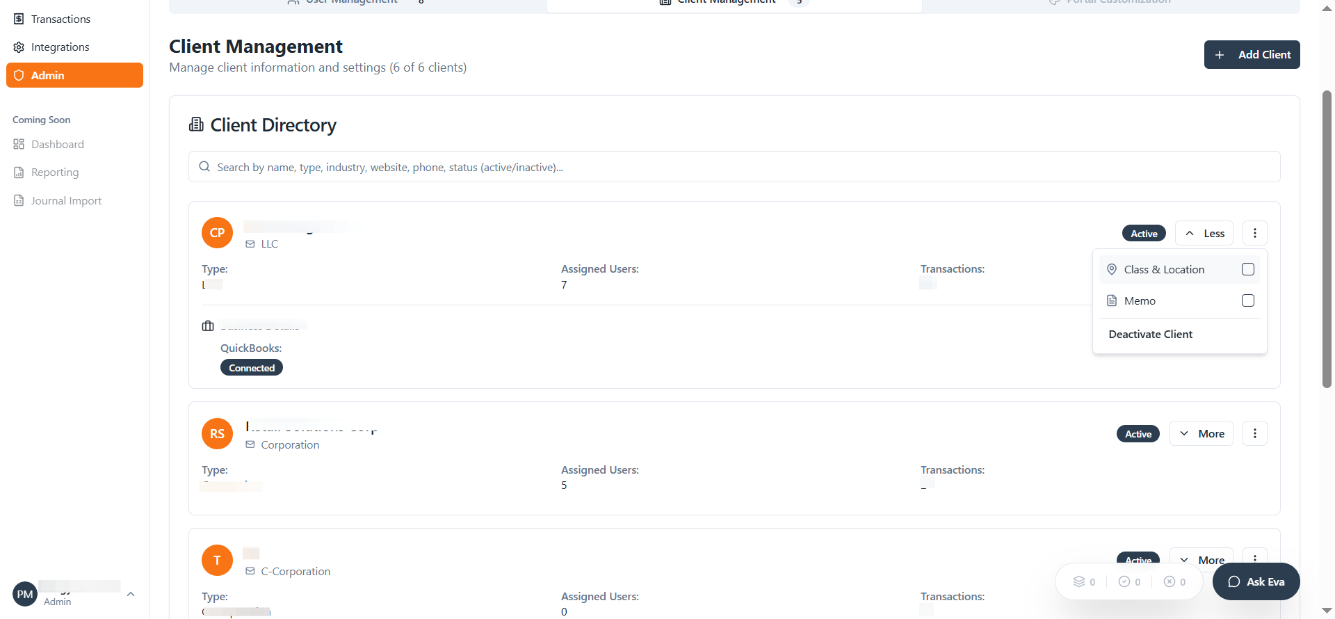Learn how to view, manage, and deactivate clients in the Client Management section under Admin Management. Step-by-step instructions for accessing client details and using management features.