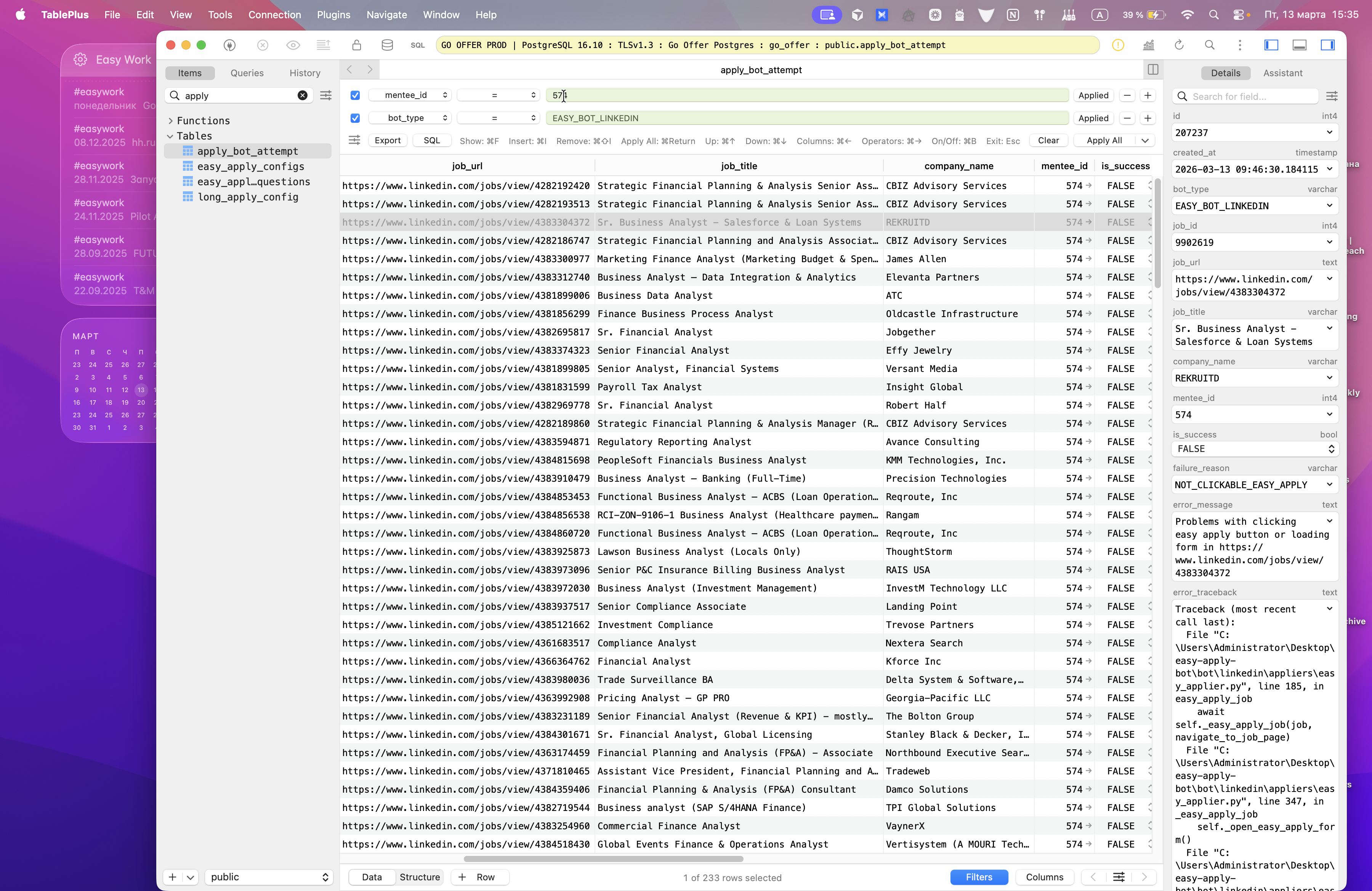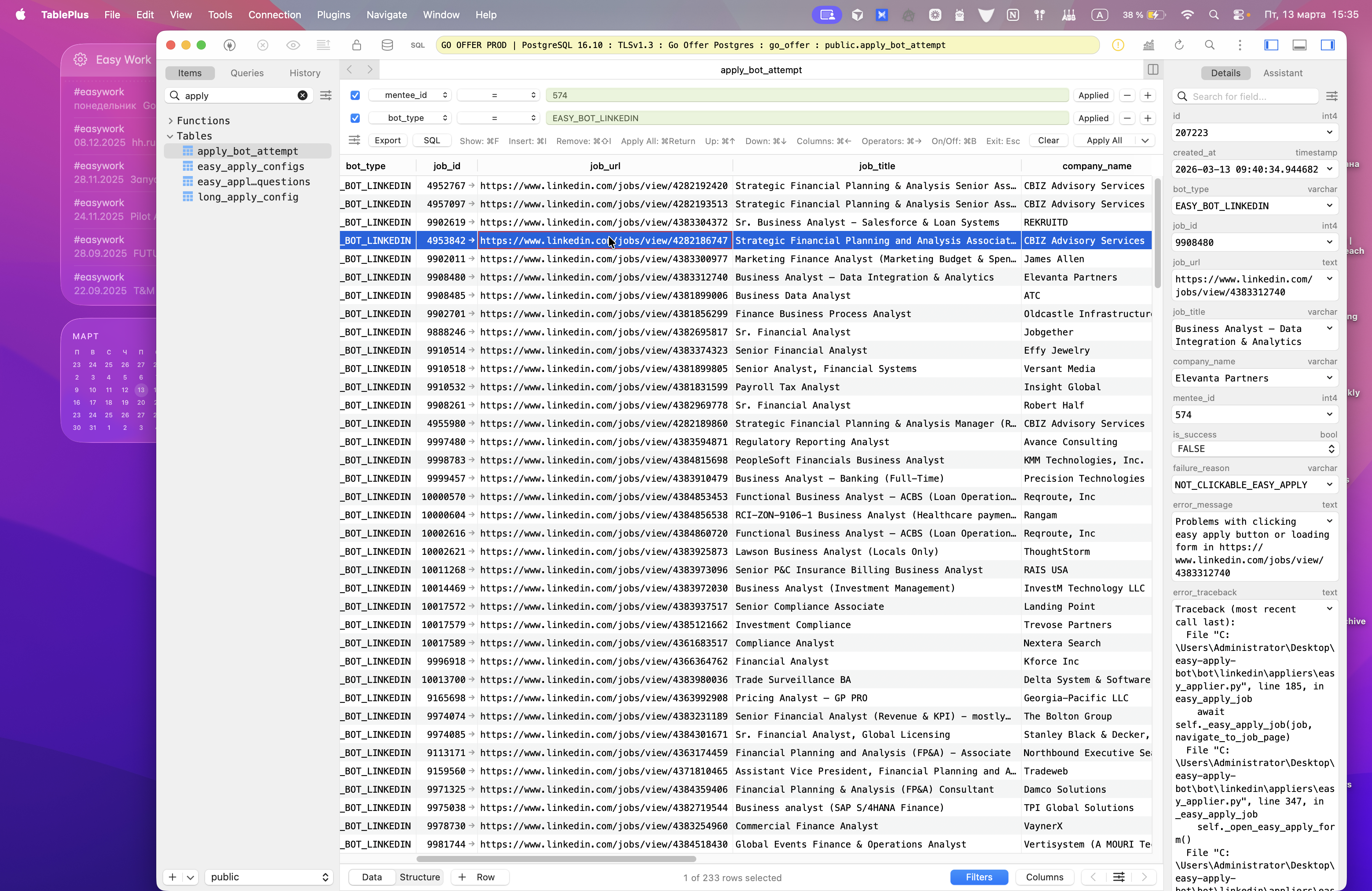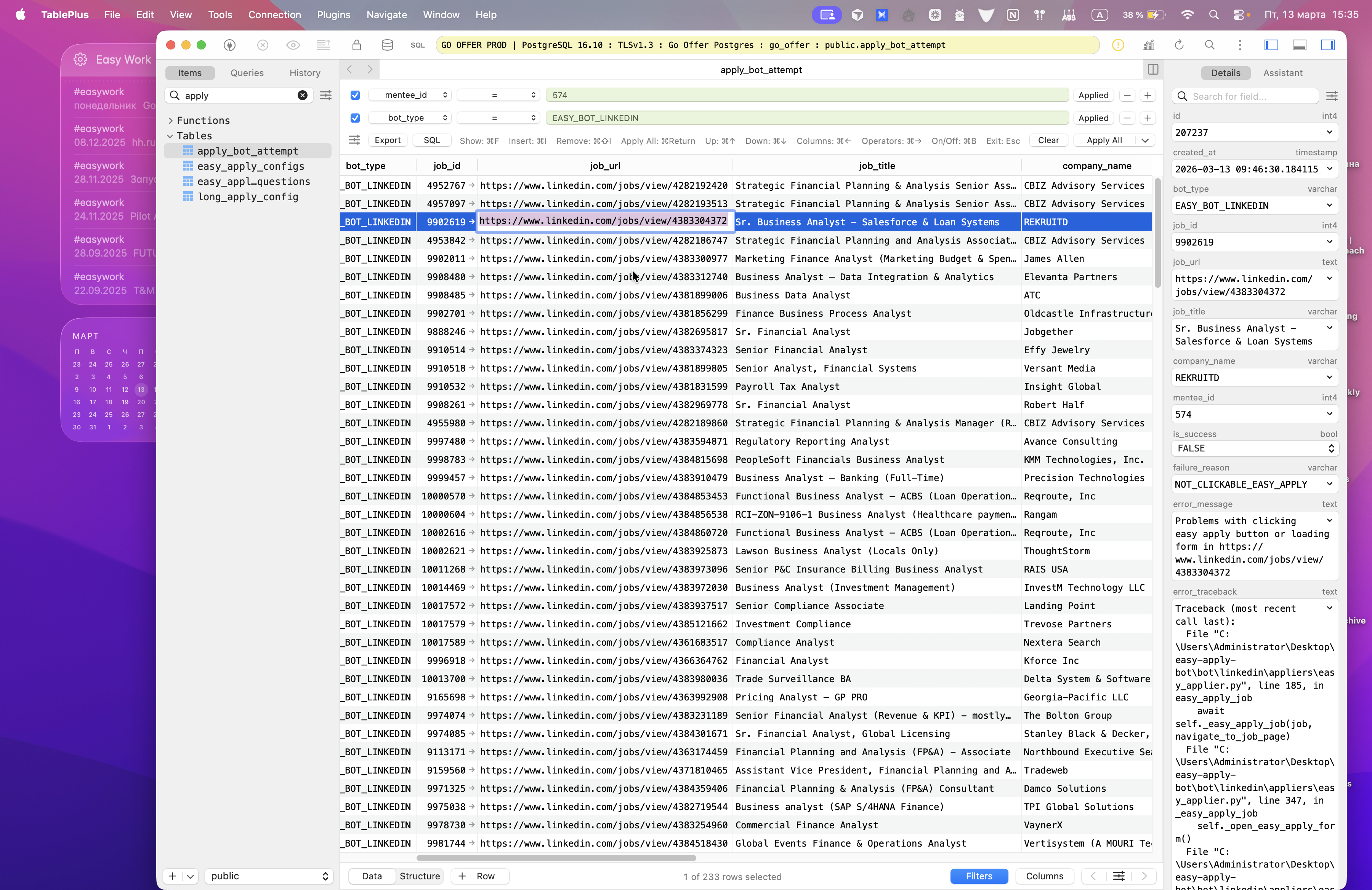 Мы можем выбрать Minty ID и тип бота, чтобы посмотреть причины ошибок. Вот я хочу разобраться, что это такое — not clickable из reapplied. Почему так происходит? Я беру вакансию, затем перехожу в ENV.