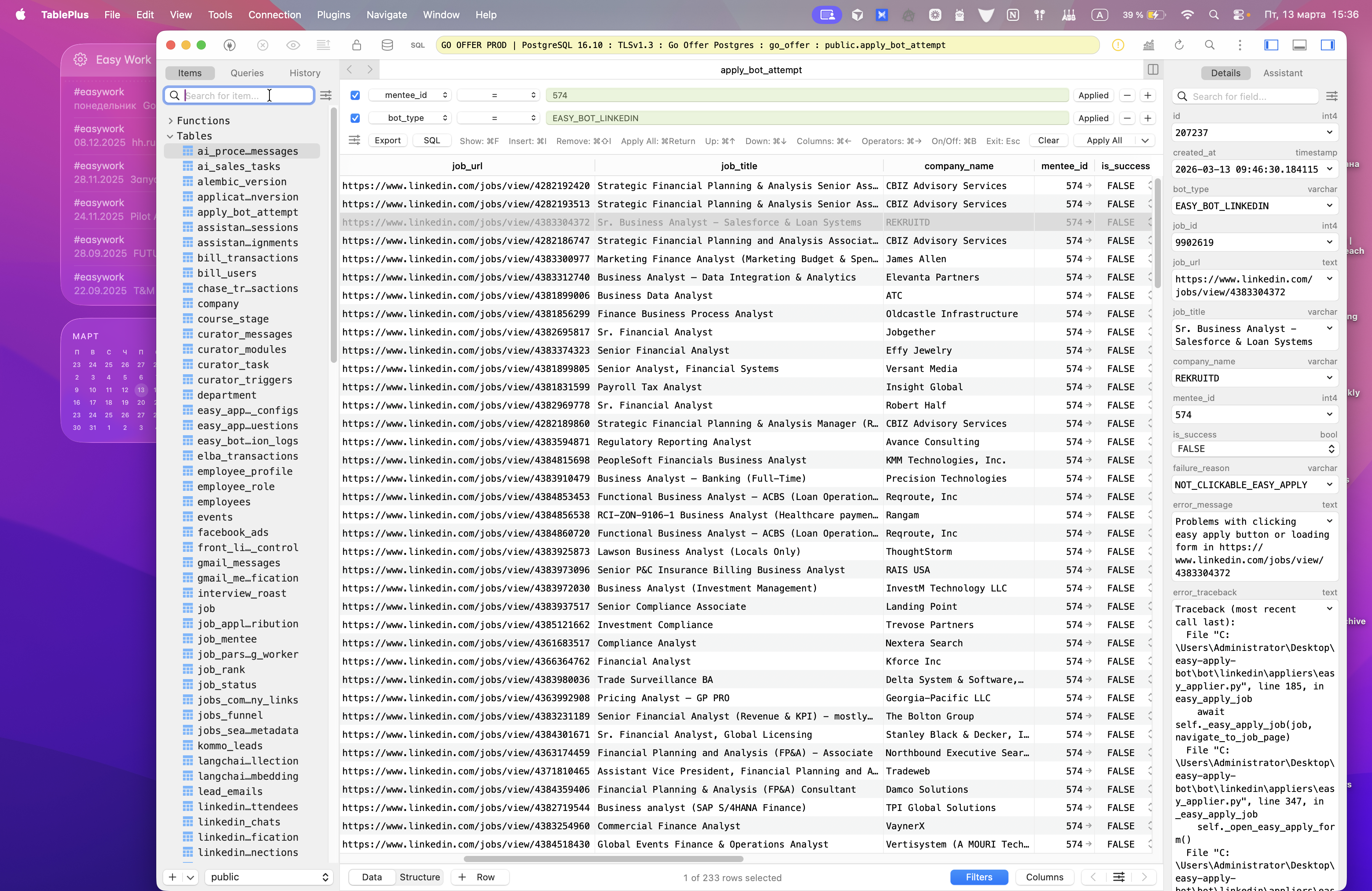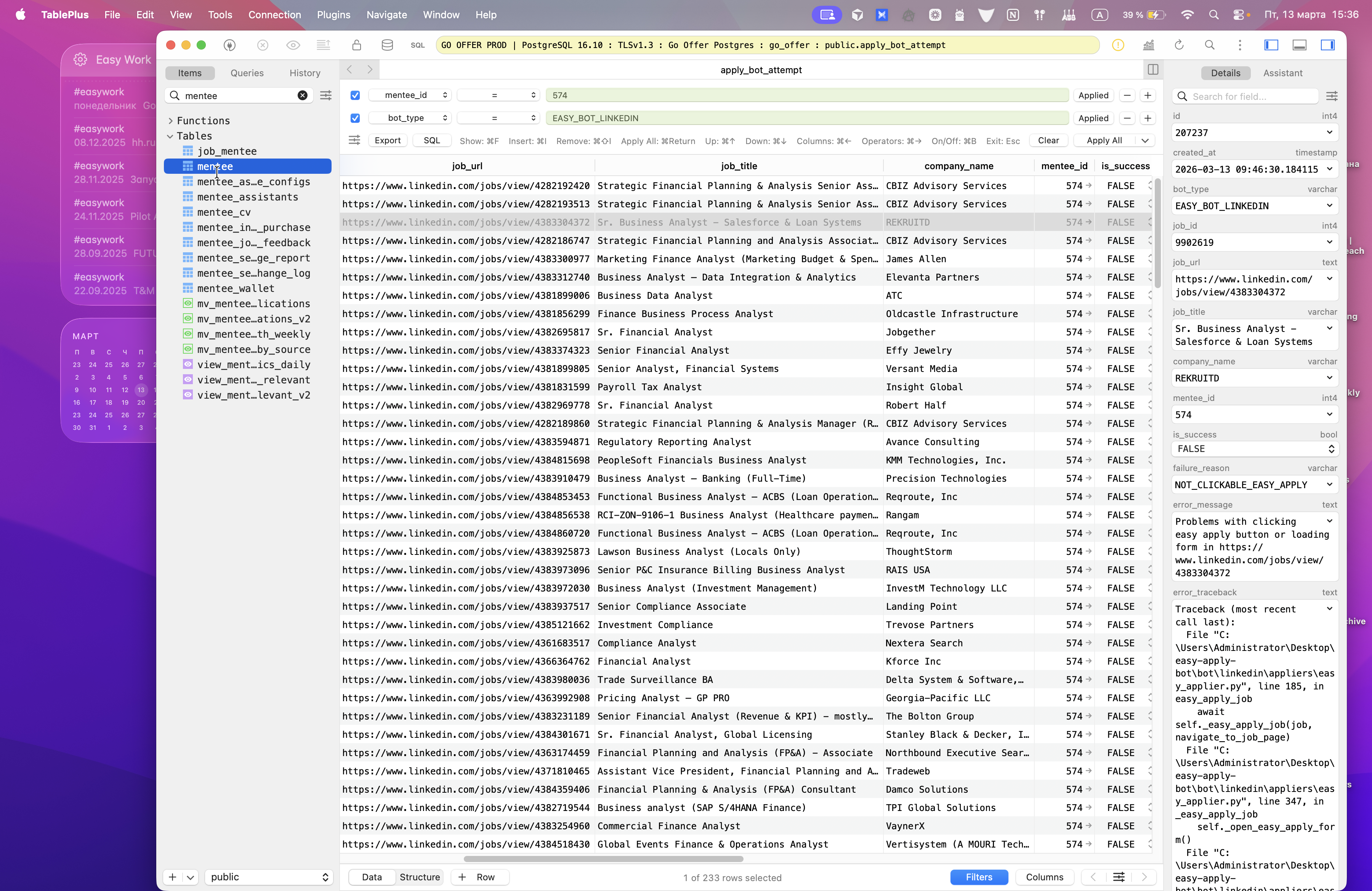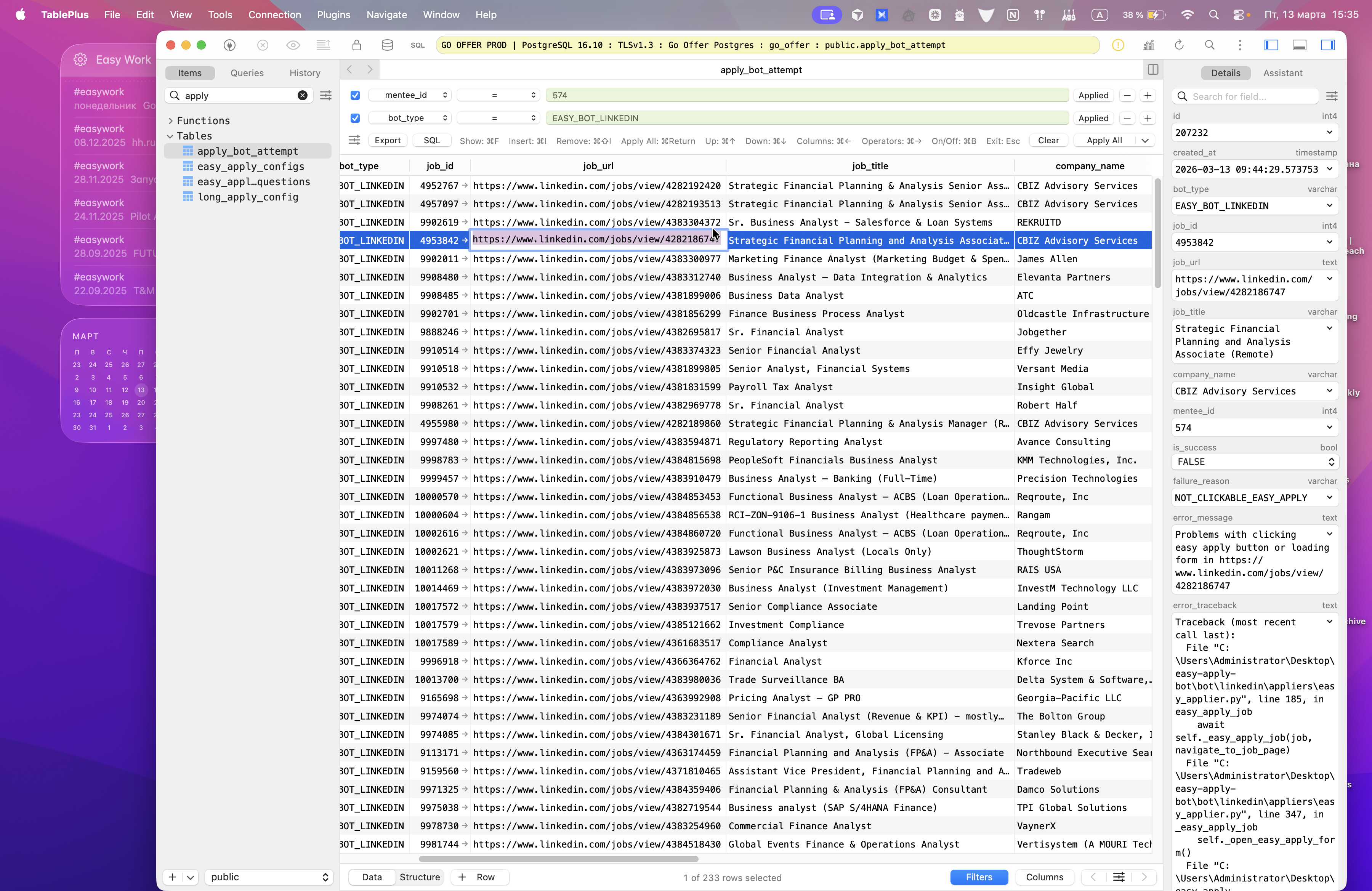Мы можем выбрать Minty ID и тип бота, чтобы посмотреть причины ошибок. Вот я хочу разобраться, что это такое — not clickable из reapplied. Почему так происходит? Я беру вакансию, затем перехожу в ENV.