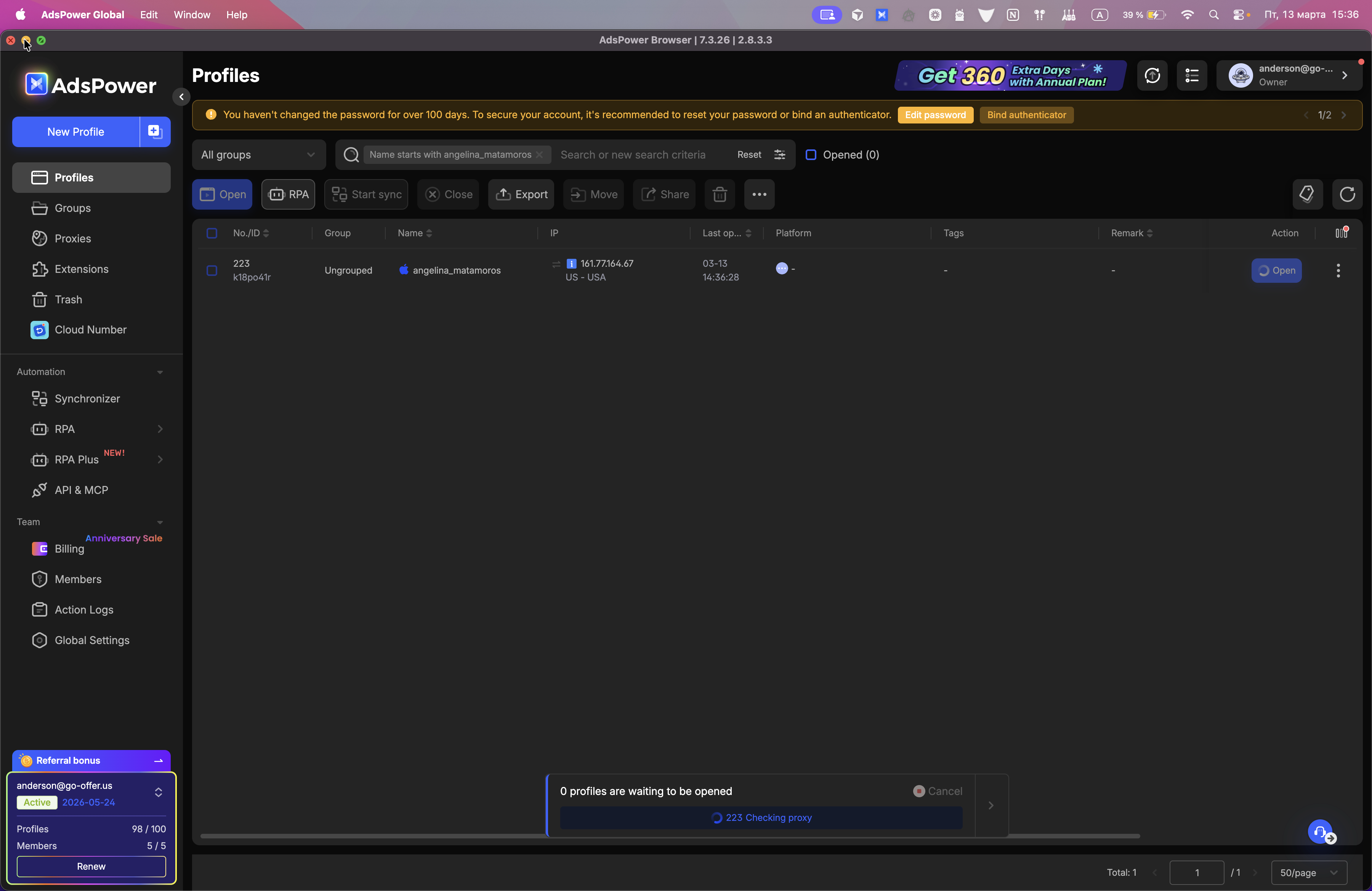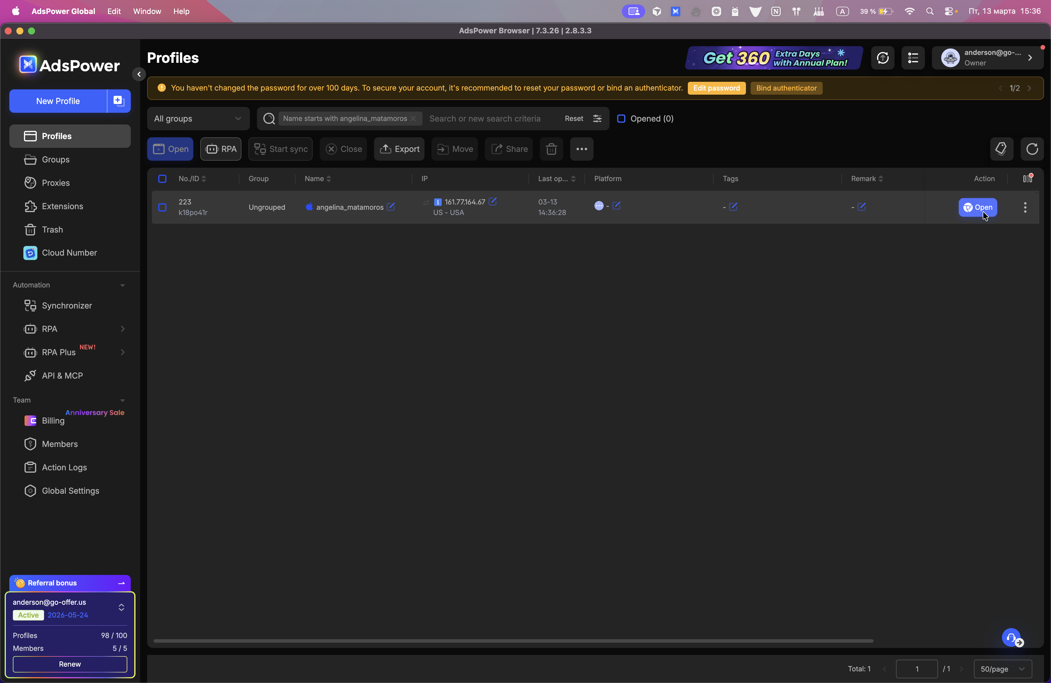 Это наш антидетект-браузер. Откройте профиль клиента, с которым мы будем работать. Мы видим сейчас, что у нас Minty ID 574.